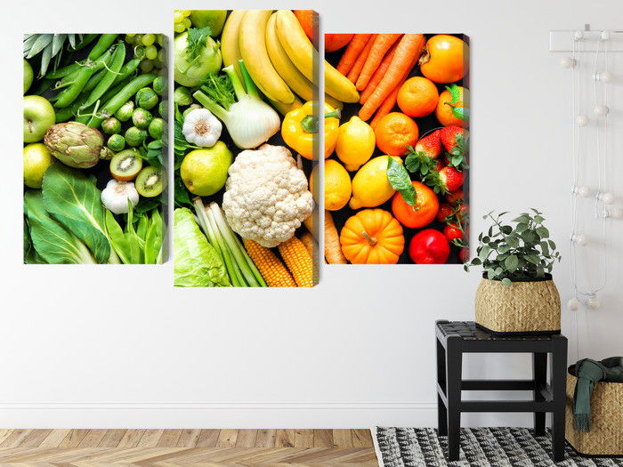 Motivet Fruits and vegetables återges med hög färgprecision och detaljrikedom tack vare HP Latex-teknologi. Trycket sker med vattenbaserade, luktfria och GREENGUARD Gold-certifierade bläck som ger en upplösning på upp till 300 DPI. Färgerna är UV-beständiga och behåller sin styrka även i ljusa rum, vilket gör tavlan lämplig för både hem- och offentliga miljöer.
