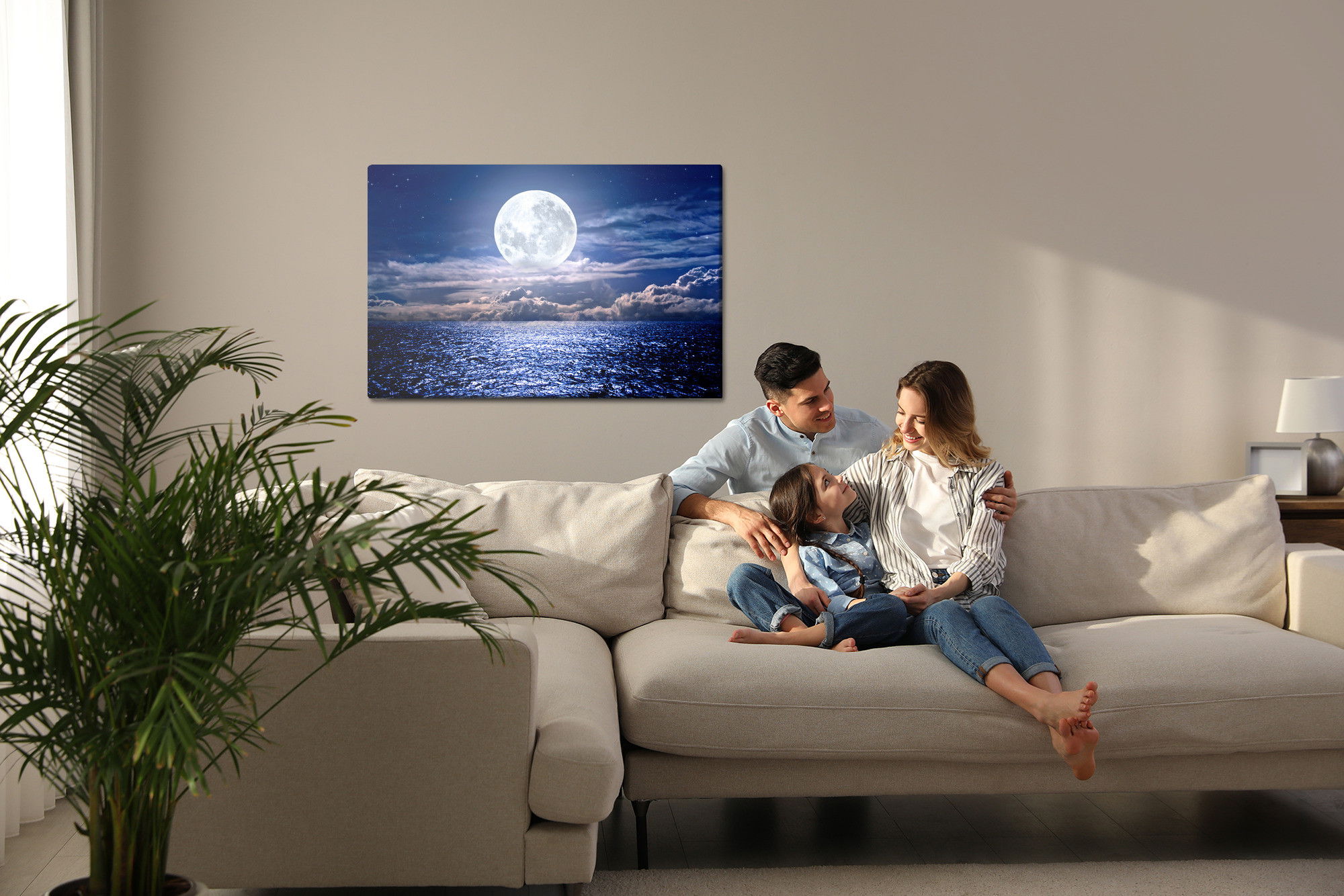 Motivet Full moon on the baltic sea återges med hög färgprecision och detaljrikedom tack vare HP Latex-teknologi. Trycket sker med vattenbaserade, luktfria och GREENGUARD Gold-certifierade bläck som ger en upplösning på upp till 300 DPI. Färgerna är UV-beständiga och behåller sin styrka även i ljusa rum, vilket gör tavlan lämplig för både hem- och offentliga miljöer.