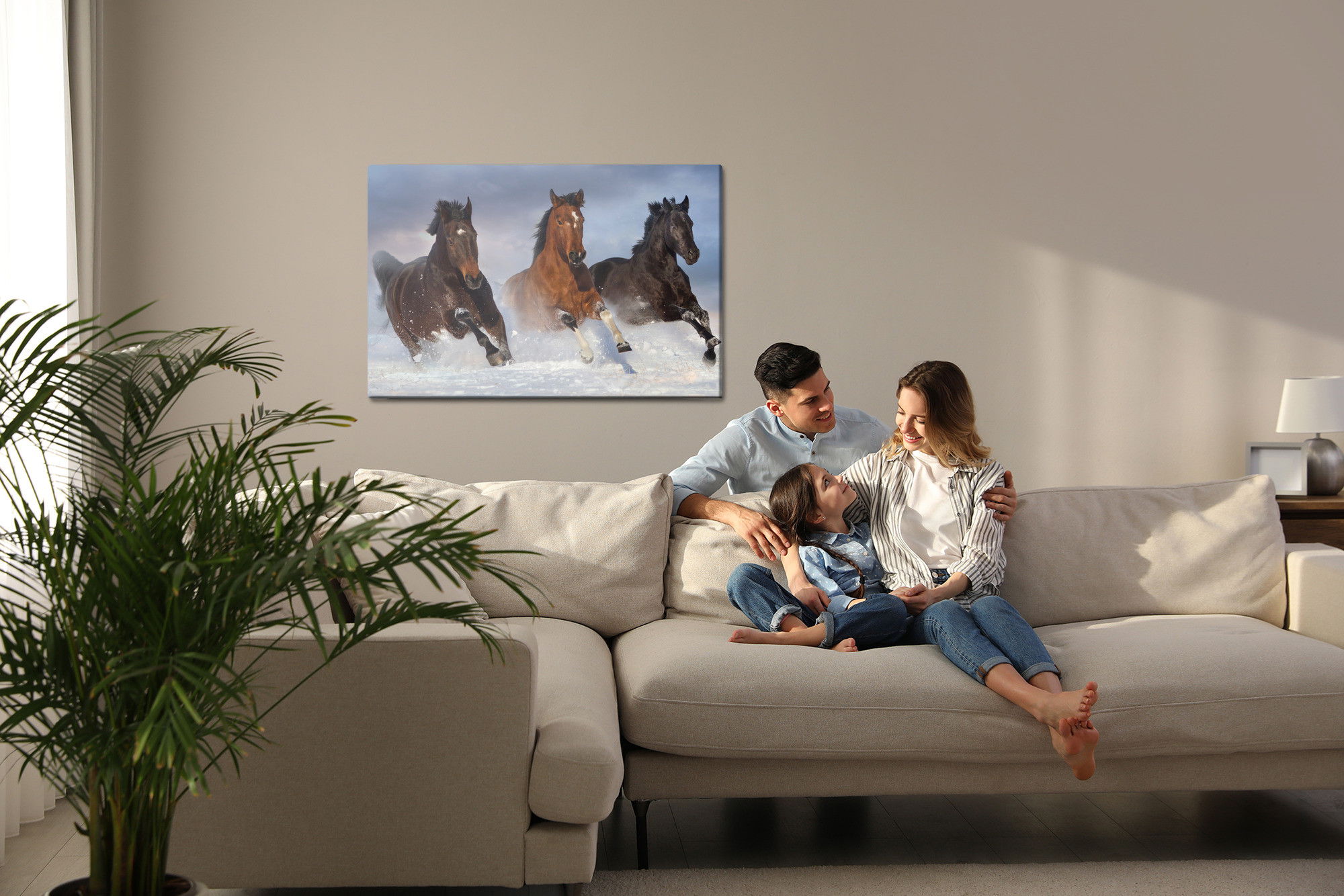 Motivet Galloping horses in winter återges med hög färgprecision och detaljrikedom tack vare HP Latex-teknologi. Trycket sker med vattenbaserade, luktfria och GREENGUARD Gold-certifierade bläck som ger en upplösning på upp till 300 DPI. Färgerna är UV-beständiga och behåller sin styrka även i ljusa rum, vilket gör tavlan lämplig för både hem- och offentliga miljöer.