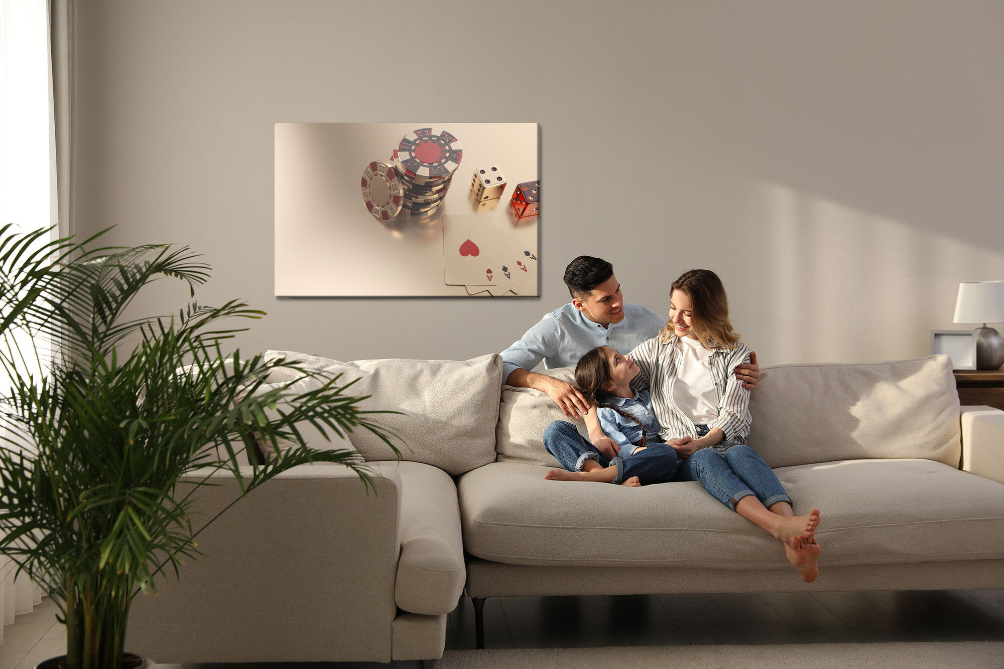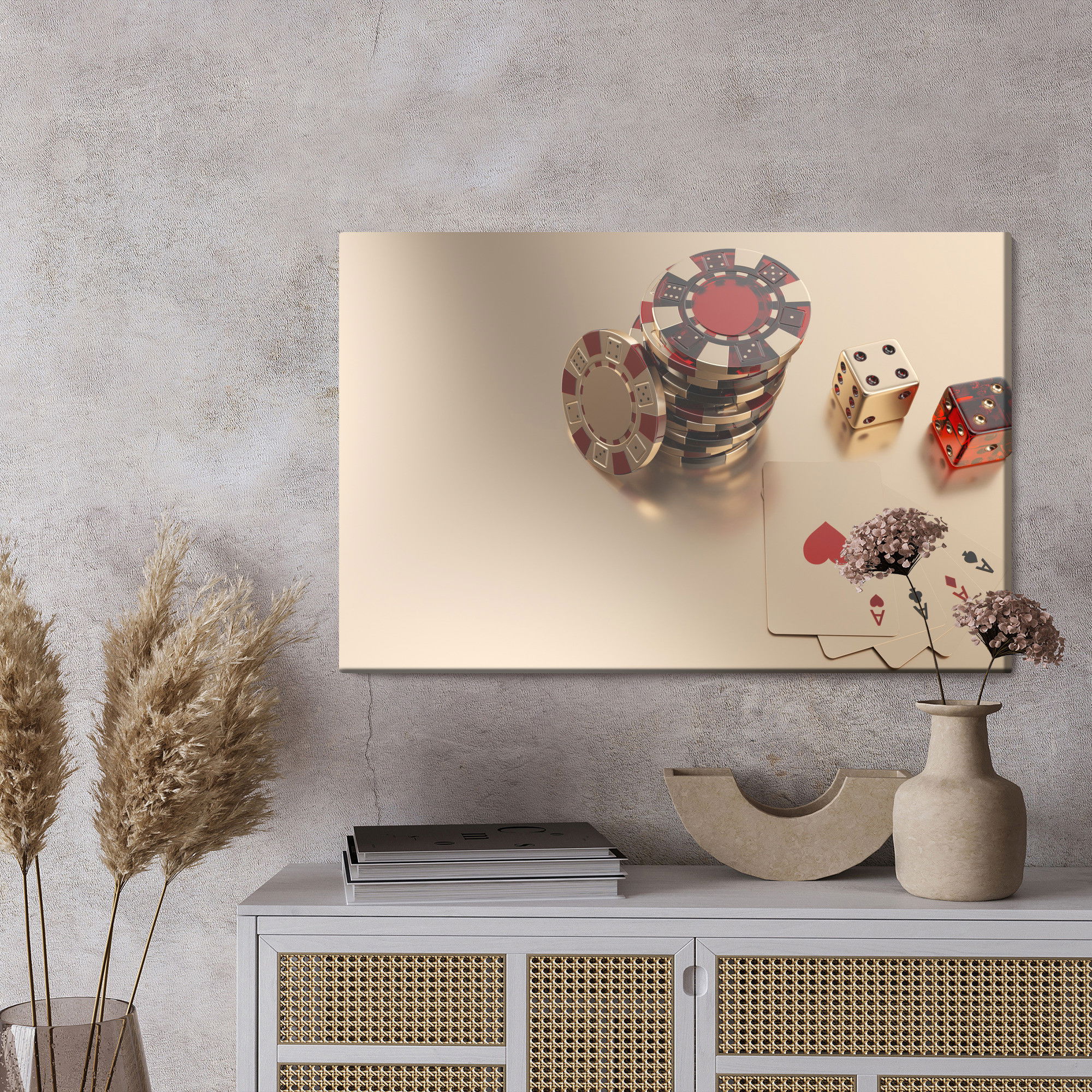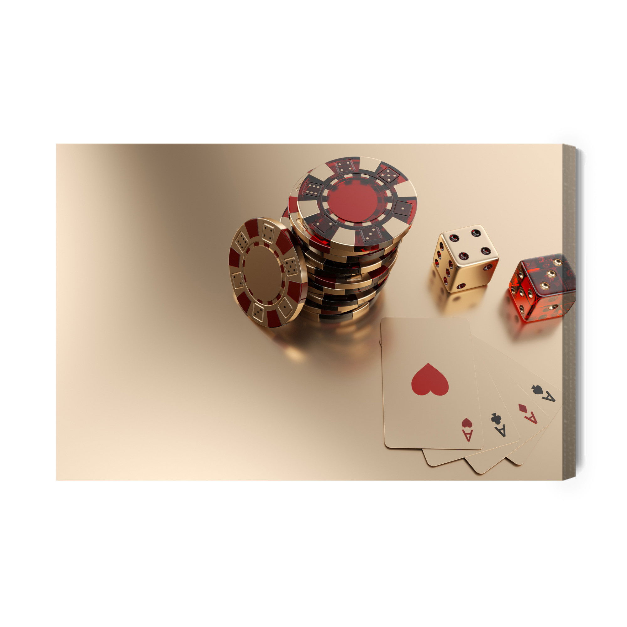 Varje tavla monteras på en massiv fururam. Format upp till 70×50 cm har en ram på 15 mm, medan format från 90×60 cm och uppåt har en ram på 20 mm. Den exakta dukspänningen gör att tavlan håller sin form över tid. Motivet Game chips and dice trycks runt hela ramen vilket ger ett stilrent galleriuttryck där tavlan är lika vacker från sidan som framifrån. Kombinationen av rak dukspänning, rena linjer och korrekt tryck ger en professionell finish.