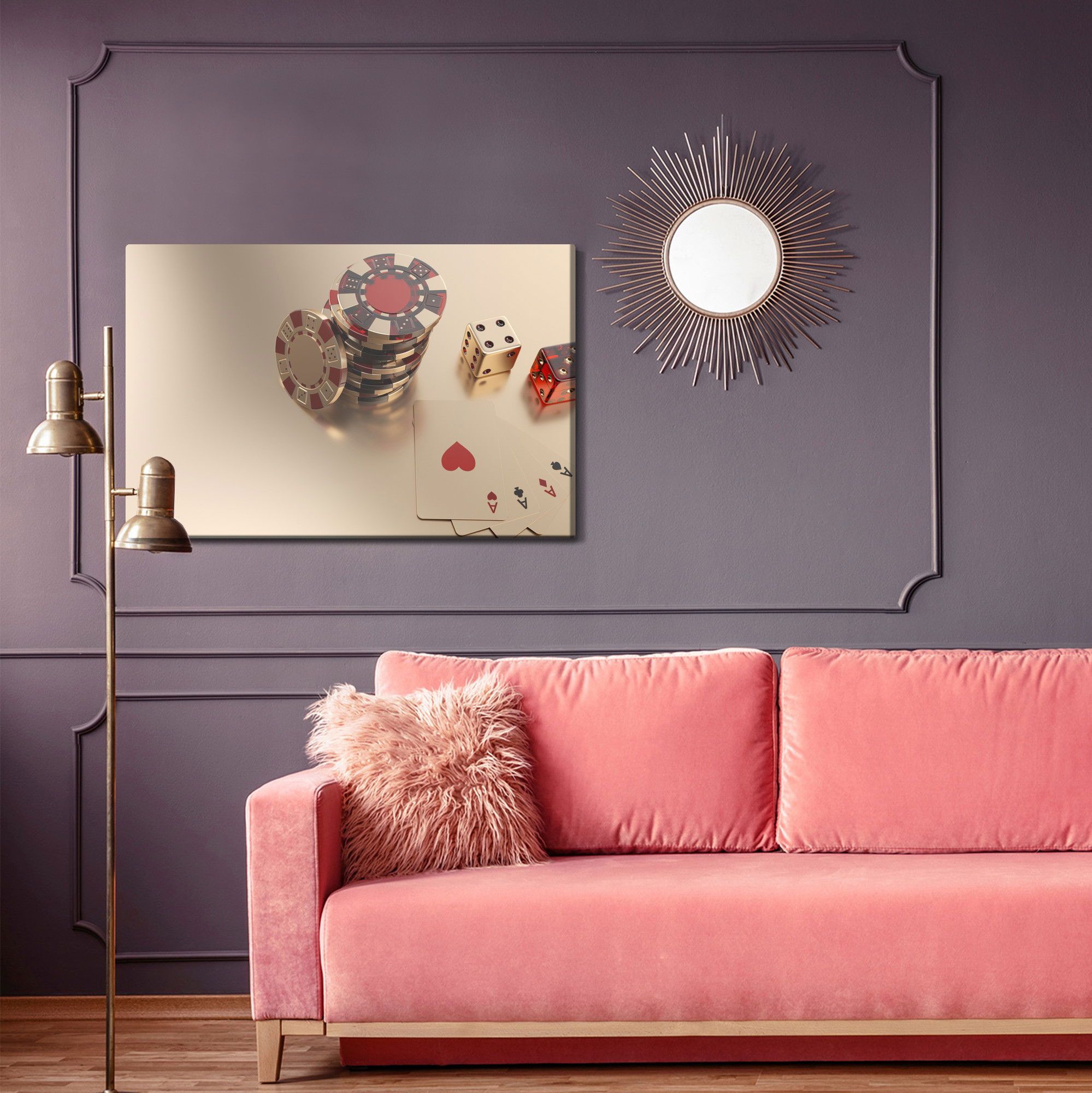 SilentDirects ljuddämpande tavla Game chips and dice kombinerar ett högupplöst motiv med avancerad akustikteknik. Varje tavla monteras i Sverige och bygger på en stabil canvastavla med fururam, där insidan av ramen fylls med en ljudabsorberande kärna av återvunnen polyester. Konstruktionen gör tavlan till ett både estetiskt och funktionellt inslag i rummet.