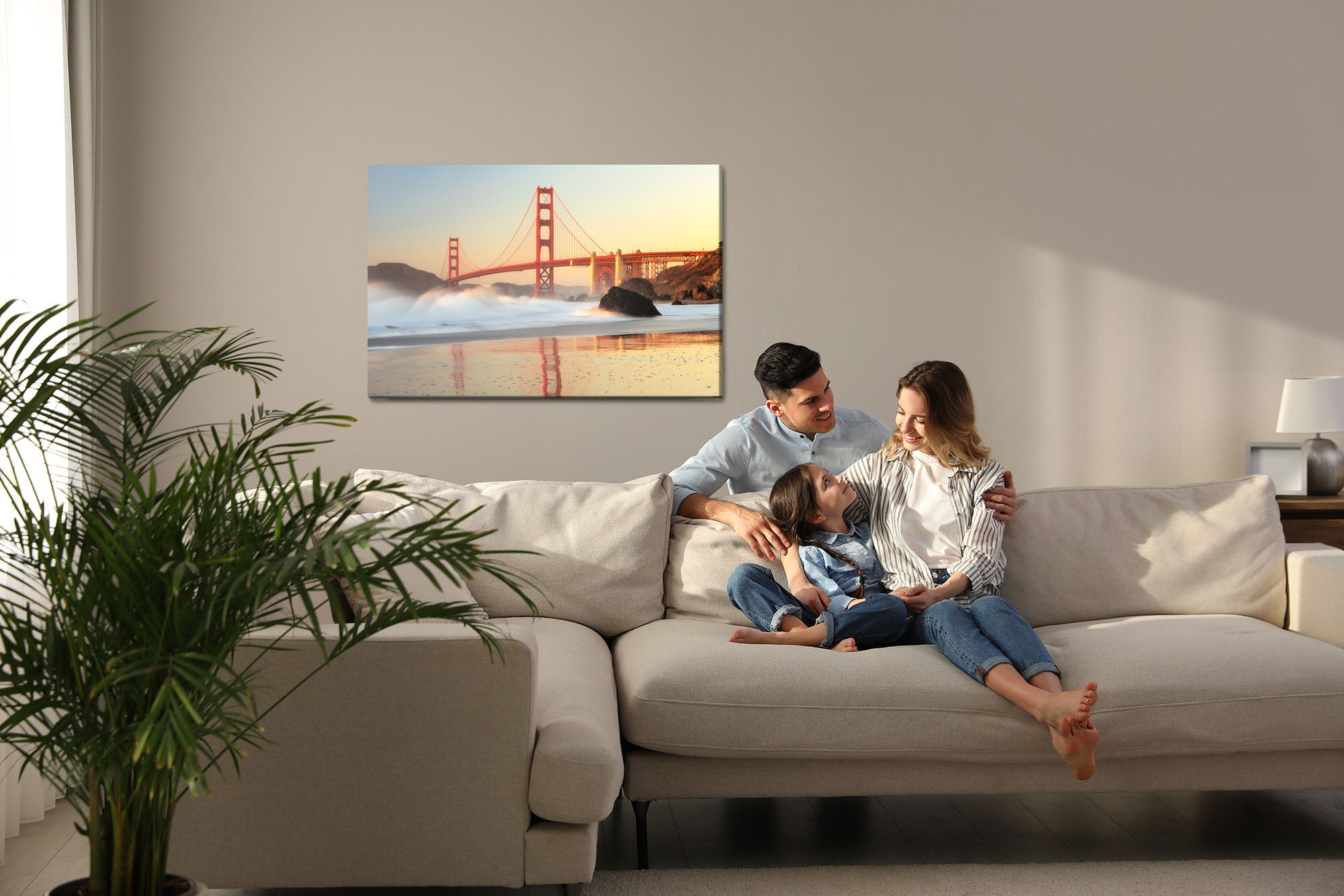 Varje tavla monteras på en massiv fururam. Format upp till 70×50 cm har en ram på 15 mm, medan format från 90×60 cm och uppåt har en ram på 20 mm. Den exakta dukspänningen gör att tavlan håller sin form över tid. Motivet Golden Gate bridge trycks runt hela ramen vilket ger ett stilrent galleriuttryck där tavlan är lika vacker från sidan som framifrån. Kombinationen av rak dukspänning, rena linjer och korrekt tryck ger en professionell finish.