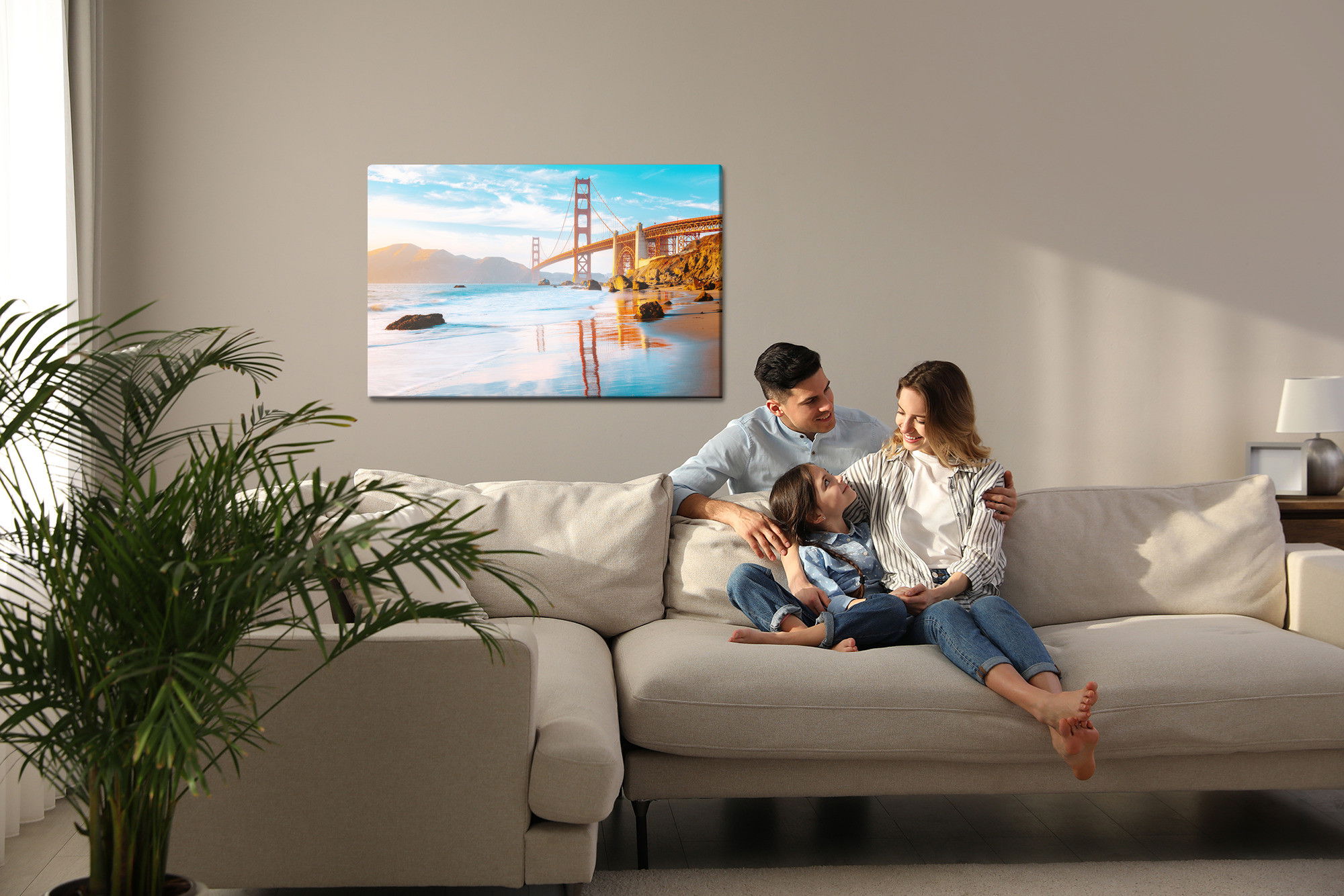 Varje tavla monteras på en massiv fururam. Format upp till 70×50 cm har en ram på 15 mm, medan format från 90×60 cm och uppåt har en ram på 20 mm. Den exakta dukspänningen gör att tavlan håller sin form över tid. Motivet Golden Gate bridge trycks runt hela ramen vilket ger ett stilrent galleriuttryck där tavlan är lika vacker från sidan som framifrån. Kombinationen av rak dukspänning, rena linjer och korrekt tryck ger en professionell finish.