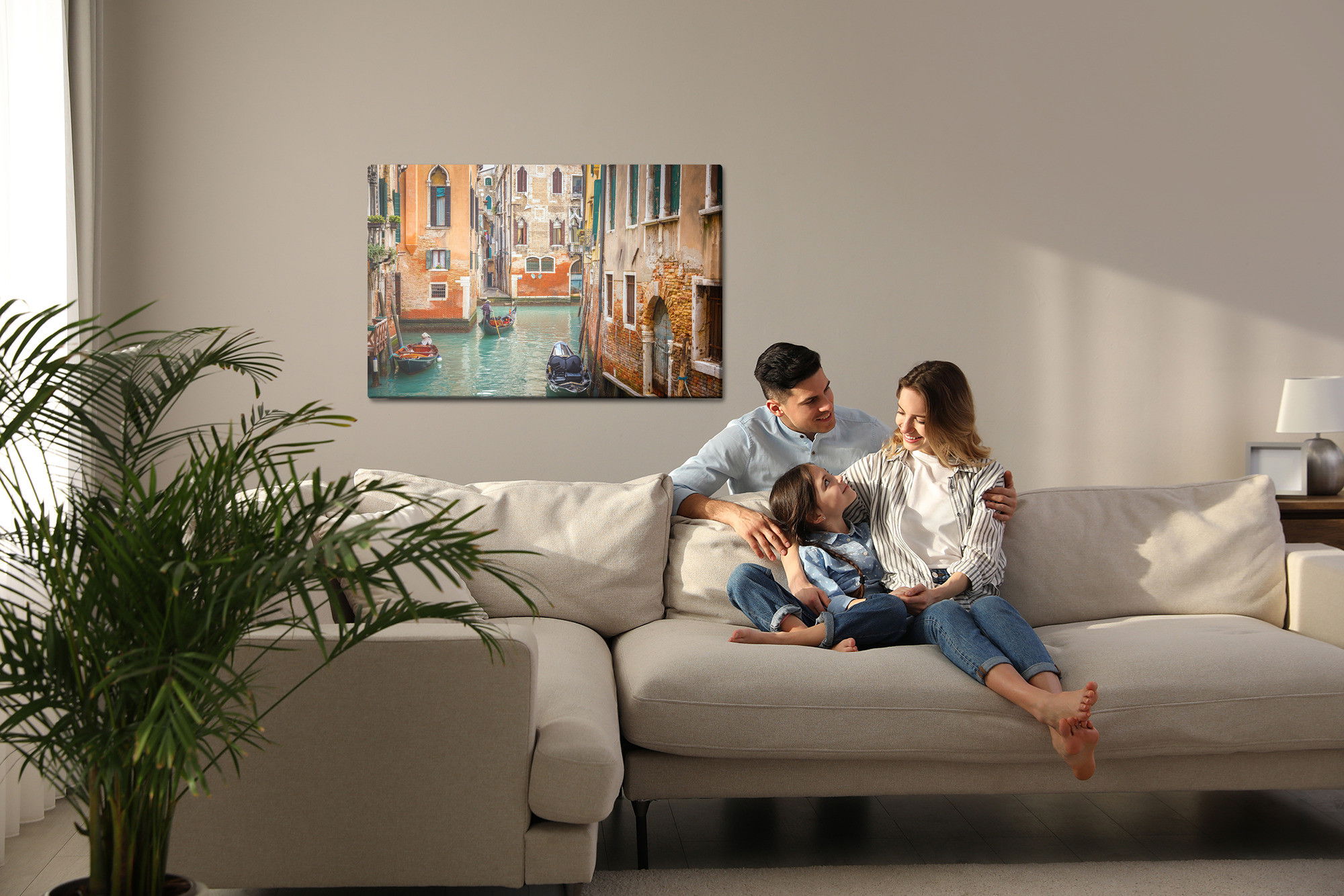 Motivet Gondolas in venice återges med hög färgprecision och detaljrikedom tack vare HP Latex-teknologi. Trycket sker med vattenbaserade, luktfria och GREENGUARD Gold-certifierade bläck som ger en upplösning på upp till 300 DPI. Färgerna är UV-beständiga och behåller sin styrka även i ljusa rum, vilket gör tavlan lämplig för både hem- och offentliga miljöer.