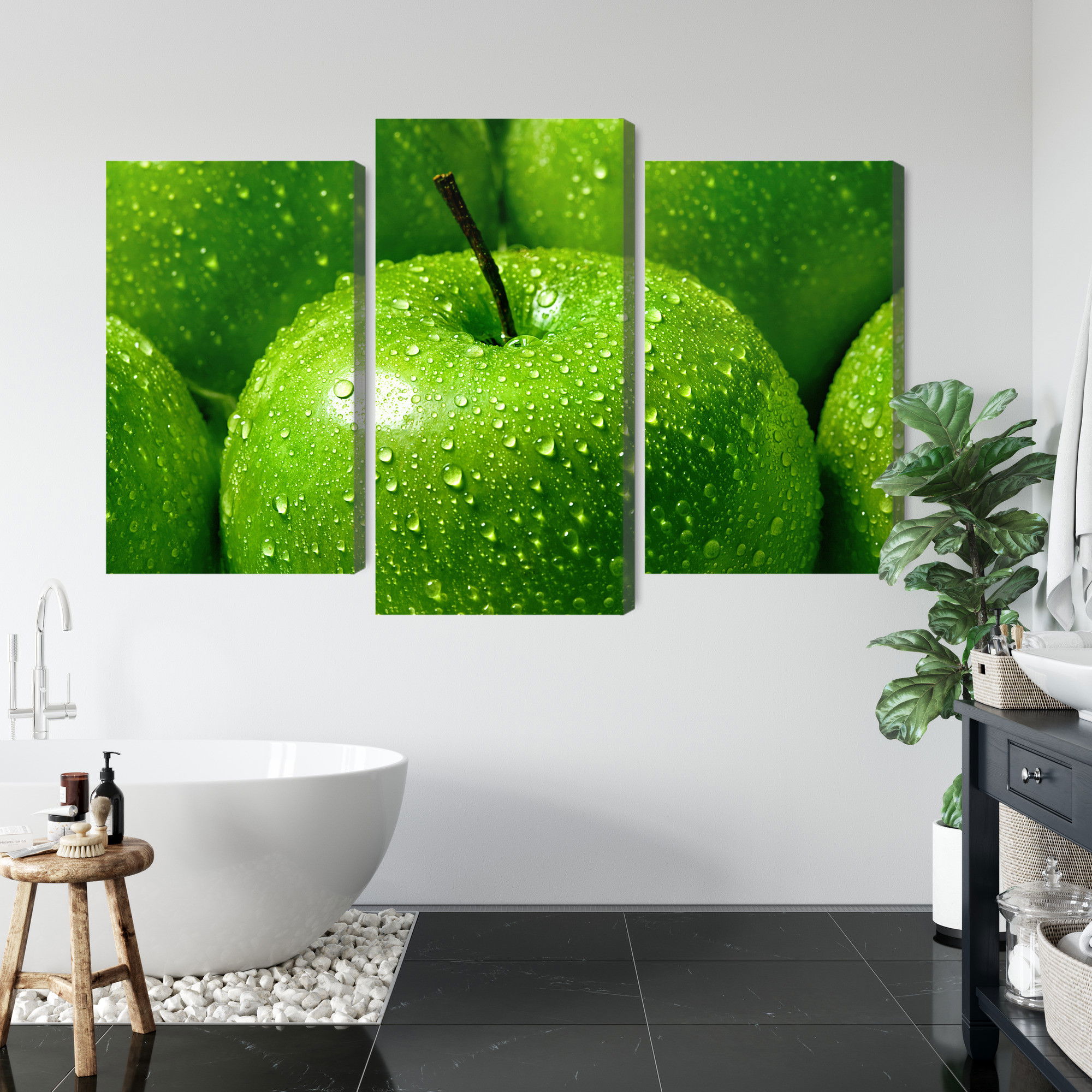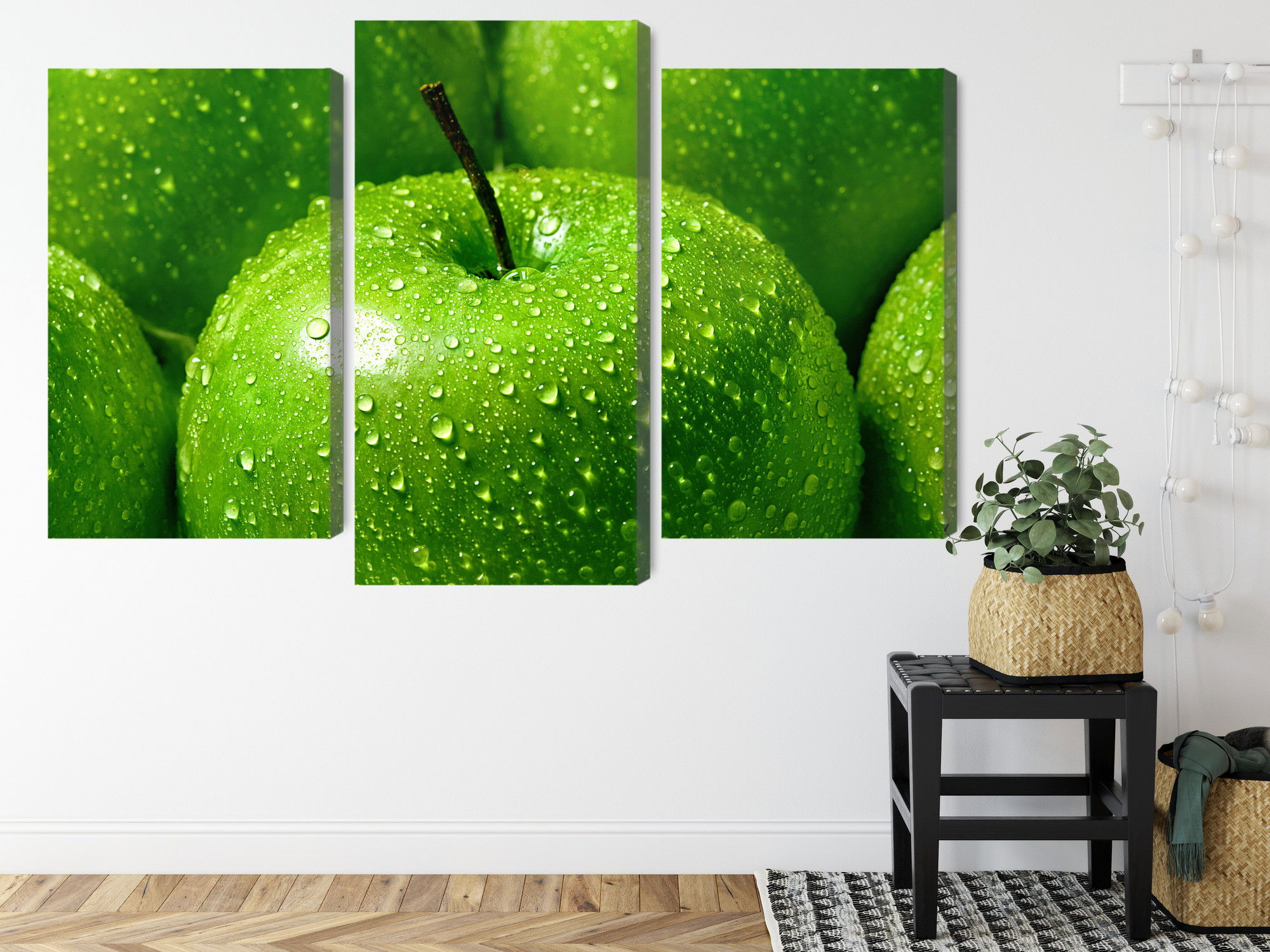 Varje tavla monteras på en massiv fururam. Format upp till 70×50 cm har en ram på 15 mm, medan format från 90×60 cm och uppåt har en ram på 20 mm. Den exakta dukspänningen gör att tavlan håller sin form över tid. Motivet Green apples on a macro scale trycks runt hela ramen vilket ger ett stilrent galleriuttryck där tavlan är lika vacker från sidan som framifrån. Kombinationen av rak dukspänning, rena linjer och korrekt tryck ger en professionell finish.