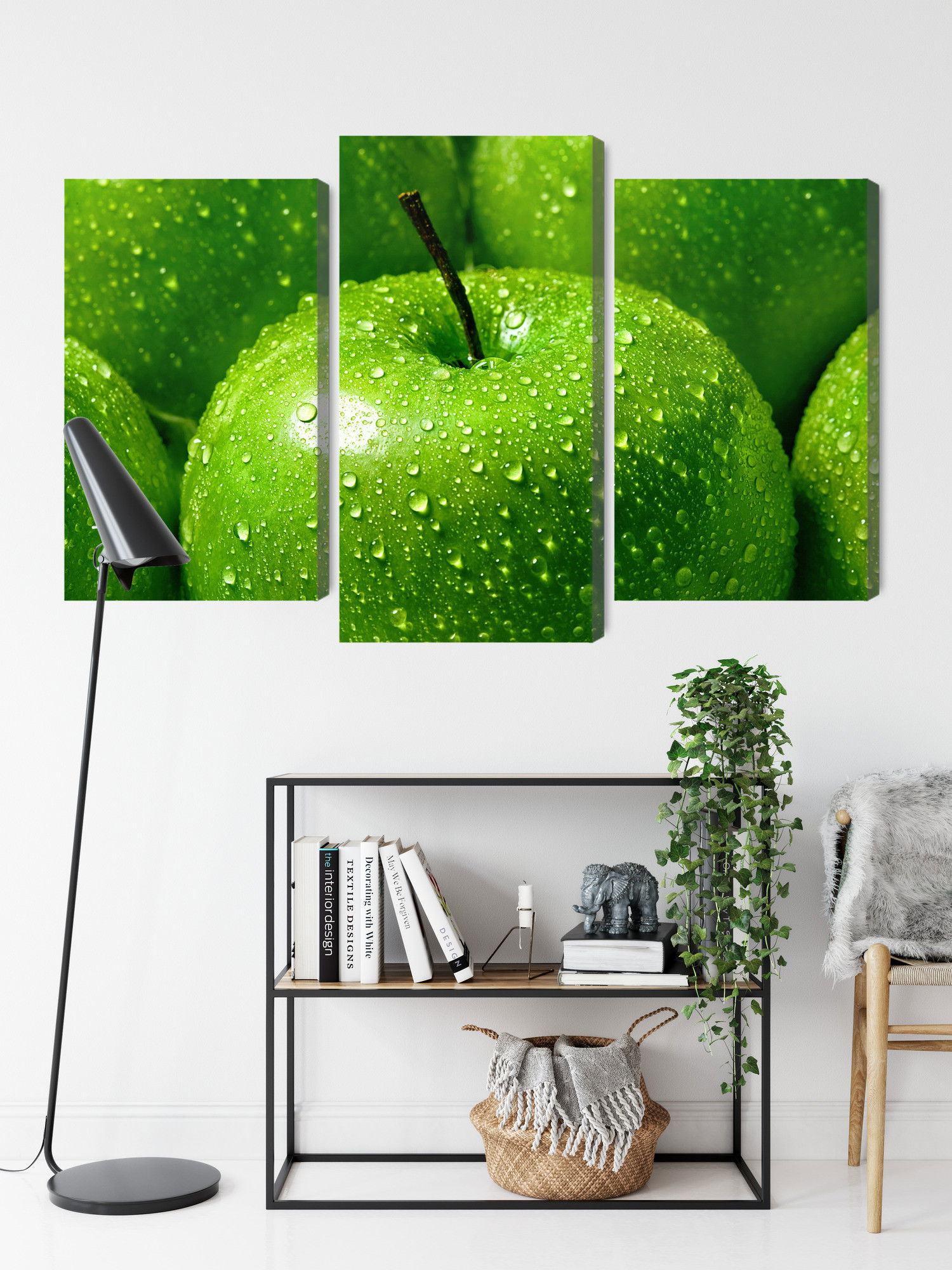 SilentDirects ljuddämpande tavla Green apples on a macro scale kombinerar ett högupplöst motiv med avancerad akustikteknik. Varje tavla monteras i Sverige och bygger på en stabil canvastavla med fururam, där insidan av ramen fylls med en ljudabsorberande kärna av återvunnen polyester. Konstruktionen gör tavlan till ett både estetiskt och funktionellt inslag i rummet.