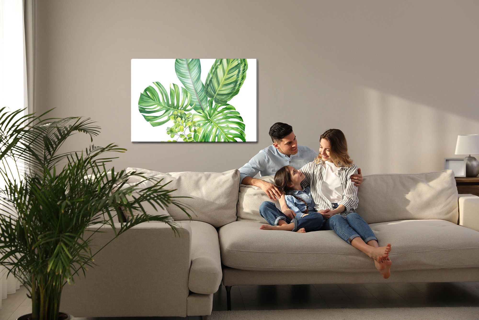 Varje tavla monteras på en massiv fururam. Format upp till 70×50 cm har en ram på 15 mm, medan format från 90×60 cm och uppåt har en ram på 20 mm. Den exakta dukspänningen gör att tavlan håller sin form över tid. Motivet Green exotic leaves painted trycks runt hela ramen vilket ger ett stilrent galleriuttryck där tavlan är lika vacker från sidan som framifrån. Kombinationen av rak dukspänning, rena linjer och korrekt tryck ger en professionell finish.