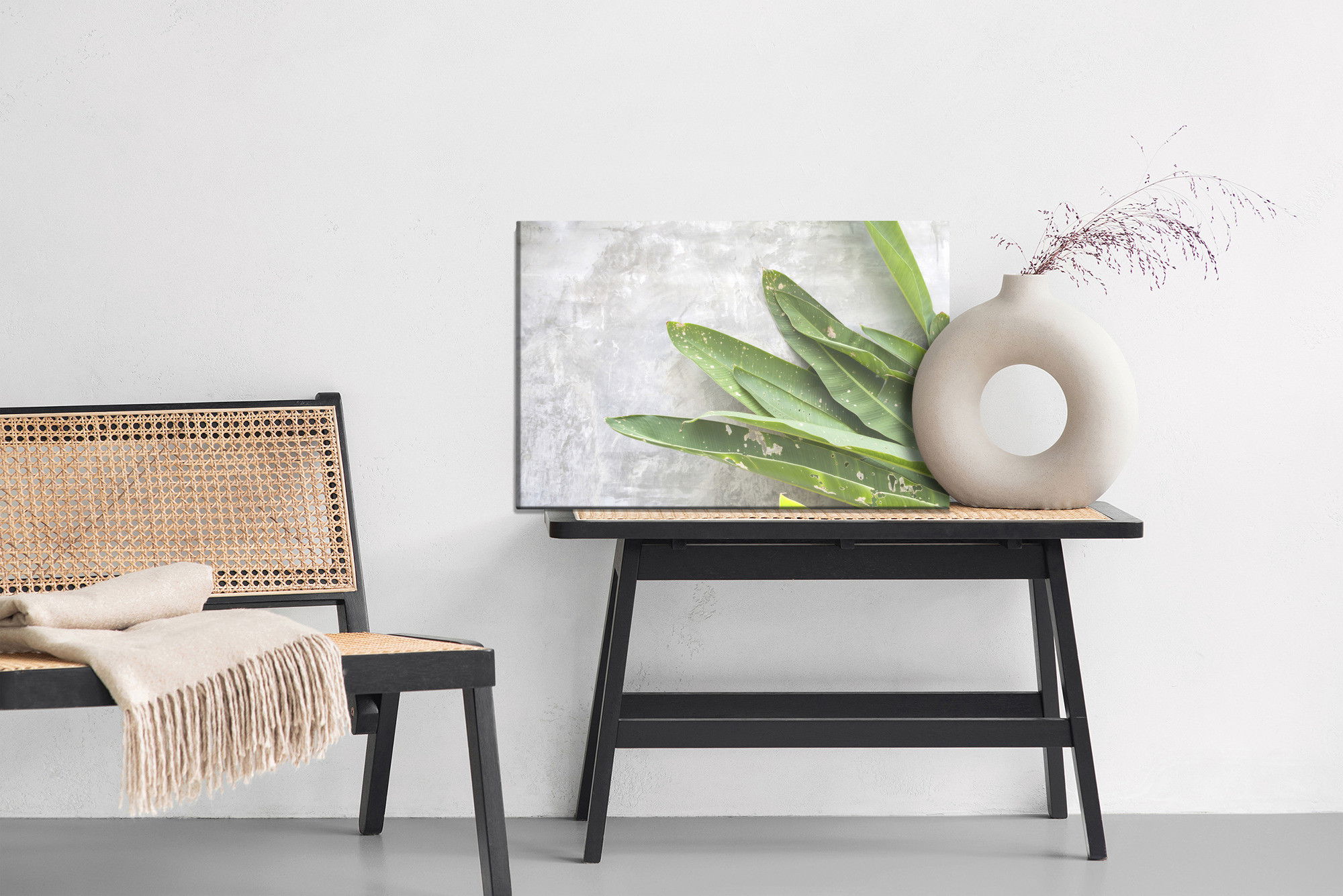 Med SilentDirects ljuddämpande tavla Green leaves on a concrete får du både ett stilrent motiv och en akustisk lösning i samma produkt. Tavlan byggs i Sverige och utgår från en canvastavla med fururam som fylls med en återvunnen polyestercell för effektiv ljudabsorption.