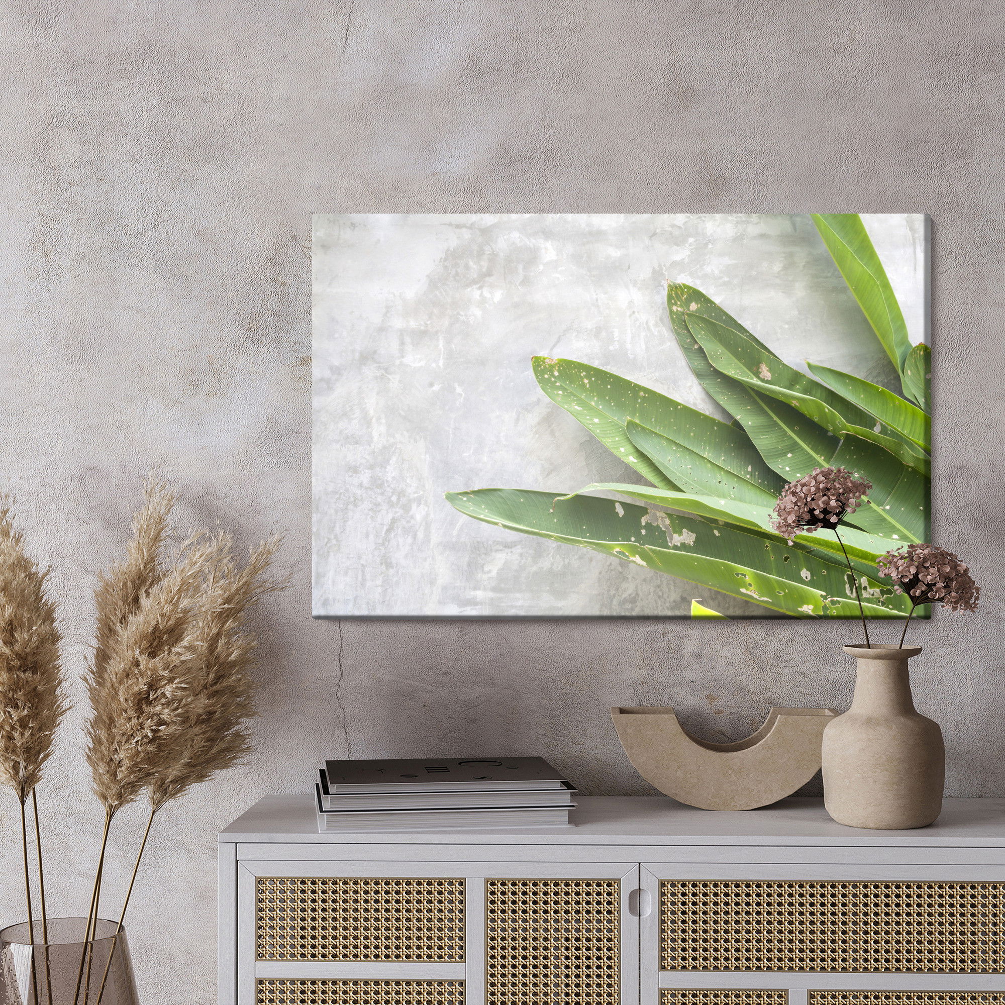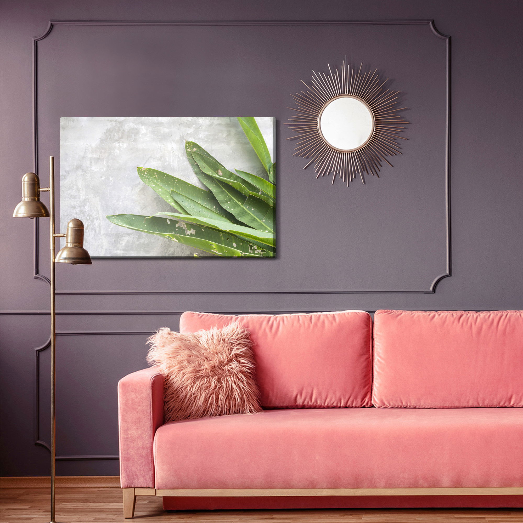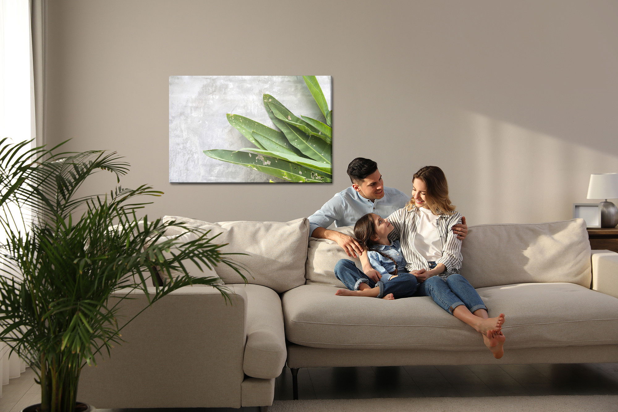 Motivet Green leaves on a concrete återges med hög färgprecision och detaljrikedom tack vare HP Latex-teknologi. Trycket sker med vattenbaserade, luktfria och GREENGUARD Gold-certifierade bläck som ger en upplösning på upp till 300 DPI. Färgerna är UV-beständiga och behåller sin styrka även i ljusa rum, vilket gör tavlan lämplig för både hem- och offentliga miljöer.