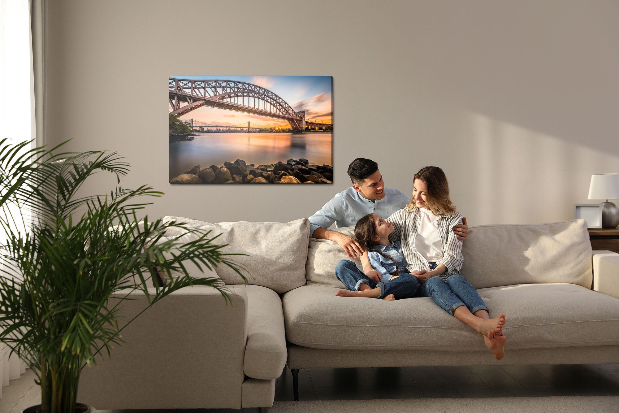 Motivet Hell gate bridge, New York återges med hög färgprecision och detaljrikedom tack vare HP Latex-teknologi. Trycket sker med vattenbaserade, luktfria och GREENGUARD Gold-certifierade bläck som ger en upplösning på upp till 300 DPI. Färgerna är UV-beständiga och behåller sin styrka även i ljusa rum, vilket gör tavlan lämplig för både hem- och offentliga miljöer.