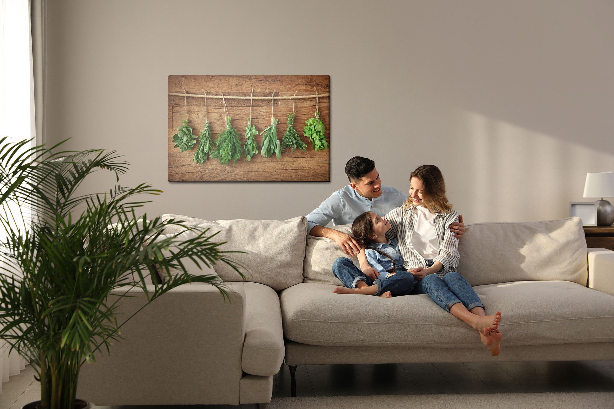 Varje tavla monteras på en massiv fururam. Format upp till 70×50 cm har en ram på 15 mm, medan format från 90×60 cm och uppåt har en ram på 20 mm. Den exakta dukspänningen gör att tavlan håller sin form över tid. Motivet Herbs of provence trycks runt hela ramen vilket ger ett stilrent galleriuttryck där tavlan är lika vacker från sidan som framifrån. Kombinationen av rak dukspänning, rena linjer och korrekt tryck ger en professionell finish.
