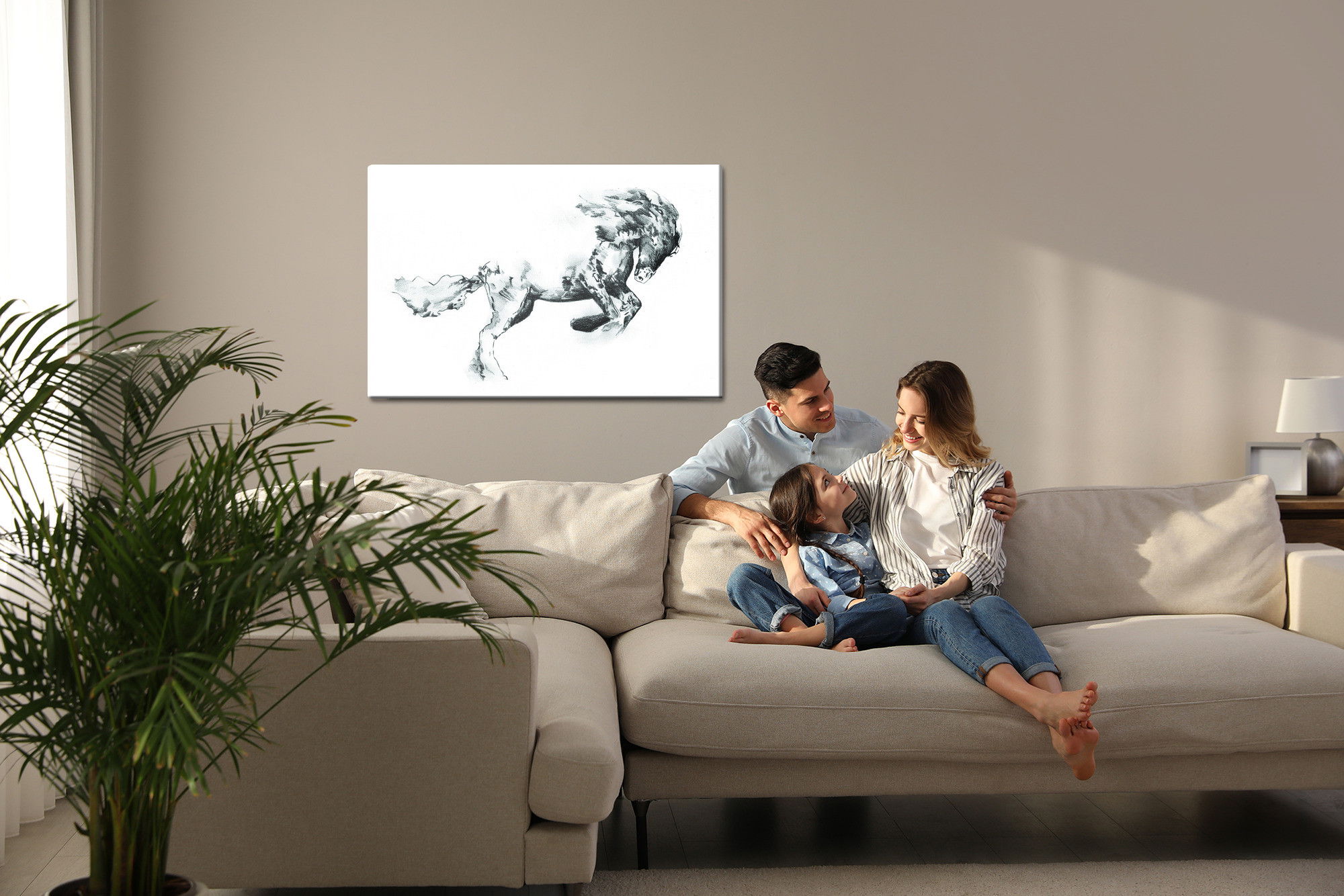 Varje tavla monteras på en massiv fururam. Format upp till 70×50 cm har en ram på 15 mm, medan format från 90×60 cm och uppåt har en ram på 20 mm. Den exakta dukspänningen gör att tavlan håller sin form över tid. Motivet Horse as sketched trycks runt hela ramen vilket ger ett stilrent galleriuttryck där tavlan är lika vacker från sidan som framifrån. Kombinationen av rak dukspänning, rena linjer och korrekt tryck ger en professionell finish.