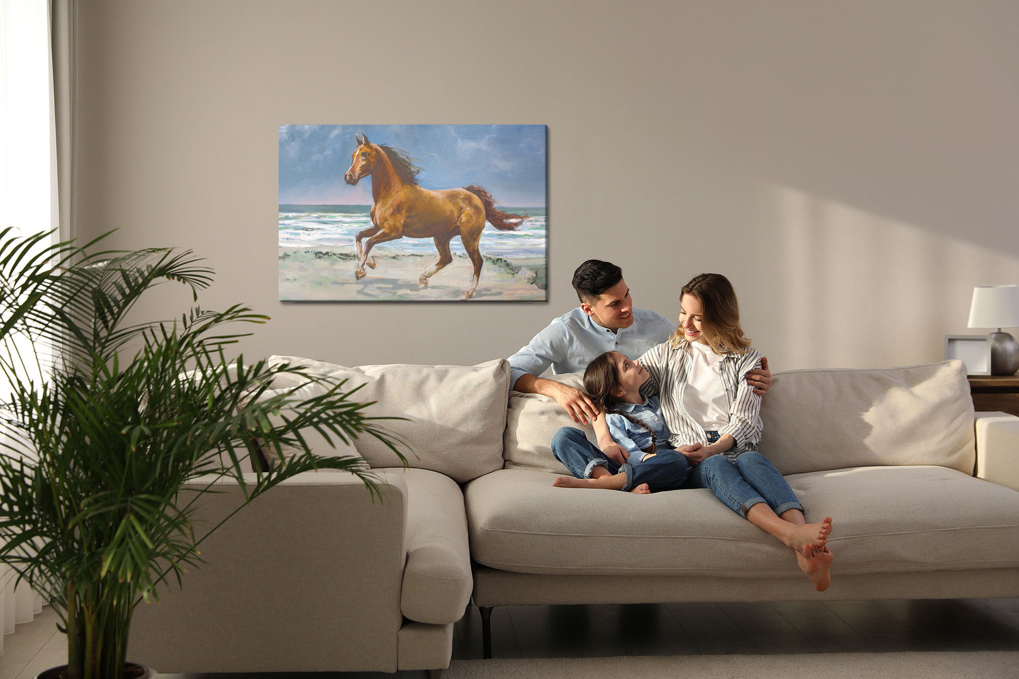 Varje tavla monteras på en massiv fururam. Format upp till 70×50 cm har en ram på 15 mm, medan format från 90×60 cm och uppåt har en ram på 20 mm. Den exakta dukspänningen gör att tavlan håller sin form över tid. Motivet Horse, sun and sea trycks runt hela ramen vilket ger ett stilrent galleriuttryck där tavlan är lika vacker från sidan som framifrån. Kombinationen av rak dukspänning, rena linjer och korrekt tryck ger en professionell finish.
