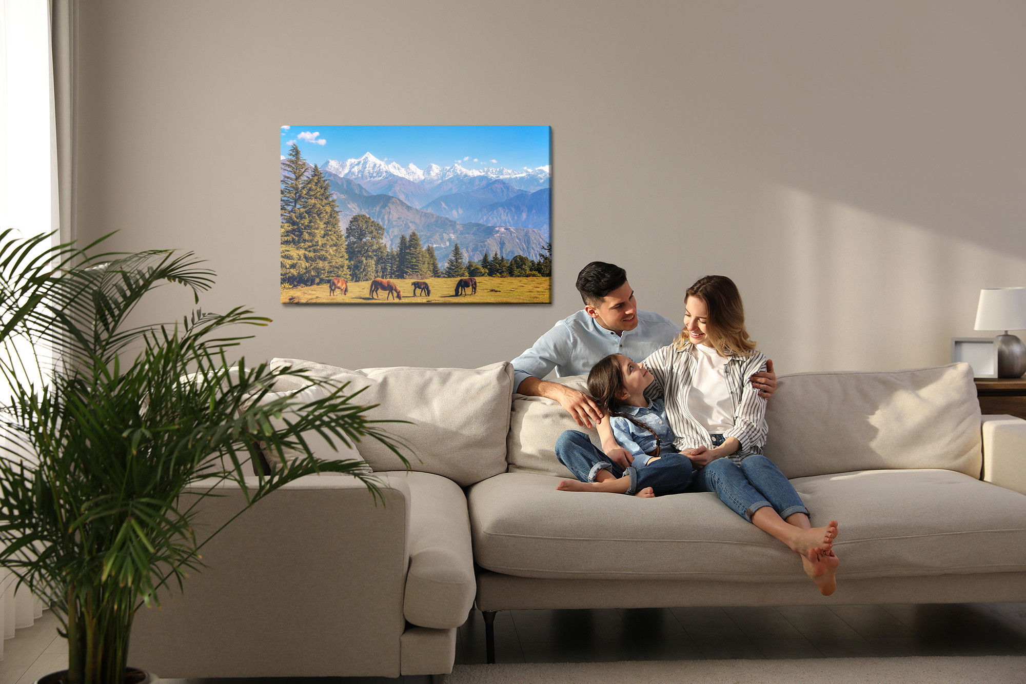 Varje tavla monteras på en massiv fururam. Format upp till 70×50 cm har en ram på 15 mm, medan format från 90×60 cm och uppåt har en ram på 20 mm. Den exakta dukspänningen gör att tavlan håller sin form över tid. Motivet Horses and mountain landscape trycks runt hela ramen vilket ger ett stilrent galleriuttryck där tavlan är lika vacker från sidan som framifrån. Kombinationen av rak dukspänning, rena linjer och korrekt tryck ger en professionell finish.