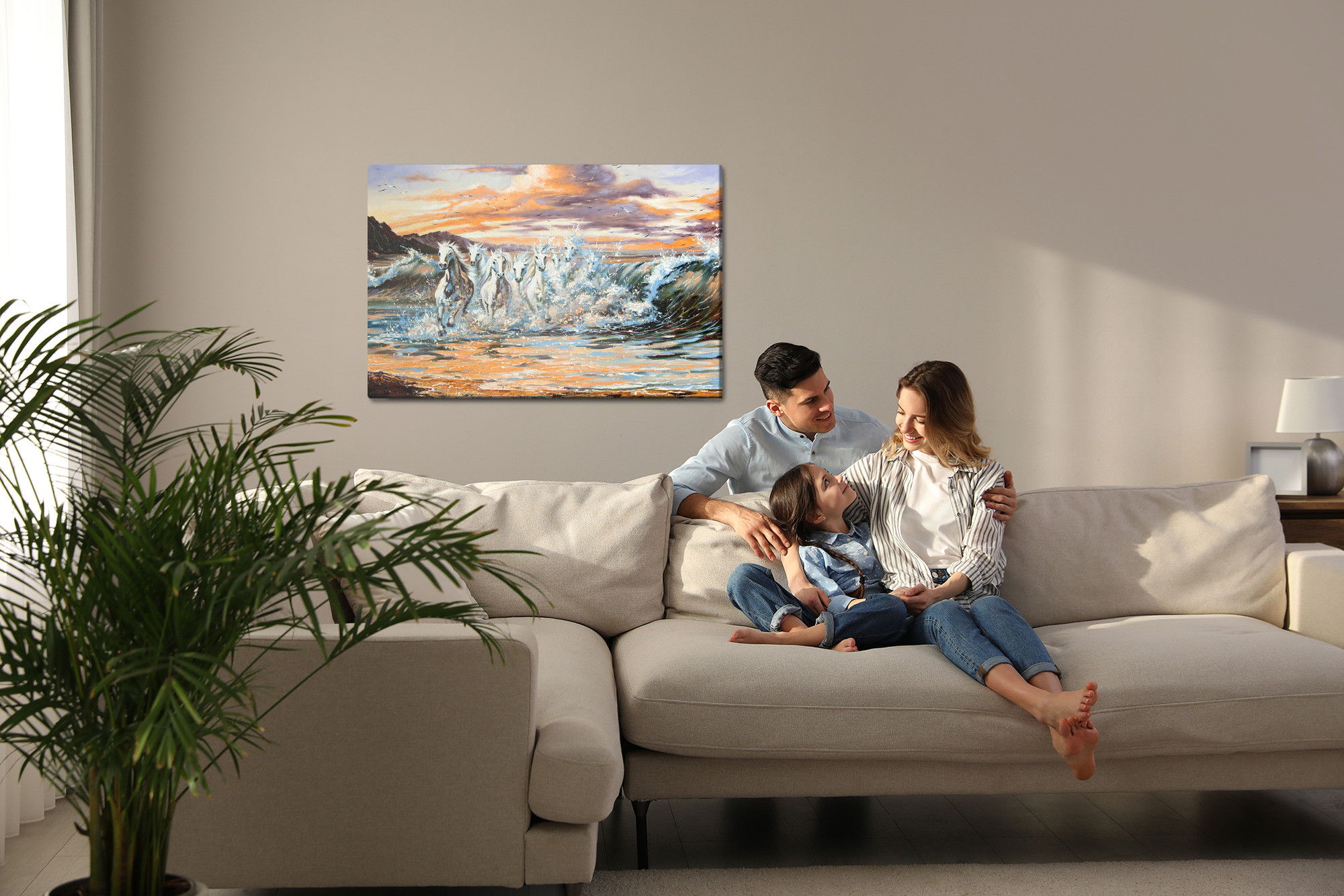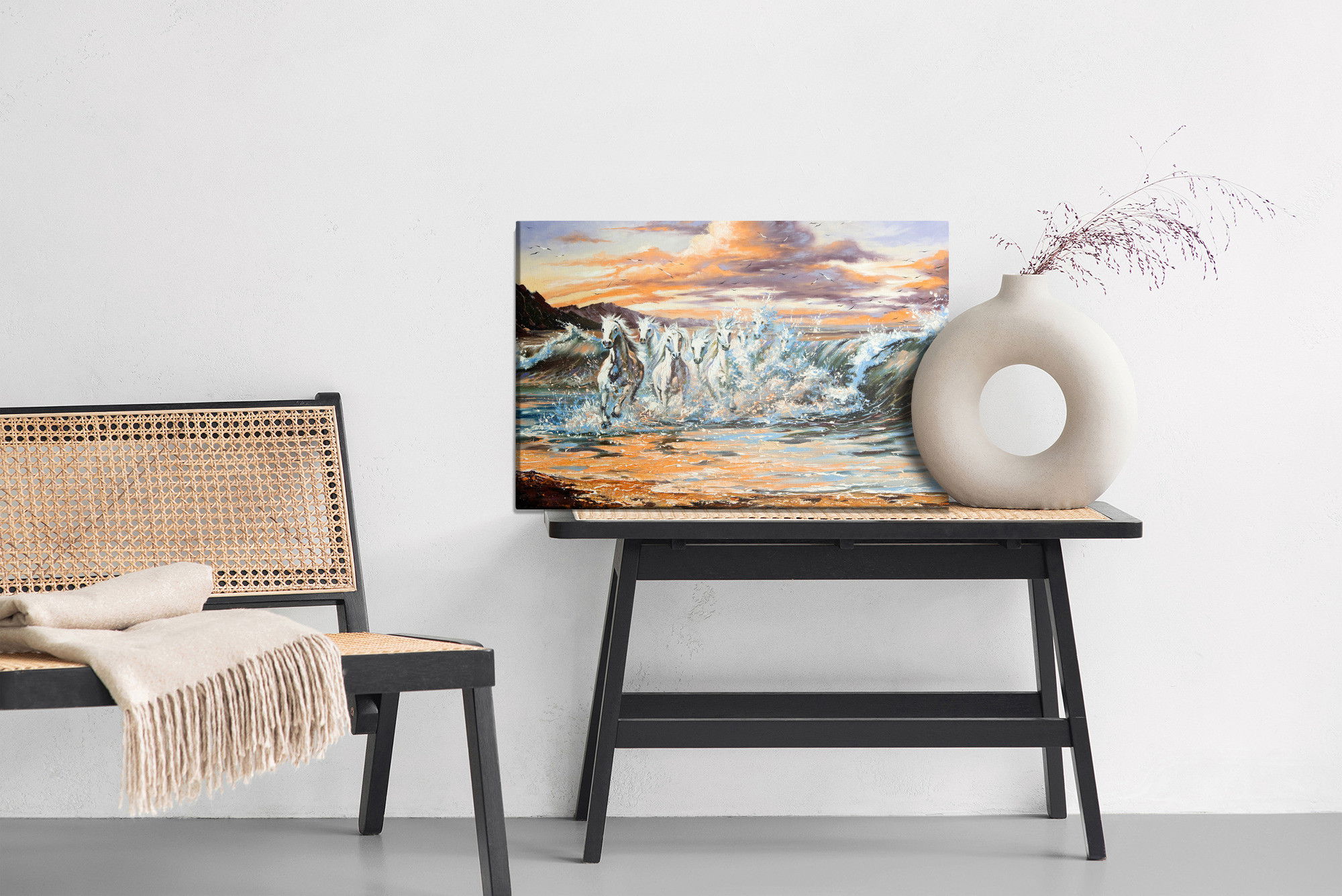 Varje tavla monteras på en massiv fururam. Format upp till 70×50 cm har en ram på 15 mm, medan format från 90×60 cm och uppåt har en ram på 20 mm. Den exakta dukspänningen gör att tavlan håller sin form över tid. Motivet Horses at the seaside trycks runt hela ramen vilket ger ett stilrent galleriuttryck där tavlan är lika vacker från sidan som framifrån. Kombinationen av rak dukspänning, rena linjer och korrekt tryck ger en professionell finish.