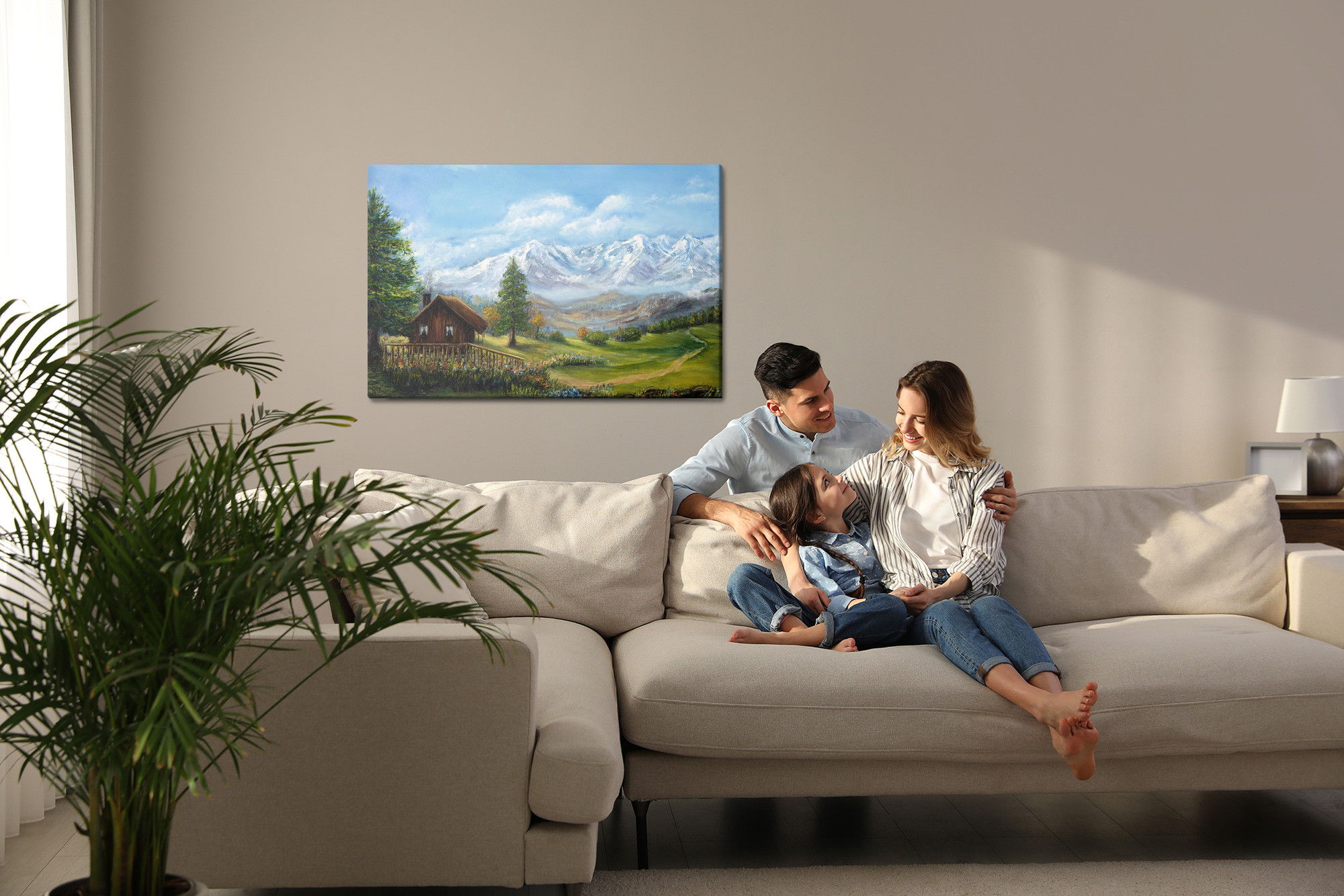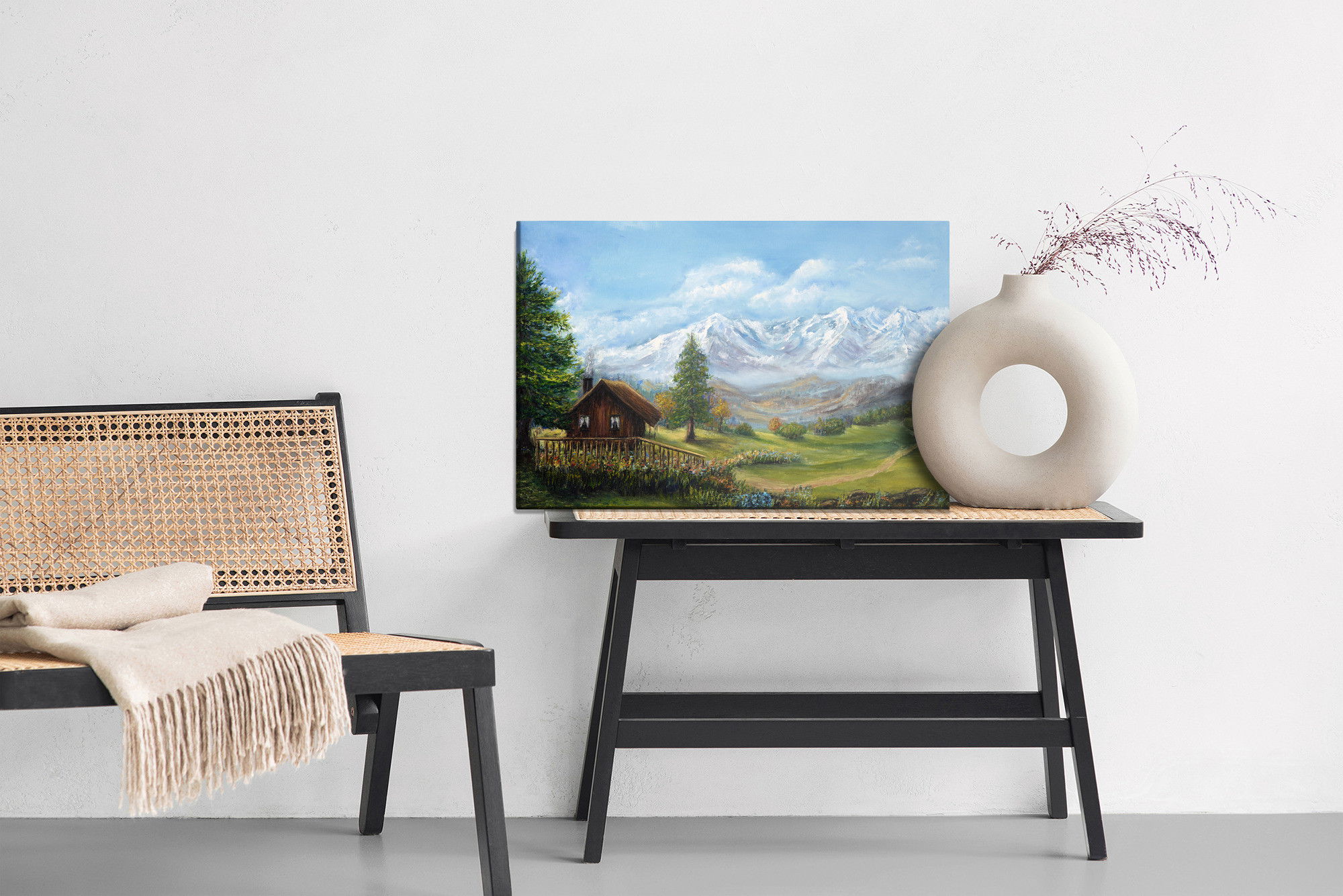 Varje tavla monteras på en massiv fururam. Format upp till 70×50 cm har en ram på 15 mm, medan format från 90×60 cm och uppåt har en ram på 20 mm. Den exakta dukspänningen gör att tavlan håller sin form över tid. Motivet House on the background trycks runt hela ramen vilket ger ett stilrent galleriuttryck där tavlan är lika vacker från sidan som framifrån. Kombinationen av rak dukspänning, rena linjer och korrekt tryck ger en professionell finish.