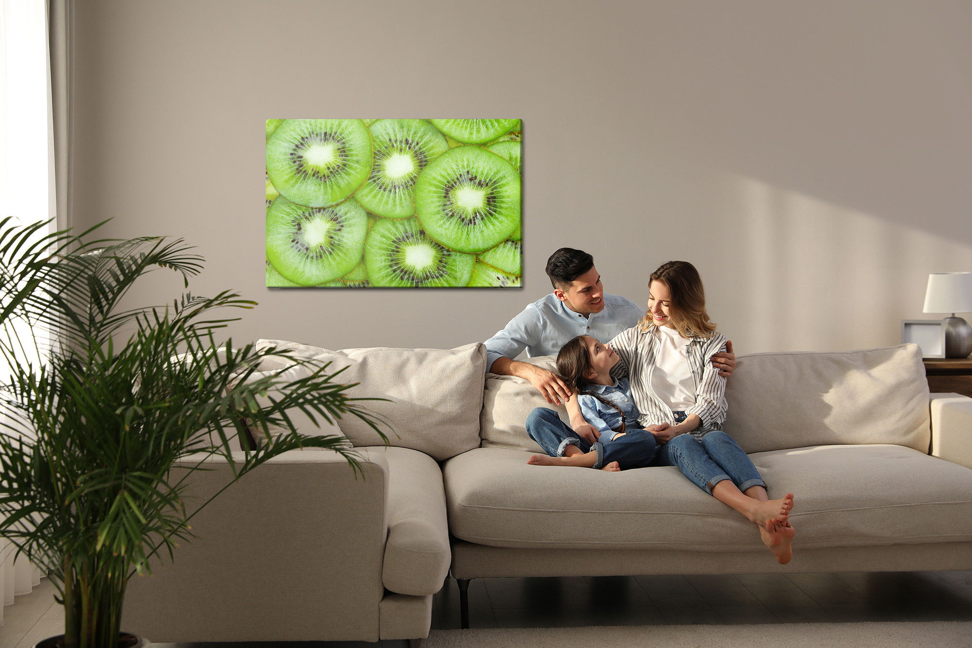Varje tavla monteras på en massiv fururam. Format upp till 70×50 cm har en ram på 15 mm, medan format från 90×60 cm och uppåt har en ram på 20 mm. Den exakta dukspänningen gör att tavlan håller sin form över tid. Motivet Kiwi close up trycks runt hela ramen vilket ger ett stilrent galleriuttryck där tavlan är lika vacker från sidan som framifrån. Kombinationen av rak dukspänning, rena linjer och korrekt tryck ger en professionell finish.