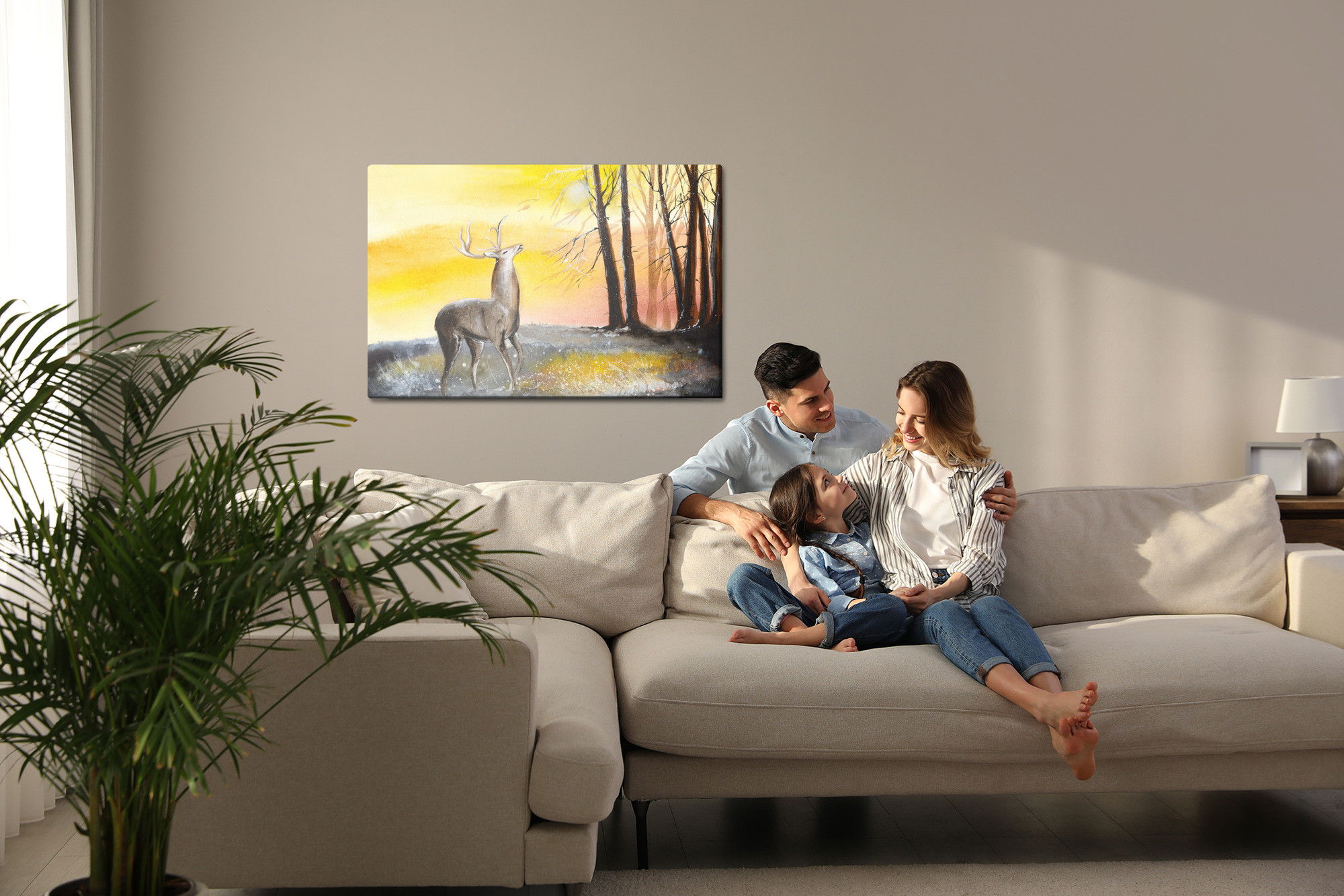 Motivet Landscape with a deer återges med hög färgprecision och detaljrikedom tack vare HP Latex-teknologi. Trycket sker med vattenbaserade, luktfria och GREENGUARD Gold-certifierade bläck som ger en upplösning på upp till 300 DPI. Färgerna är UV-beständiga och behåller sin styrka även i ljusa rum, vilket gör tavlan lämplig för både hem- och offentliga miljöer.