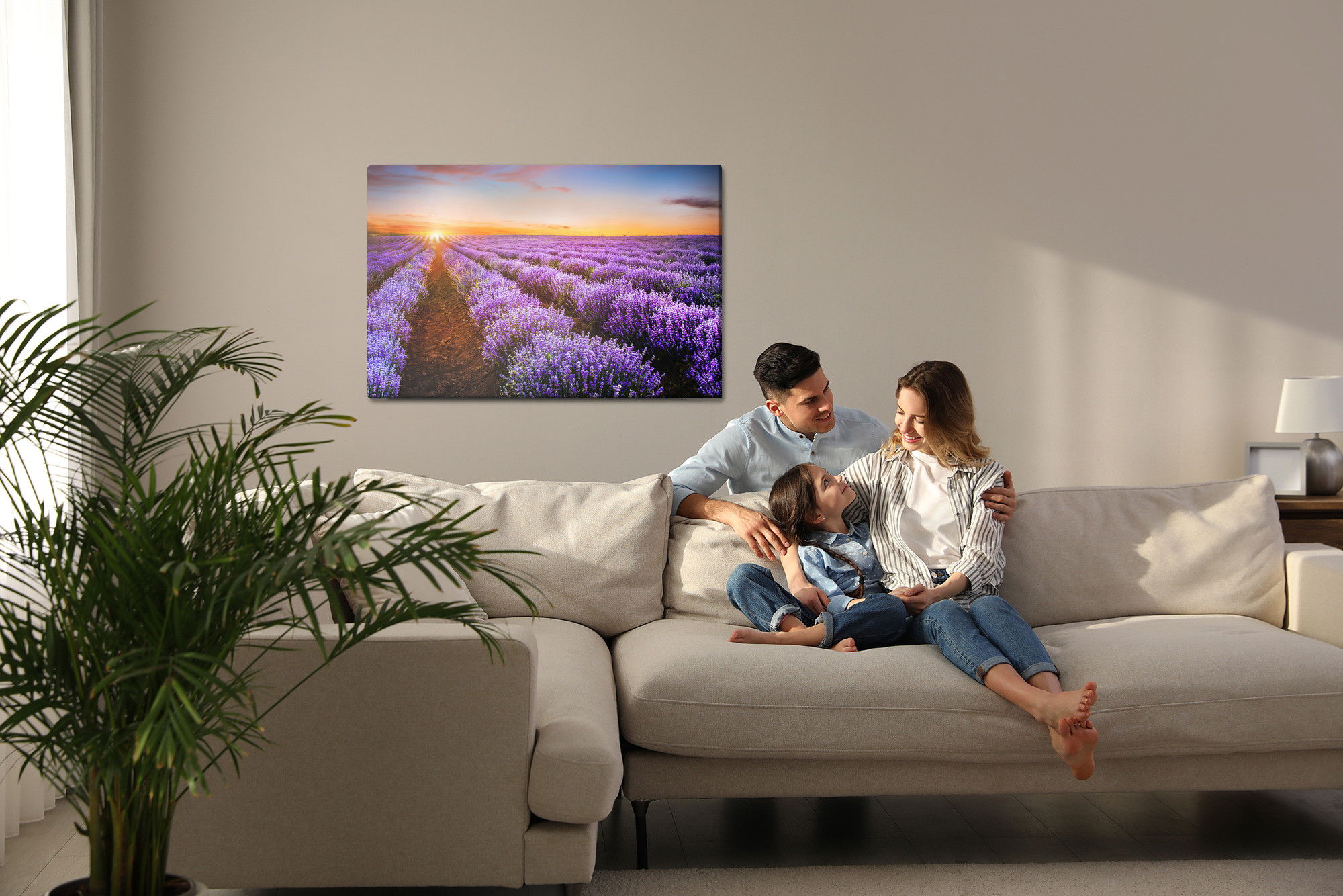 Motivet Lavender at sunset återges med hög färgprecision och detaljrikedom tack vare HP Latex-teknologi. Trycket sker med vattenbaserade, luktfria och GREENGUARD Gold-certifierade bläck som ger en upplösning på upp till 300 DPI. Färgerna är UV-beständiga och behåller sin styrka även i ljusa rum, vilket gör tavlan lämplig för både hem- och offentliga miljöer.