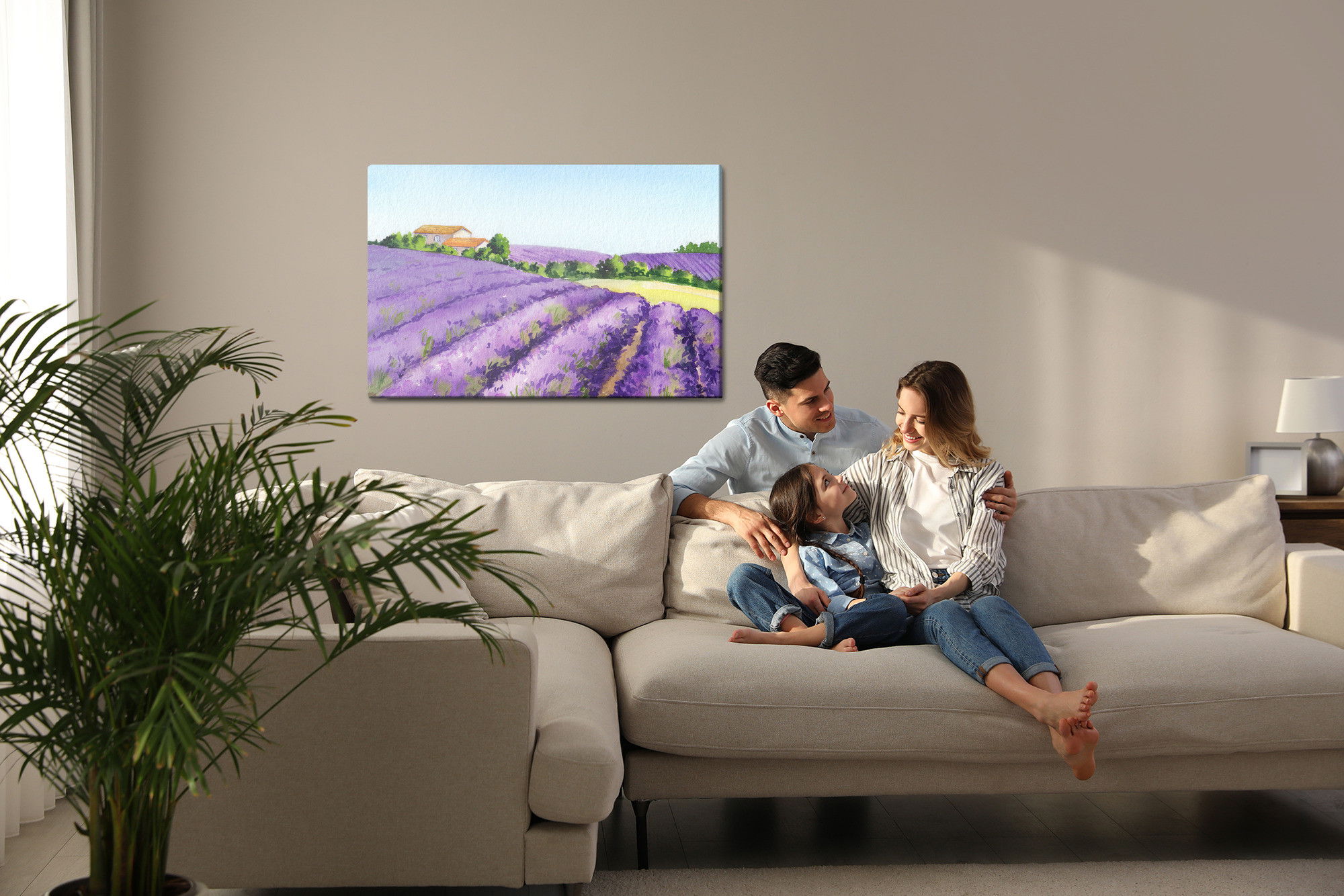 Varje tavla monteras på en massiv fururam. Format upp till 70×50 cm har en ram på 15 mm, medan format från 90×60 cm och uppåt har en ram på 20 mm. Den exakta dukspänningen gör att tavlan håller sin form över tid. Motivet Lavender field painted trycks runt hela ramen vilket ger ett stilrent galleriuttryck där tavlan är lika vacker från sidan som framifrån. Kombinationen av rak dukspänning, rena linjer och korrekt tryck ger en professionell finish.