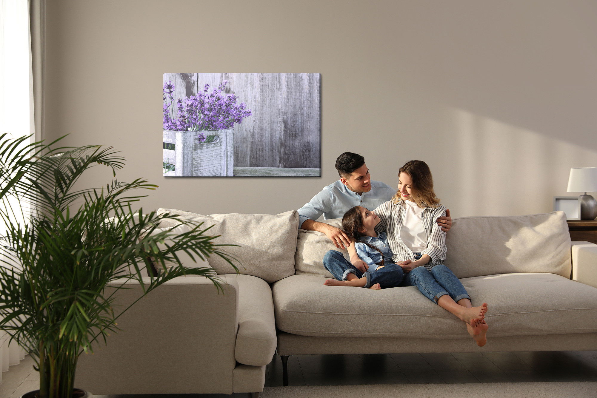 Varje tavla monteras på en massiv fururam. Format upp till 70×50 cm har en ram på 15 mm, medan format från 90×60 cm och uppåt har en ram på 20 mm. Den exakta dukspänningen gör att tavlan håller sin form över tid. Motivet Lavender flowers in a wooden trycks runt hela ramen vilket ger ett stilrent galleriuttryck där tavlan är lika vacker från sidan som framifrån. Kombinationen av rak dukspänning, rena linjer och korrekt tryck ger en professionell finish.