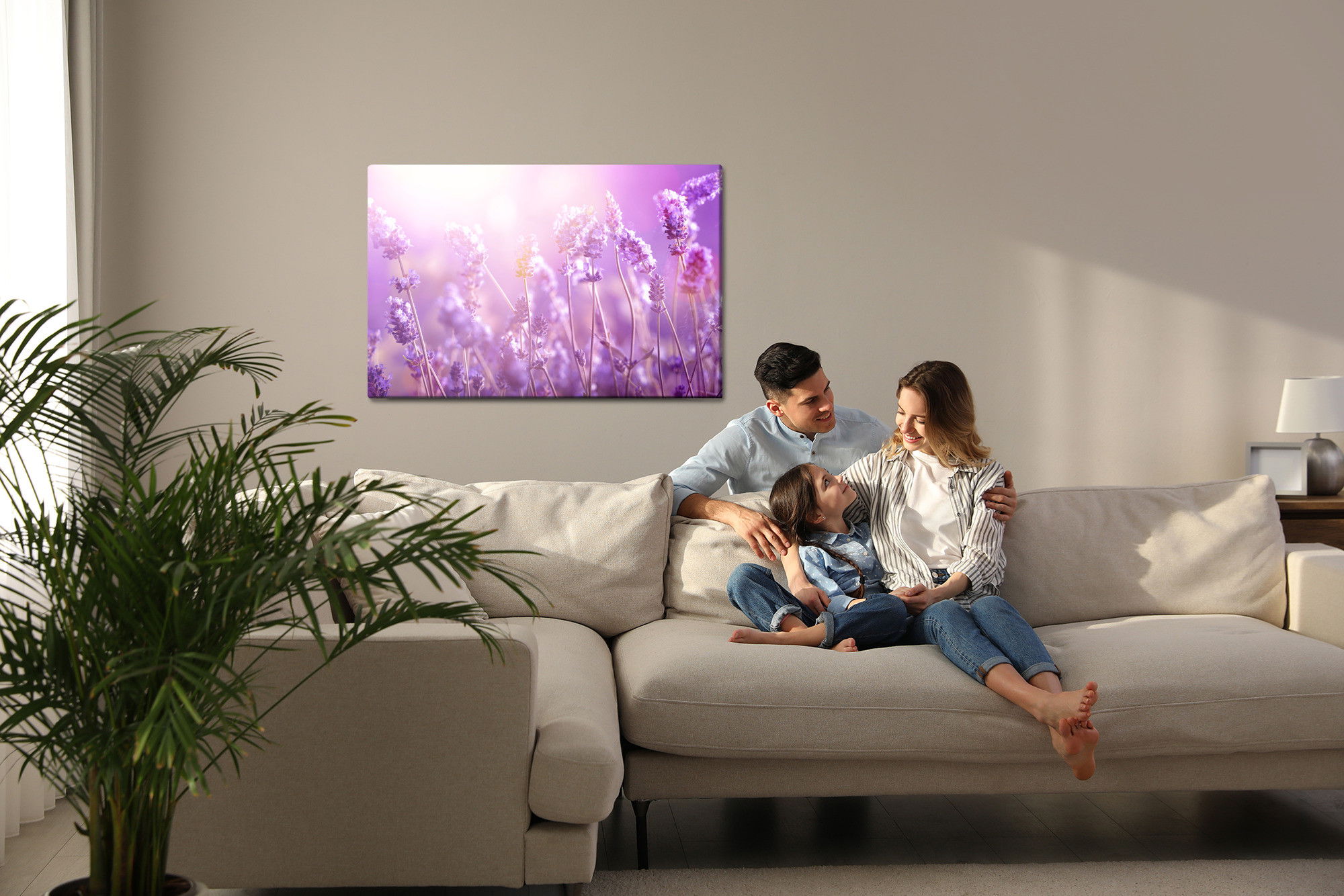 Varje tavla monteras på en massiv fururam. Format upp till 70×50 cm har en ram på 15 mm, medan format från 90×60 cm och uppåt har en ram på 20 mm. Den exakta dukspänningen gör att tavlan håller sin form över tid. Motivet Lavender flowers in the sun trycks runt hela ramen vilket ger ett stilrent galleriuttryck där tavlan är lika vacker från sidan som framifrån. Kombinationen av rak dukspänning, rena linjer och korrekt tryck ger en professionell finish.