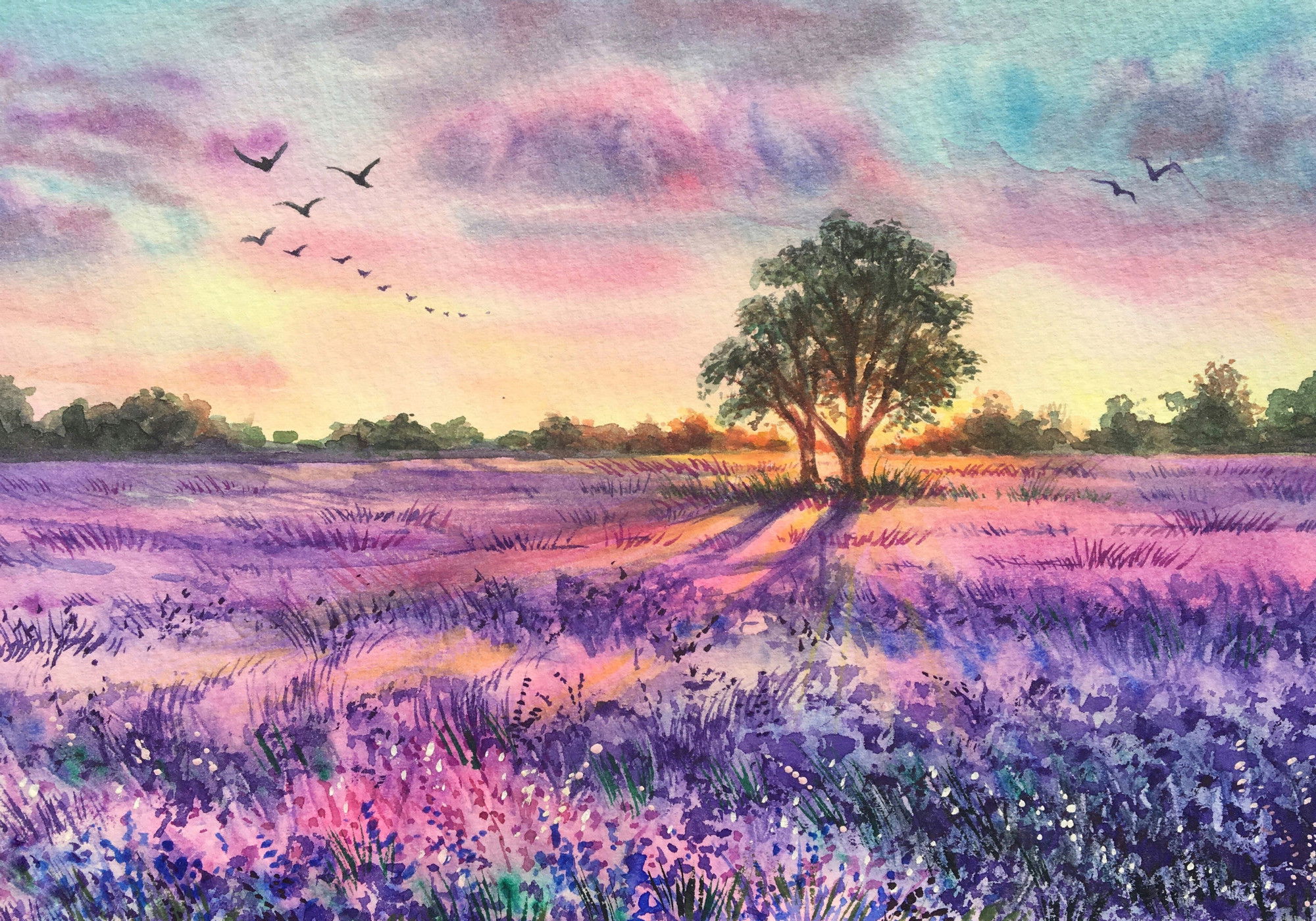 Ljuddämpande tavla – Lavender landscape painted för lugnare rum och mjukare akustik