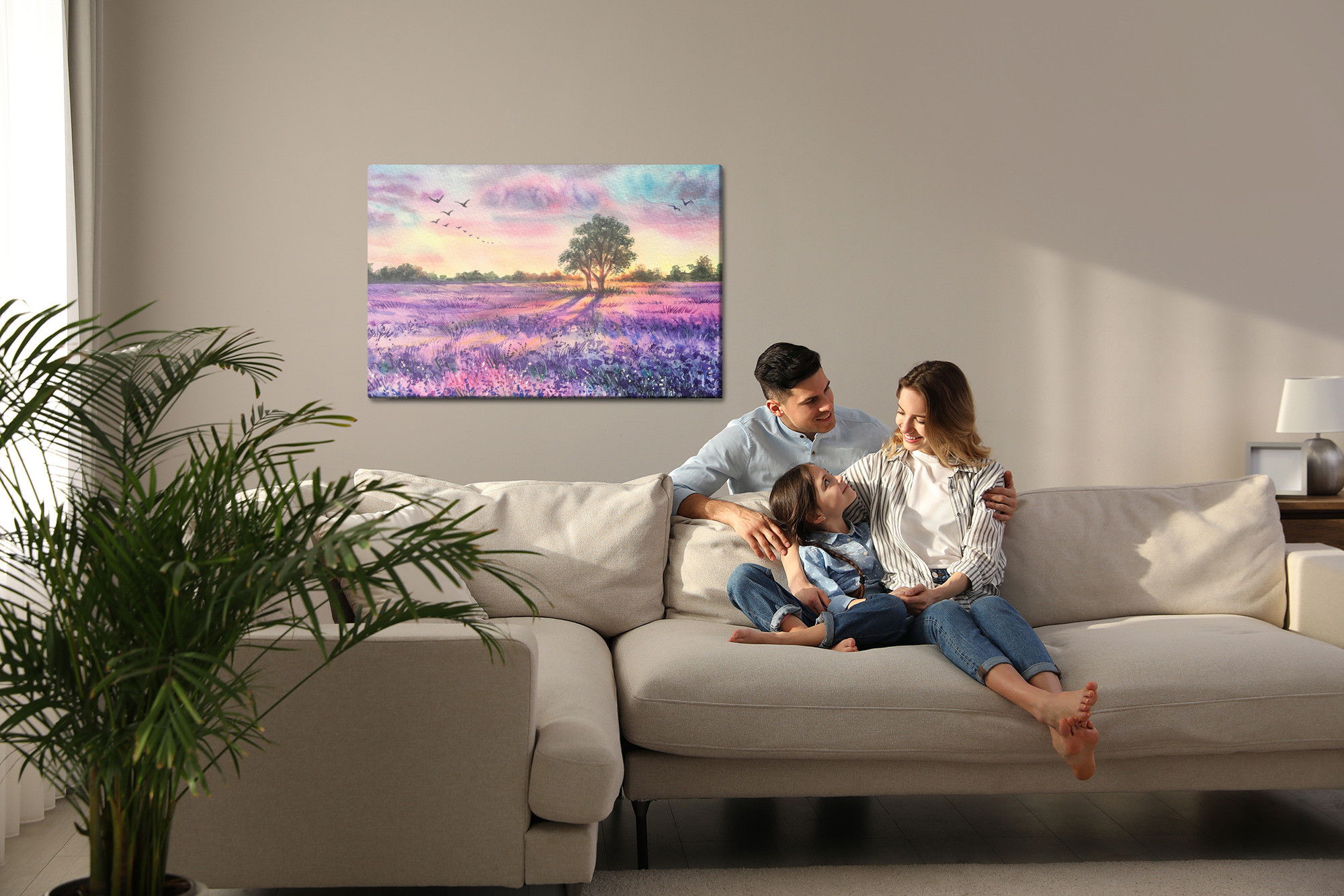 Motivet Lavender landscape painted återges med hög färgprecision och detaljrikedom tack vare HP Latex-teknologi. Trycket sker med vattenbaserade, luktfria och GREENGUARD Gold-certifierade bläck som ger en upplösning på upp till 300 DPI. Färgerna är UV-beständiga och behåller sin styrka även i ljusa rum, vilket gör tavlan lämplig för både hem- och offentliga miljöer.