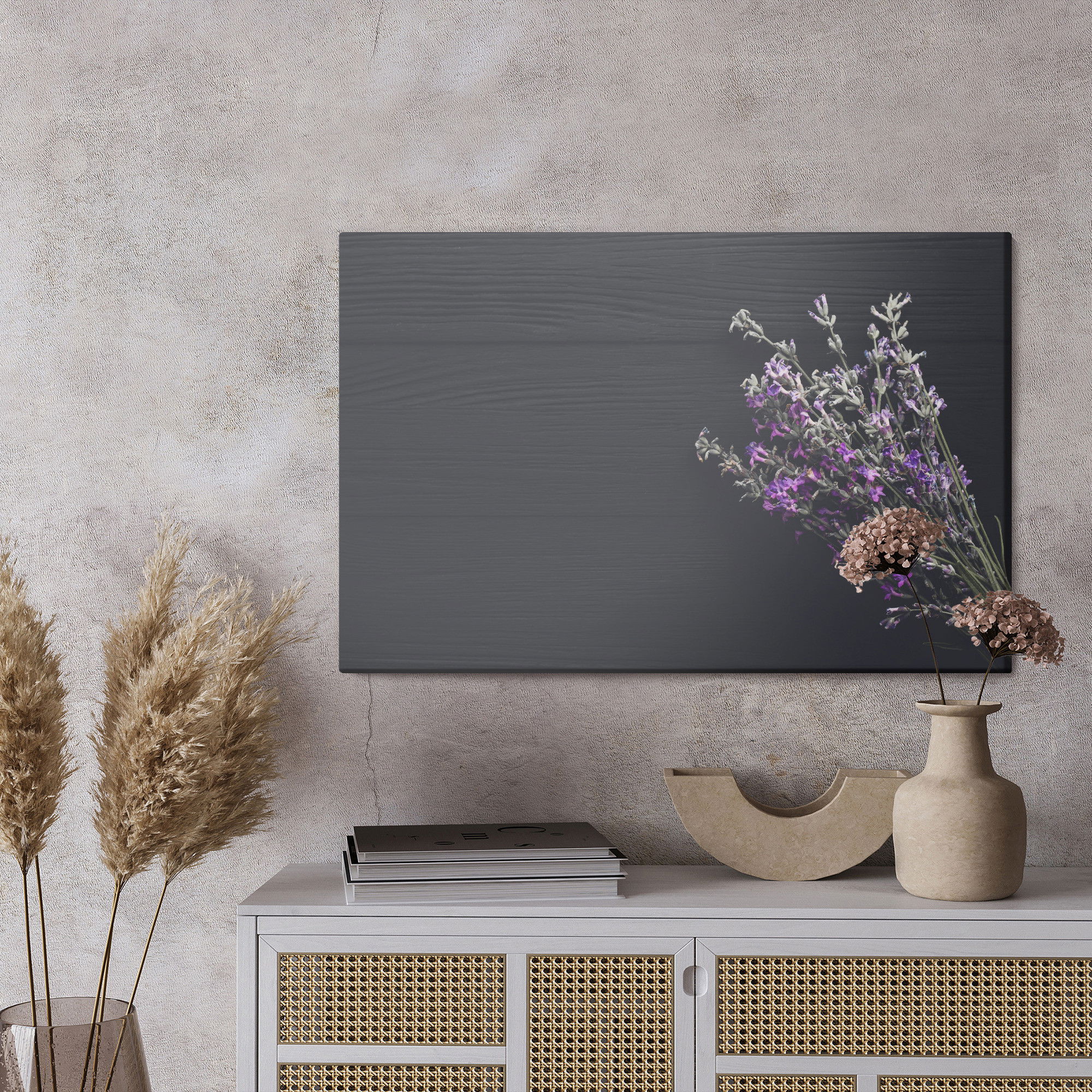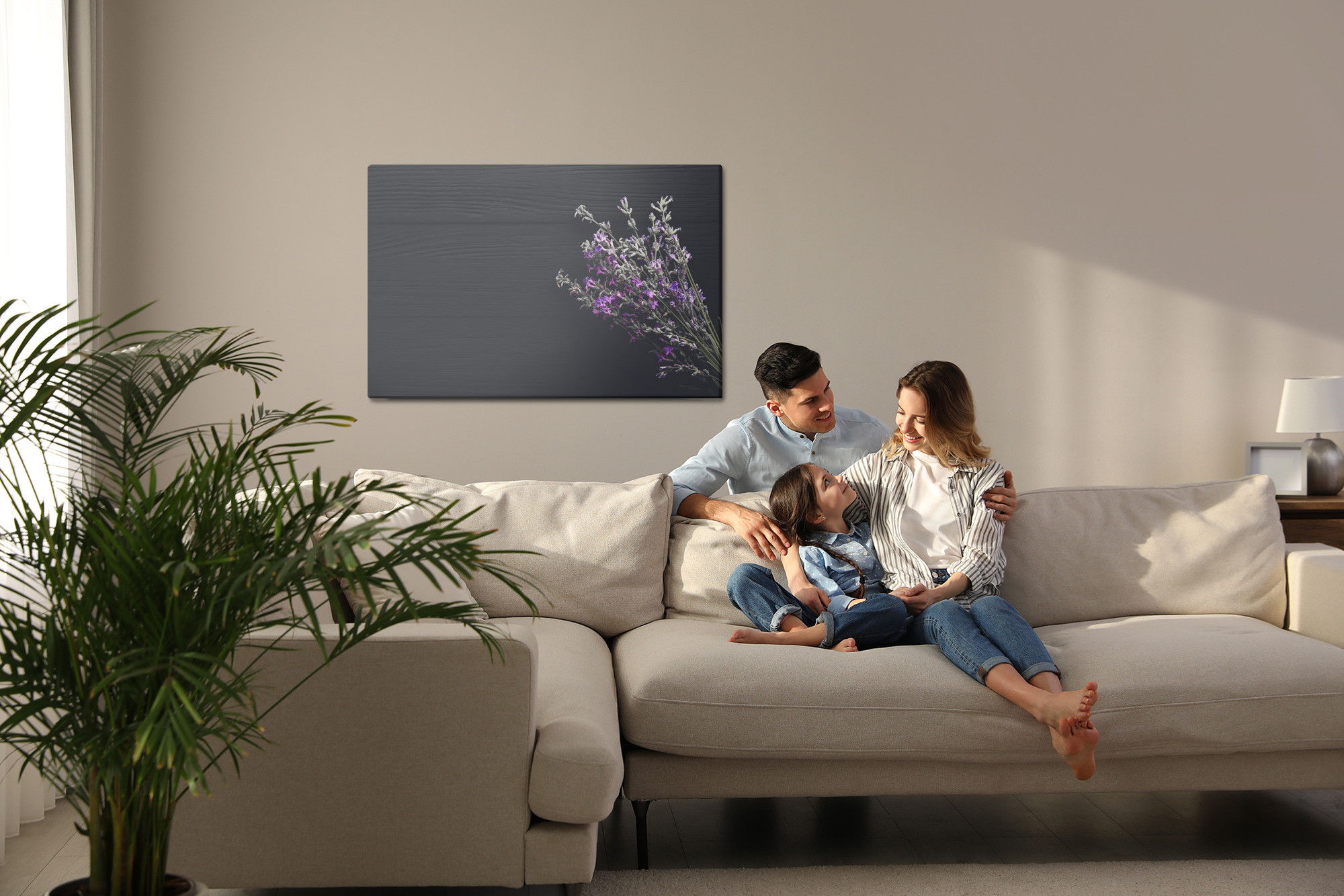 Varje tavla monteras på en massiv fururam. Format upp till 70×50 cm har en ram på 15 mm, medan format från 90×60 cm och uppåt har en ram på 20 mm. Den exakta dukspänningen gör att tavlan håller sin form över tid. Motivet Lavender on the background trycks runt hela ramen vilket ger ett stilrent galleriuttryck där tavlan är lika vacker från sidan som framifrån. Kombinationen av rak dukspänning, rena linjer och korrekt tryck ger en professionell finish.