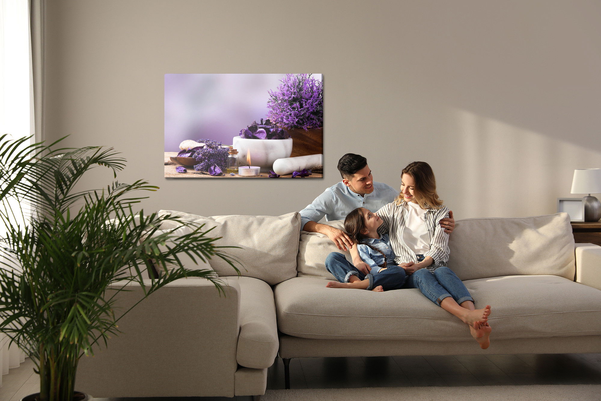 Varje tavla monteras på en massiv fururam. Format upp till 70×50 cm har en ram på 15 mm, medan format från 90×60 cm och uppåt har en ram på 20 mm. Den exakta dukspänningen gör att tavlan håller sin form över tid. Motivet Lavender relaxation set trycks runt hela ramen vilket ger ett stilrent galleriuttryck där tavlan är lika vacker från sidan som framifrån. Kombinationen av rak dukspänning, rena linjer och korrekt tryck ger en professionell finish.