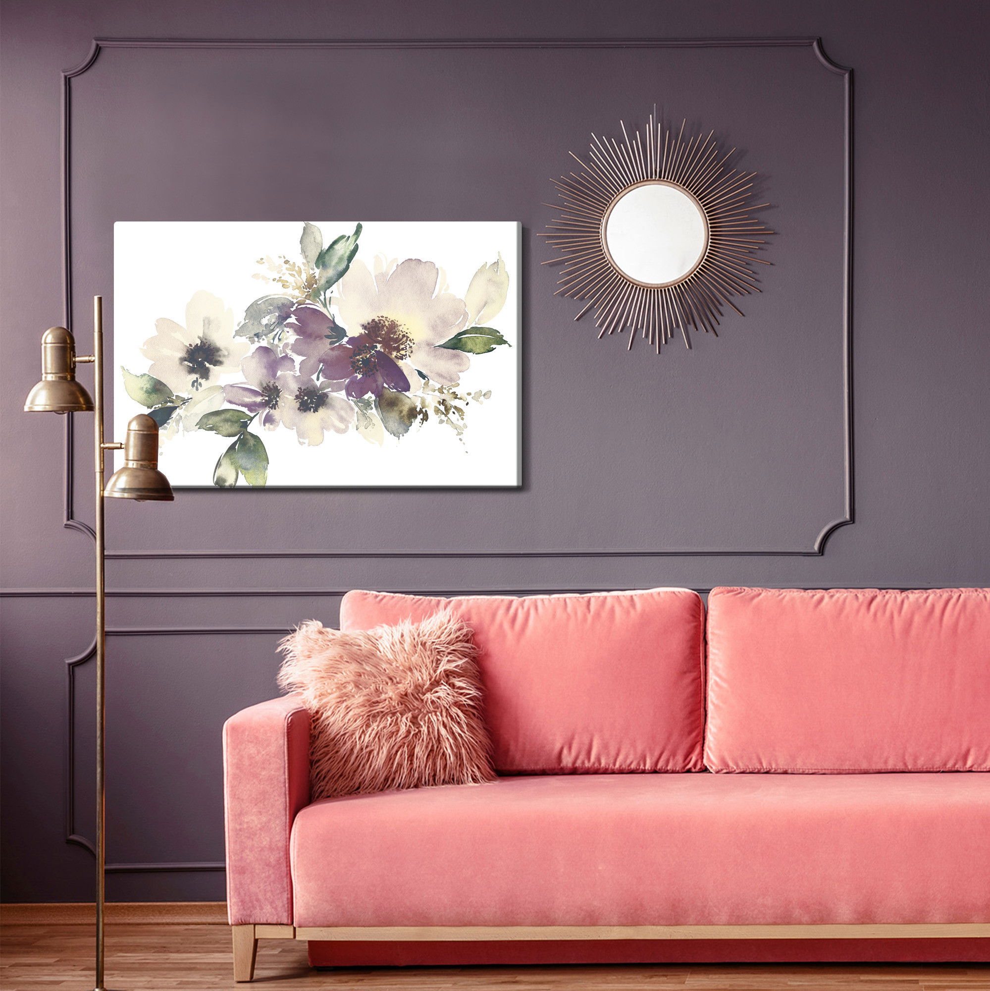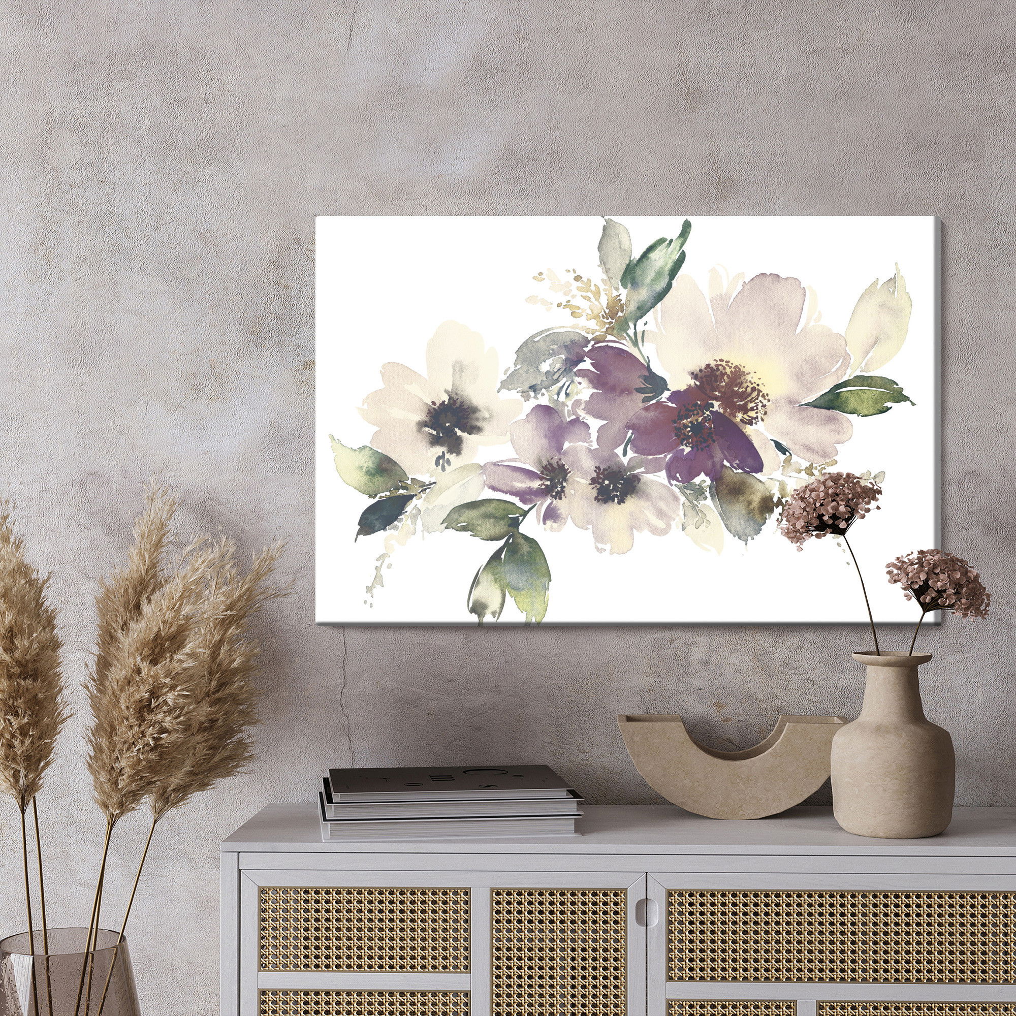 Varje tavla monteras på en massiv fururam. Format upp till 70×50 cm har en ram på 15 mm, medan format från 90×60 cm och uppåt har en ram på 20 mm. Den exakta dukspänningen gör att tavlan håller sin form över tid. Motivet Leaves and flowers painted trycks runt hela ramen vilket ger ett stilrent galleriuttryck där tavlan är lika vacker från sidan som framifrån. Kombinationen av rak dukspänning, rena linjer och korrekt tryck ger en professionell finish.