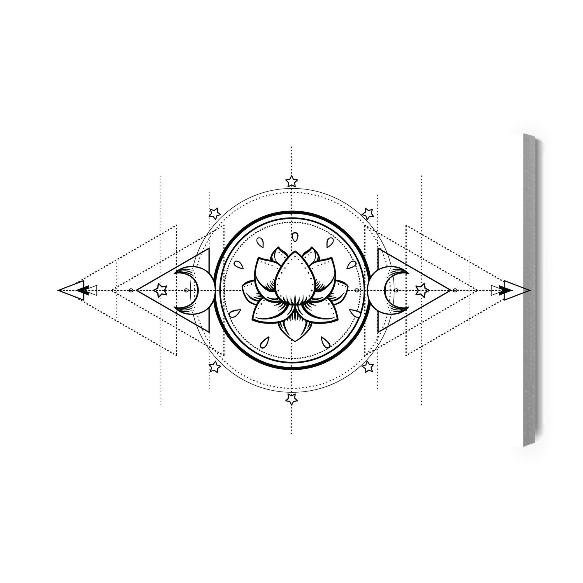 Varje tavla monteras på en massiv fururam. Format upp till 70×50 cm har en ram på 15 mm, medan format från 90×60 cm och uppåt har en ram på 20 mm. Den exakta dukspänningen gör att tavlan håller sin form över tid. Motivet Lotus and sacred geometry trycks runt hela ramen vilket ger ett stilrent galleriuttryck där tavlan är lika vacker från sidan som framifrån. Kombinationen av rak dukspänning, rena linjer och korrekt tryck ger en professionell finish.