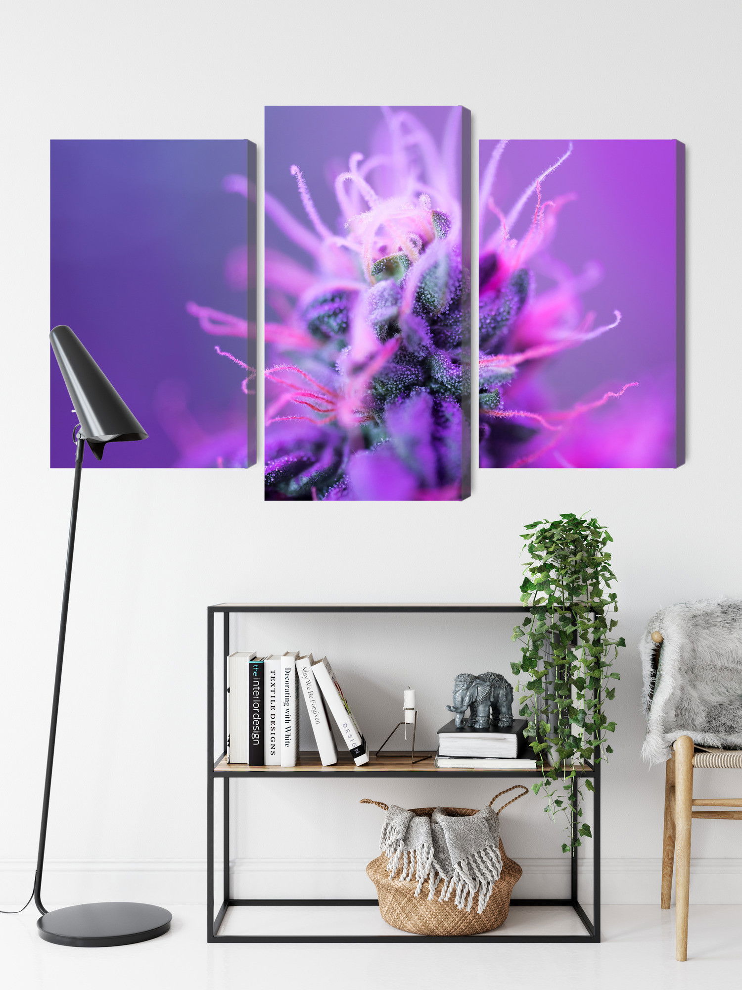 SilentDirects ljuddämpande tavla Macro plant on a pink-purple kombinerar ett högupplöst motiv med avancerad akustikteknik. Varje tavla monteras i Sverige och bygger på en stabil canvastavla med fururam, där insidan av ramen fylls med en ljudabsorberande kärna av återvunnen polyester. Konstruktionen gör tavlan till ett både estetiskt och funktionellt inslag i rummet.