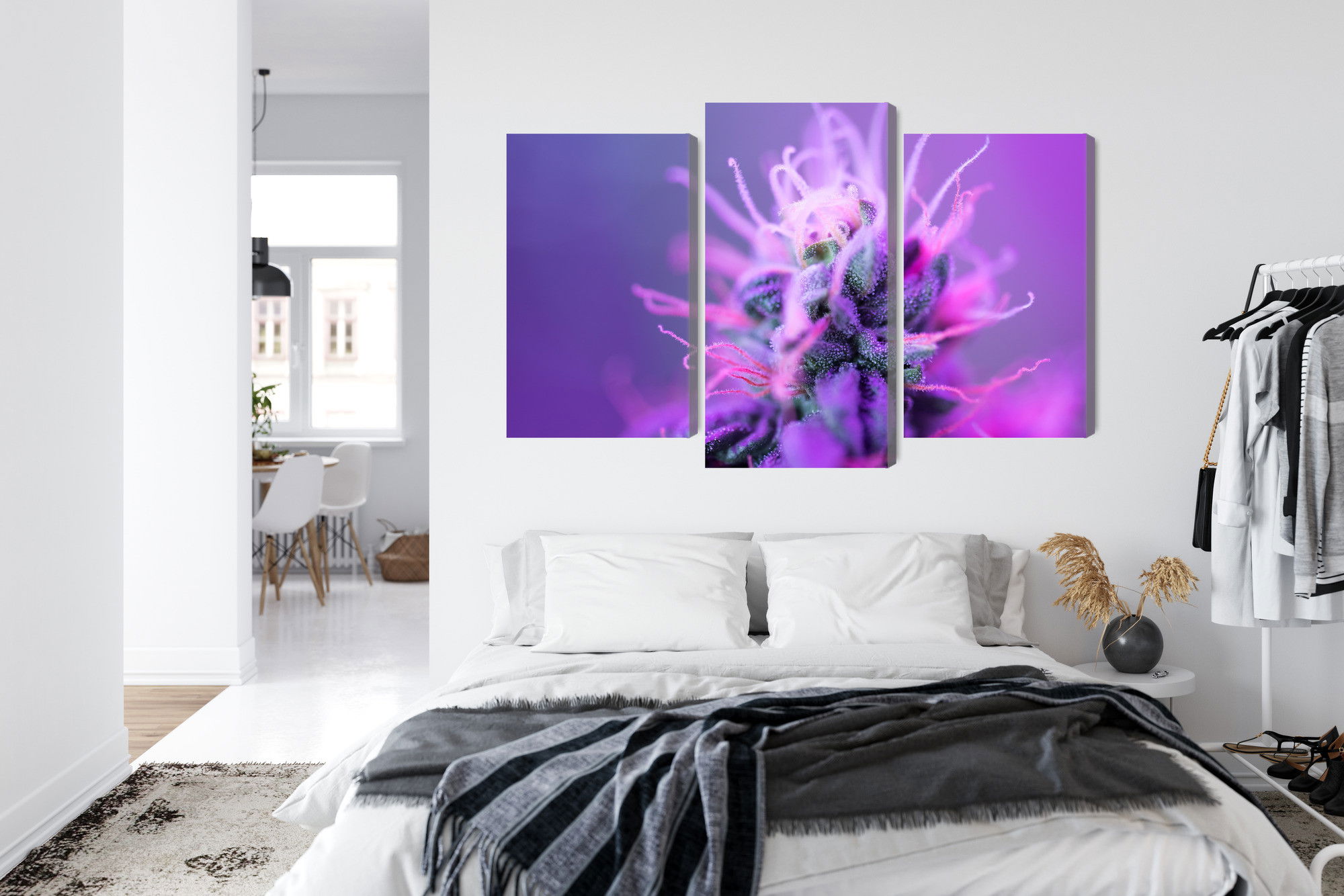 Varje tavla monteras på en massiv fururam. Format upp till 70×50 cm har en ram på 15 mm, medan format från 90×60 cm och uppåt har en ram på 20 mm. Den exakta dukspänningen gör att tavlan håller sin form över tid. Motivet Macro plant on a pink-purple trycks runt hela ramen vilket ger ett stilrent galleriuttryck där tavlan är lika vacker från sidan som framifrån. Kombinationen av rak dukspänning, rena linjer och korrekt tryck ger en professionell finish.