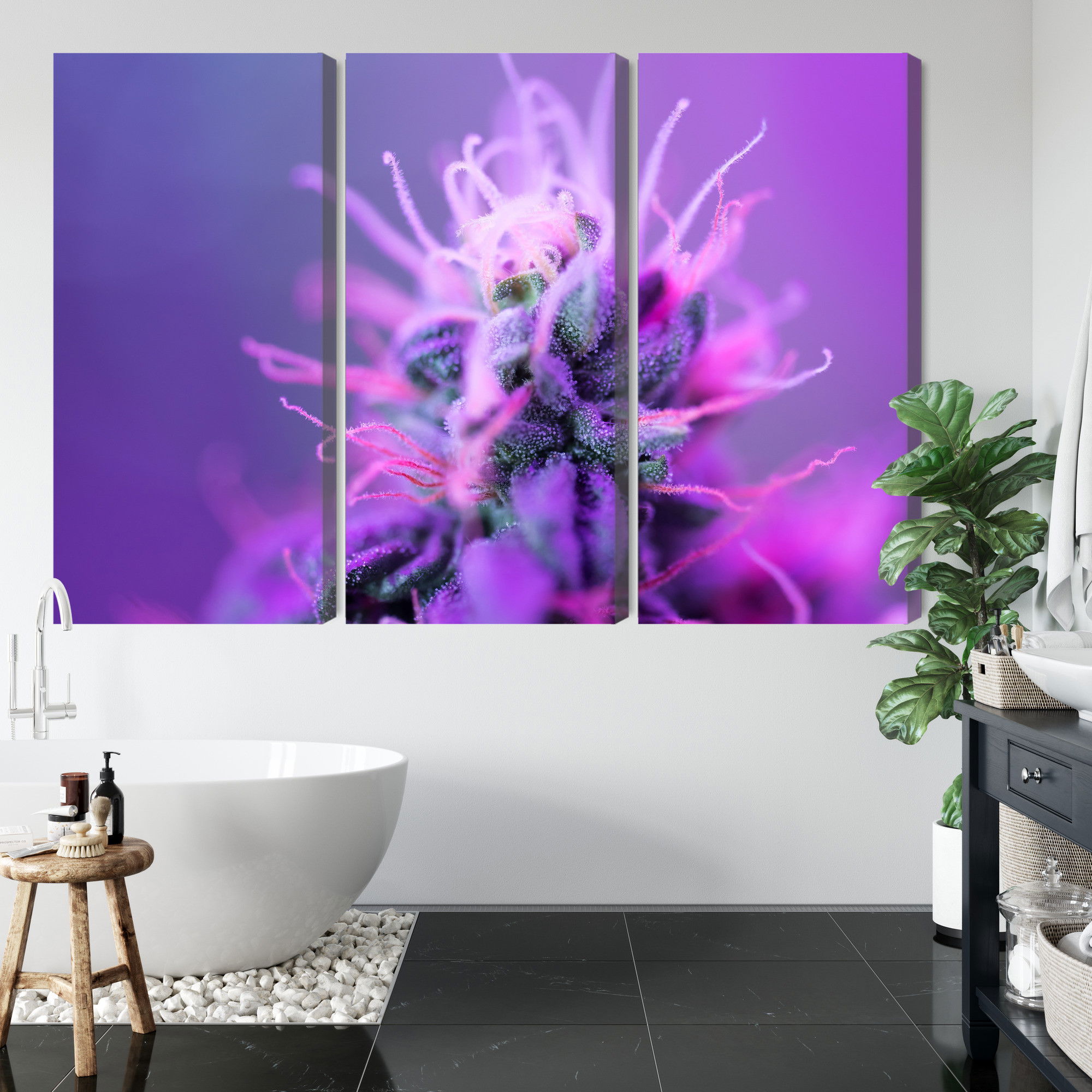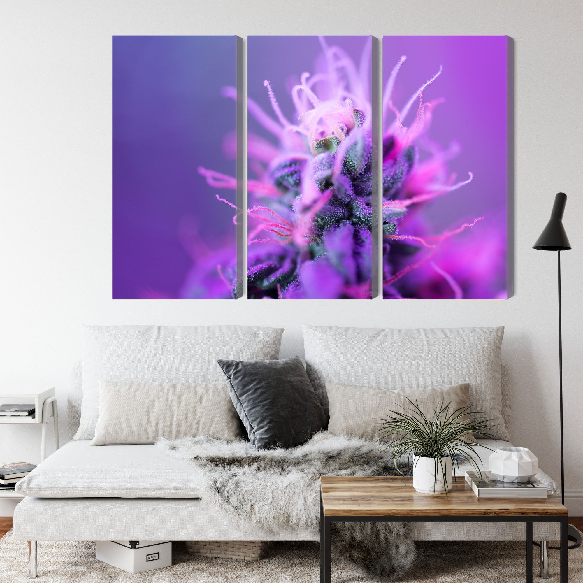 Varje tavla monteras på en massiv fururam. Format upp till 70×50 cm har en ram på 15 mm, medan format från 90×60 cm och uppåt har en ram på 20 mm. Den exakta dukspänningen gör att tavlan håller sin form över tid. Motivet Macro plant on a pink-purple trycks runt hela ramen vilket ger ett stilrent galleriuttryck där tavlan är lika vacker från sidan som framifrån. Kombinationen av rak dukspänning, rena linjer och korrekt tryck ger en professionell finish.