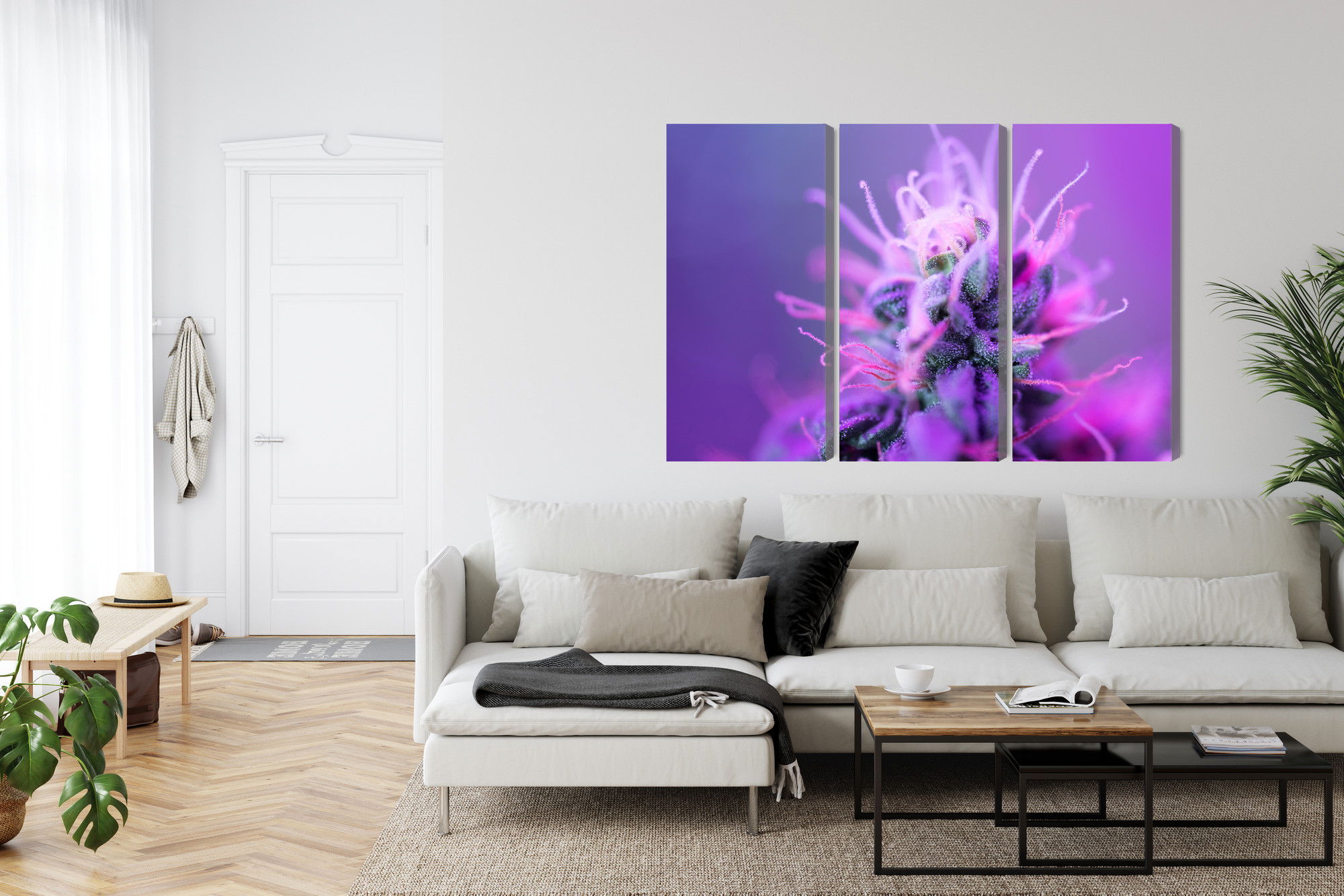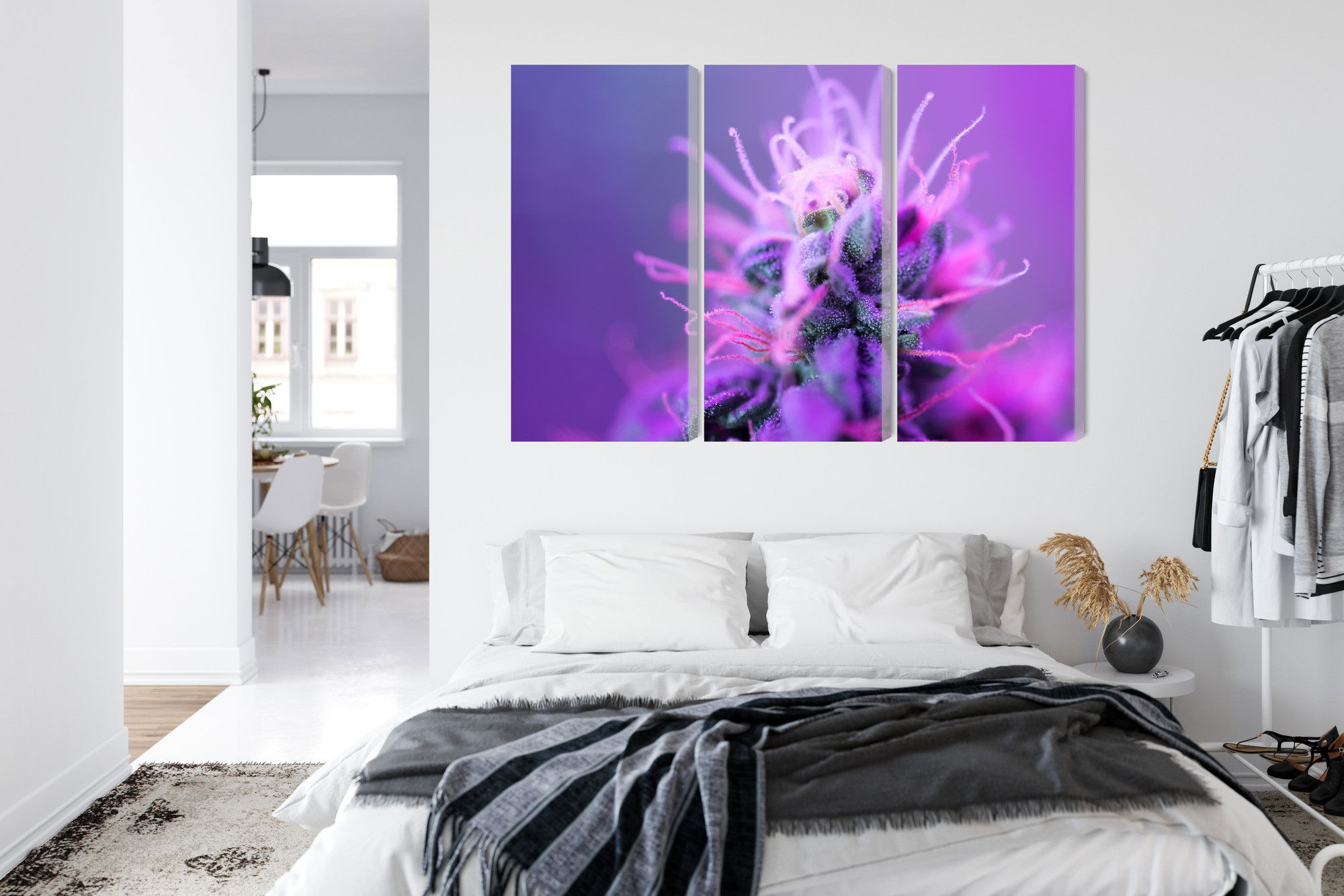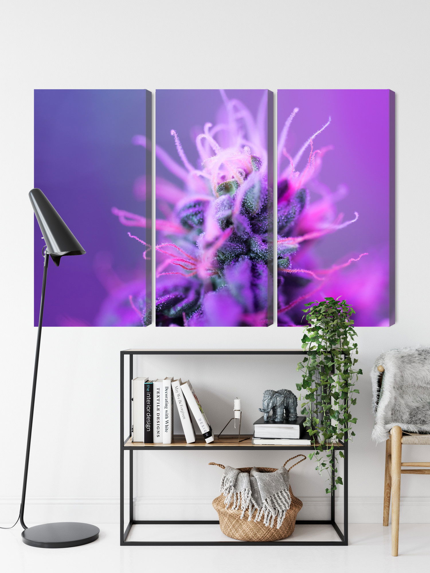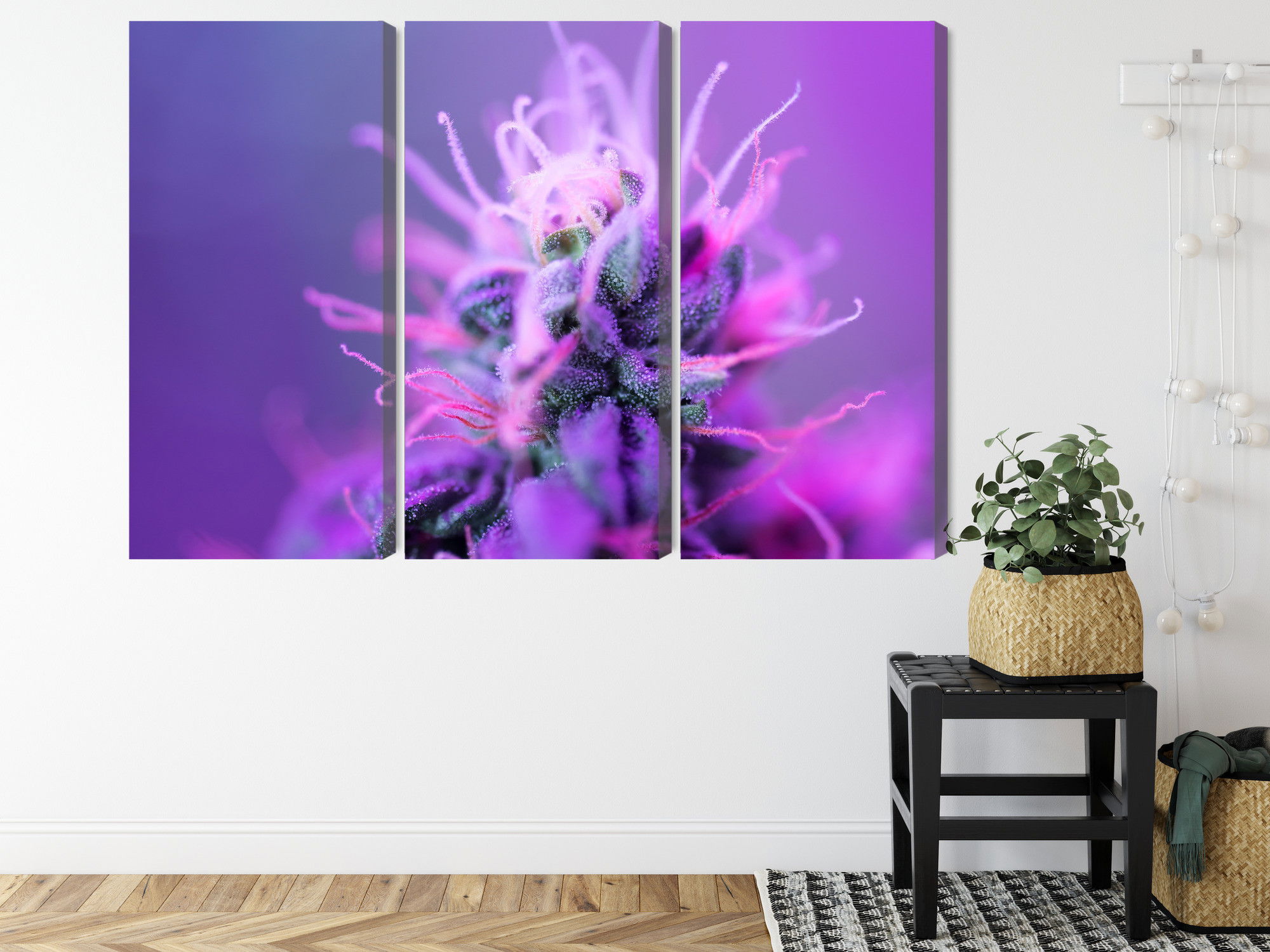 SilentDirects ljuddämpande tavla Macro plant on a pink-purple kombinerar ett högupplöst motiv med avancerad akustikteknik. Varje tavla monteras i Sverige och bygger på en stabil canvastavla med fururam, där insidan av ramen fylls med en ljudabsorberande kärna av återvunnen polyester. Konstruktionen gör tavlan till ett både estetiskt och funktionellt inslag i rummet.