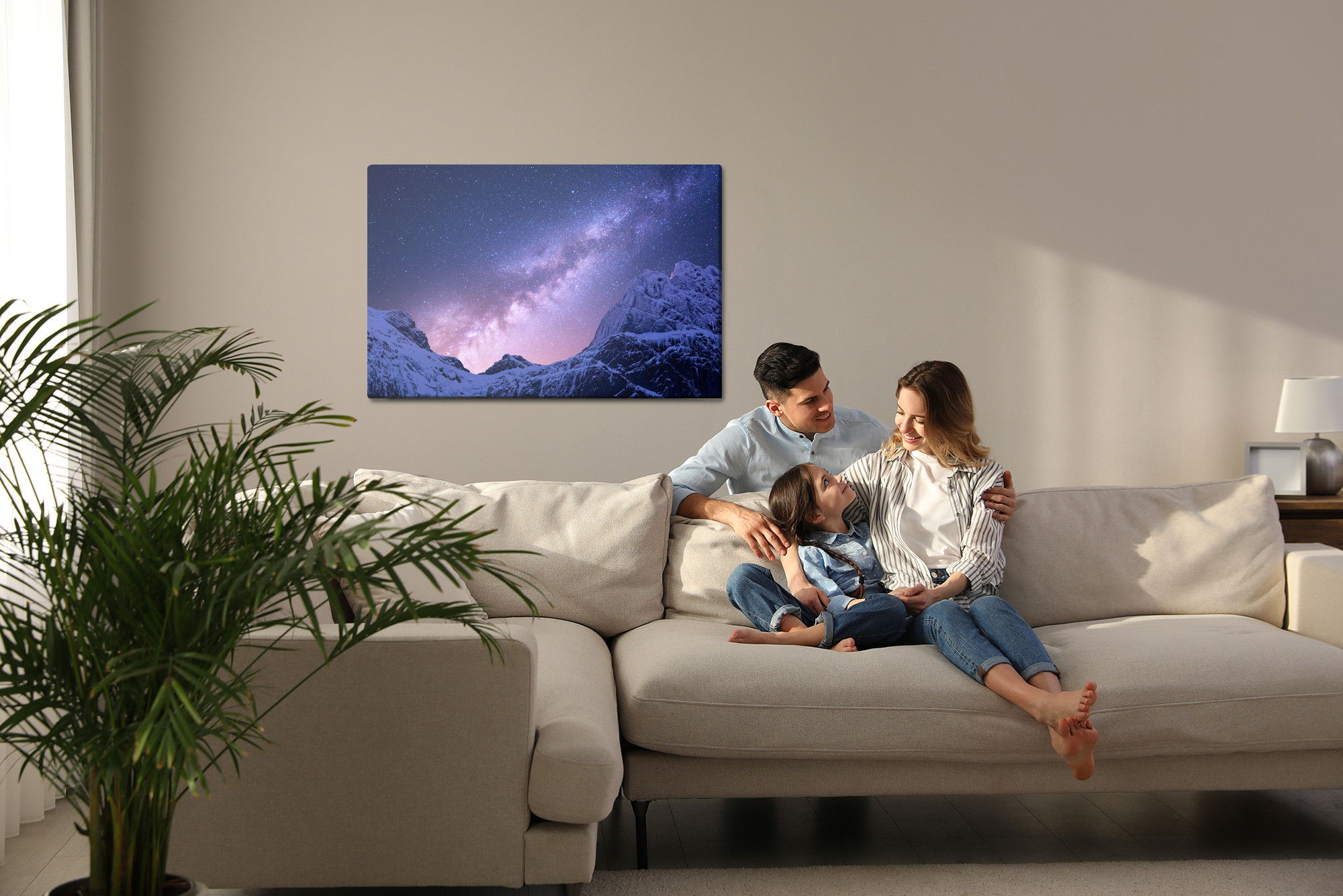 Varje tavla monteras på en massiv fururam. Format upp till 70×50 cm har en ram på 15 mm, medan format från 90×60 cm och uppåt har en ram på 20 mm. Den exakta dukspänningen gör att tavlan håller sin form över tid. Motivet Milky way over snowy trycks runt hela ramen vilket ger ett stilrent galleriuttryck där tavlan är lika vacker från sidan som framifrån. Kombinationen av rak dukspänning, rena linjer och korrekt tryck ger en professionell finish.