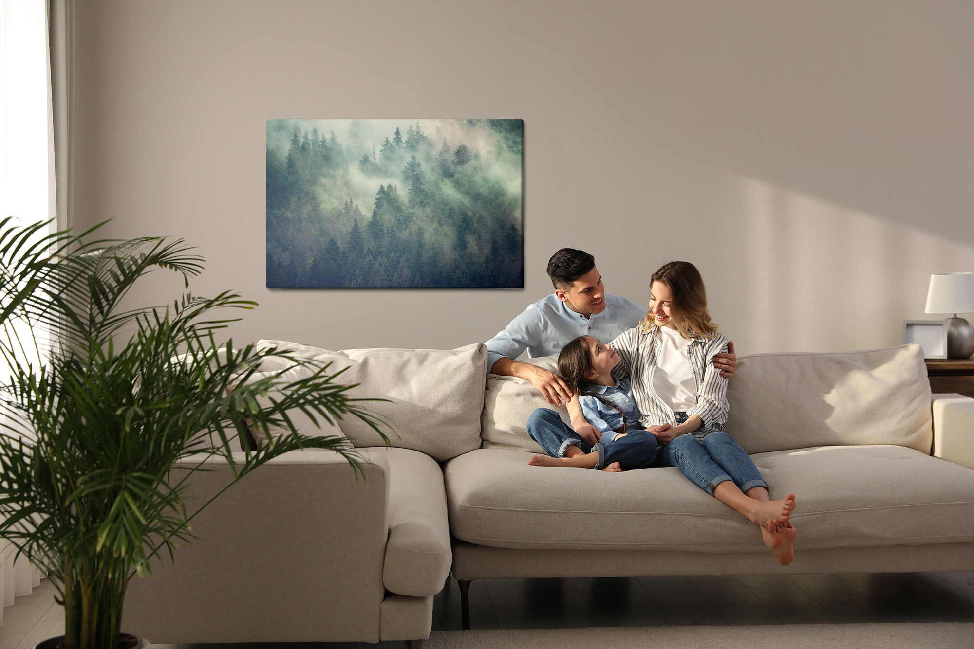 Motivet Misty landscape with fir återges med hög färgprecision och detaljrikedom tack vare HP Latex-teknologi. Trycket sker med vattenbaserade, luktfria och GREENGUARD Gold-certifierade bläck som ger en upplösning på upp till 300 DPI. Färgerna är UV-beständiga och behåller sin styrka även i ljusa rum, vilket gör tavlan lämplig för både hem- och offentliga miljöer.