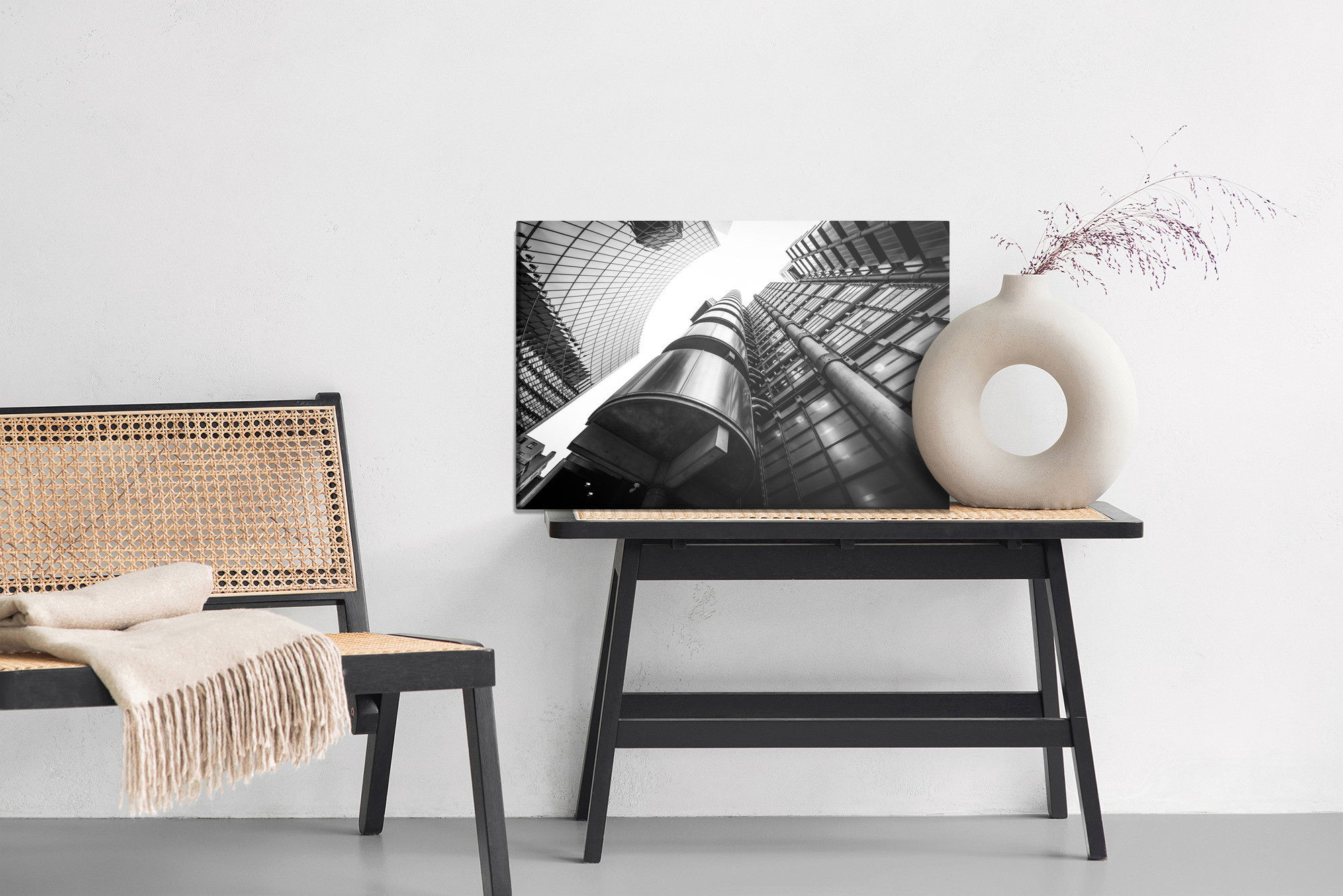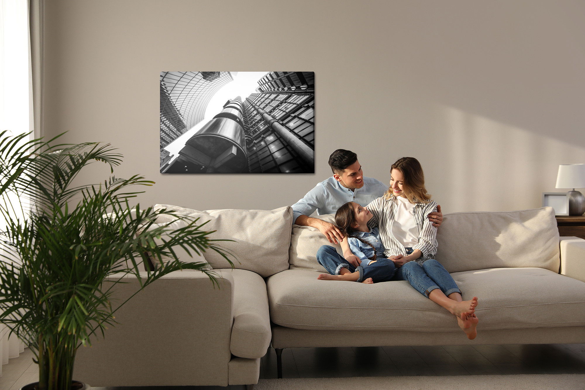 Varje tavla monteras på en massiv fururam. Format upp till 70×50 cm har en ram på 15 mm, medan format från 90×60 cm och uppåt har en ram på 20 mm. Den exakta dukspänningen gör att tavlan håller sin form över tid. Motivet Modern skyscrapers trycks runt hela ramen vilket ger ett stilrent galleriuttryck där tavlan är lika vacker från sidan som framifrån. Kombinationen av rak dukspänning, rena linjer och korrekt tryck ger en professionell finish.