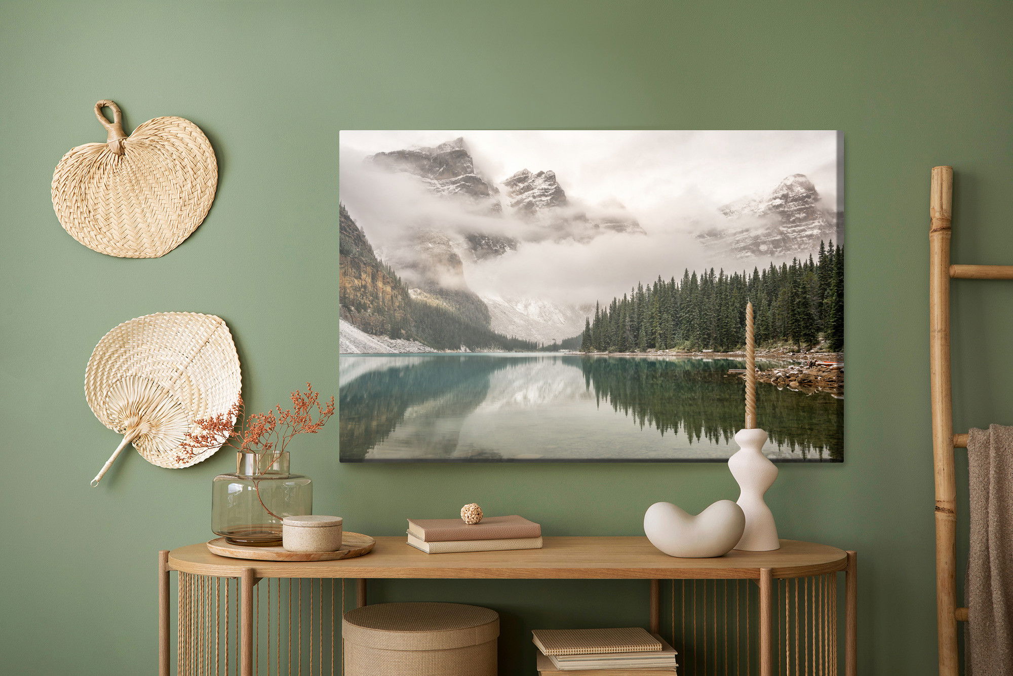 Varje tavla monteras på en massiv fururam. Format upp till 70×50 cm har en ram på 15 mm, medan format från 90×60 cm och uppåt har en ram på 20 mm. Den exakta dukspänningen gör att tavlan håller sin form över tid. Motivet Moraine Lake, Canada trycks runt hela ramen vilket ger ett stilrent galleriuttryck där tavlan är lika vacker från sidan som framifrån. Kombinationen av rak dukspänning, rena linjer och korrekt tryck ger en professionell finish.