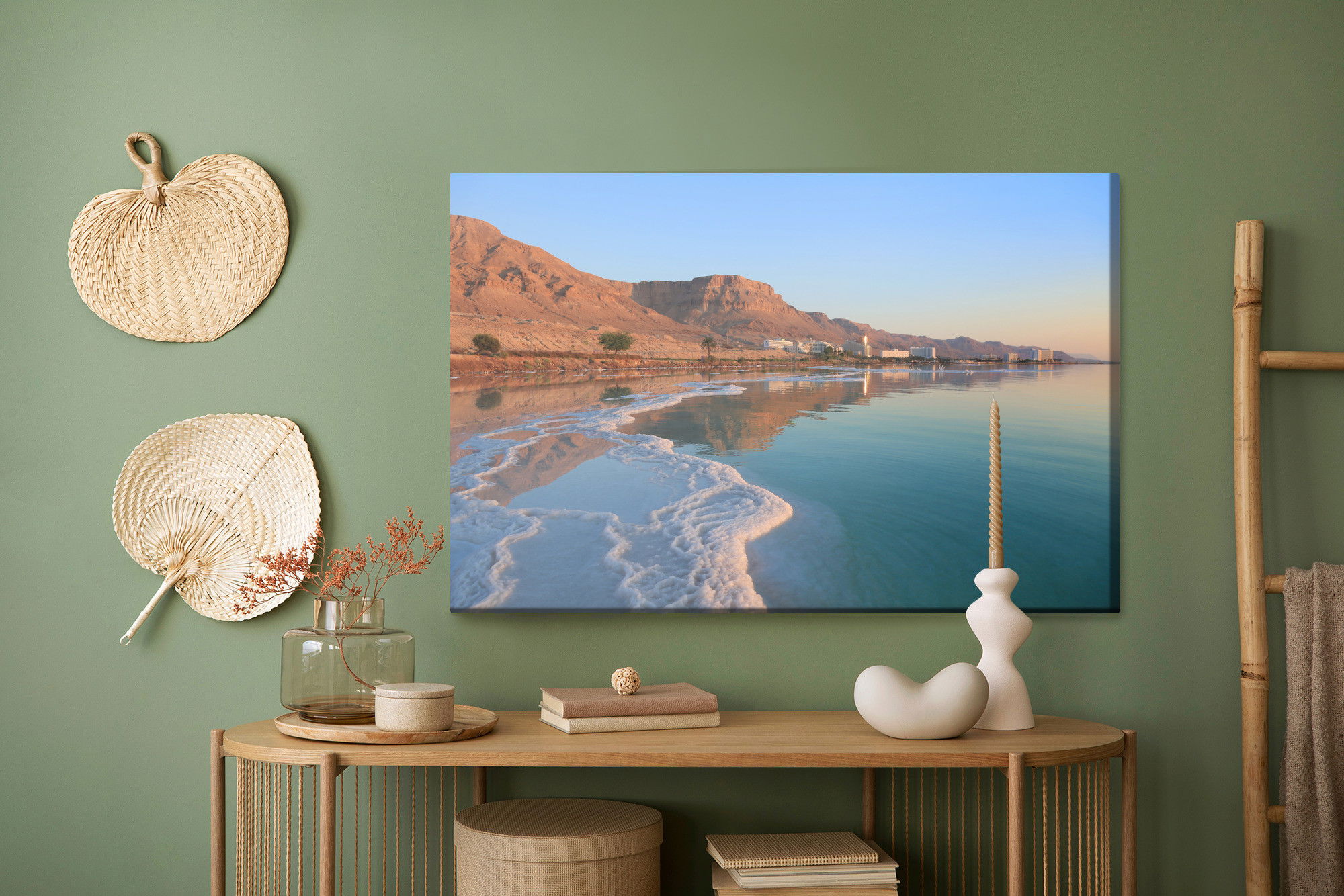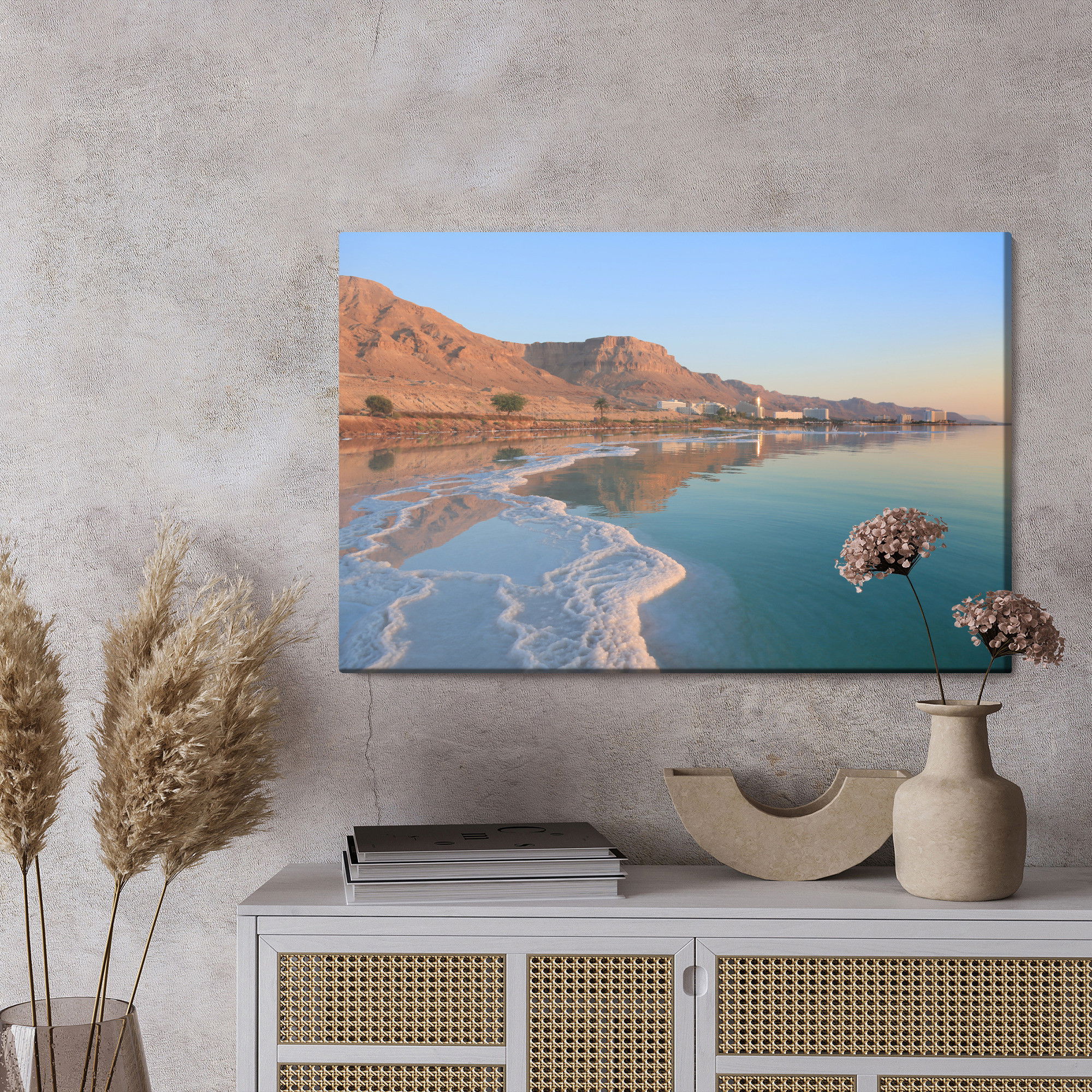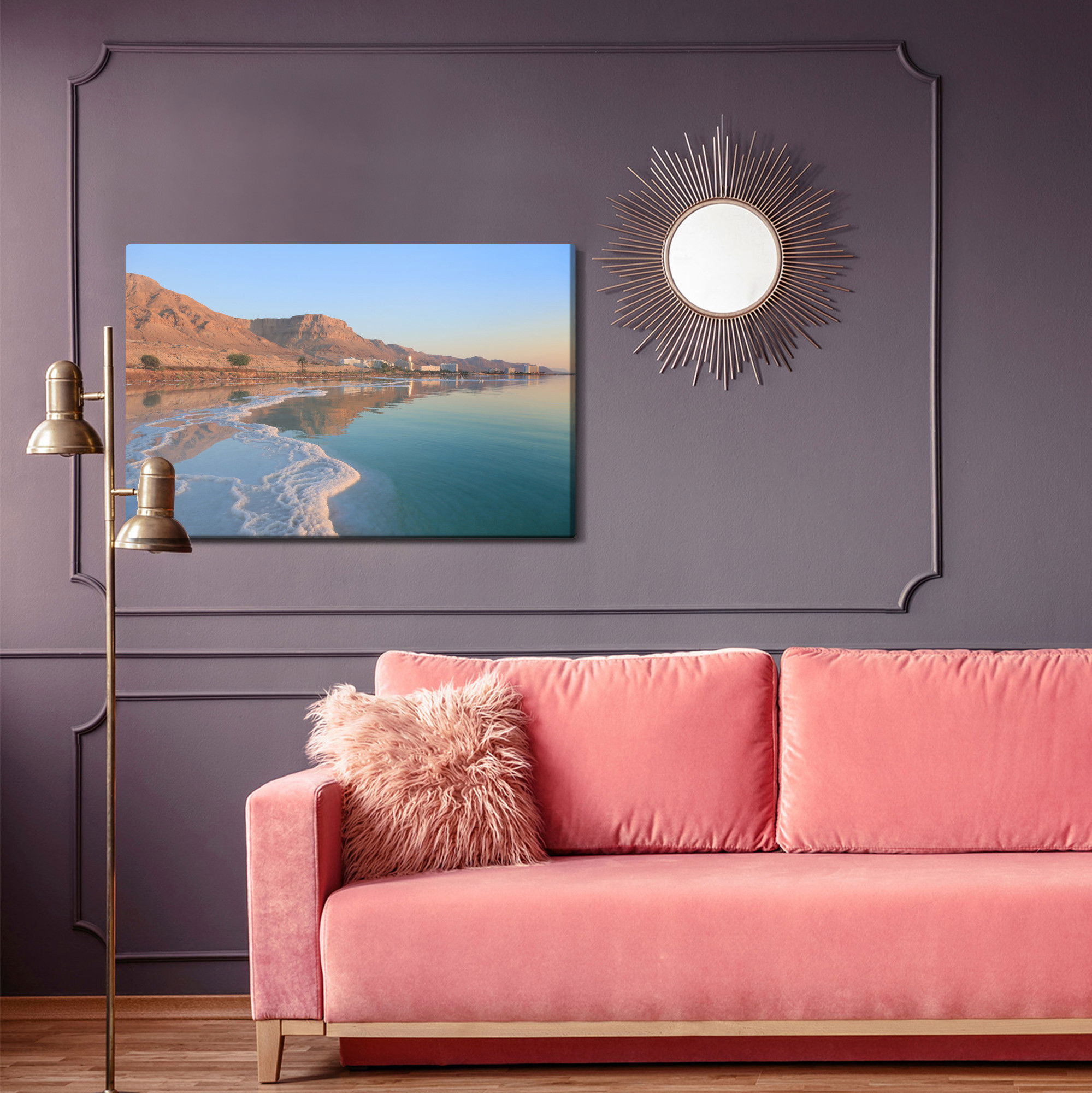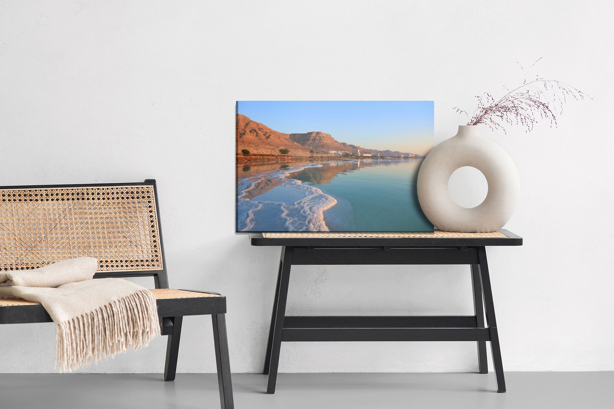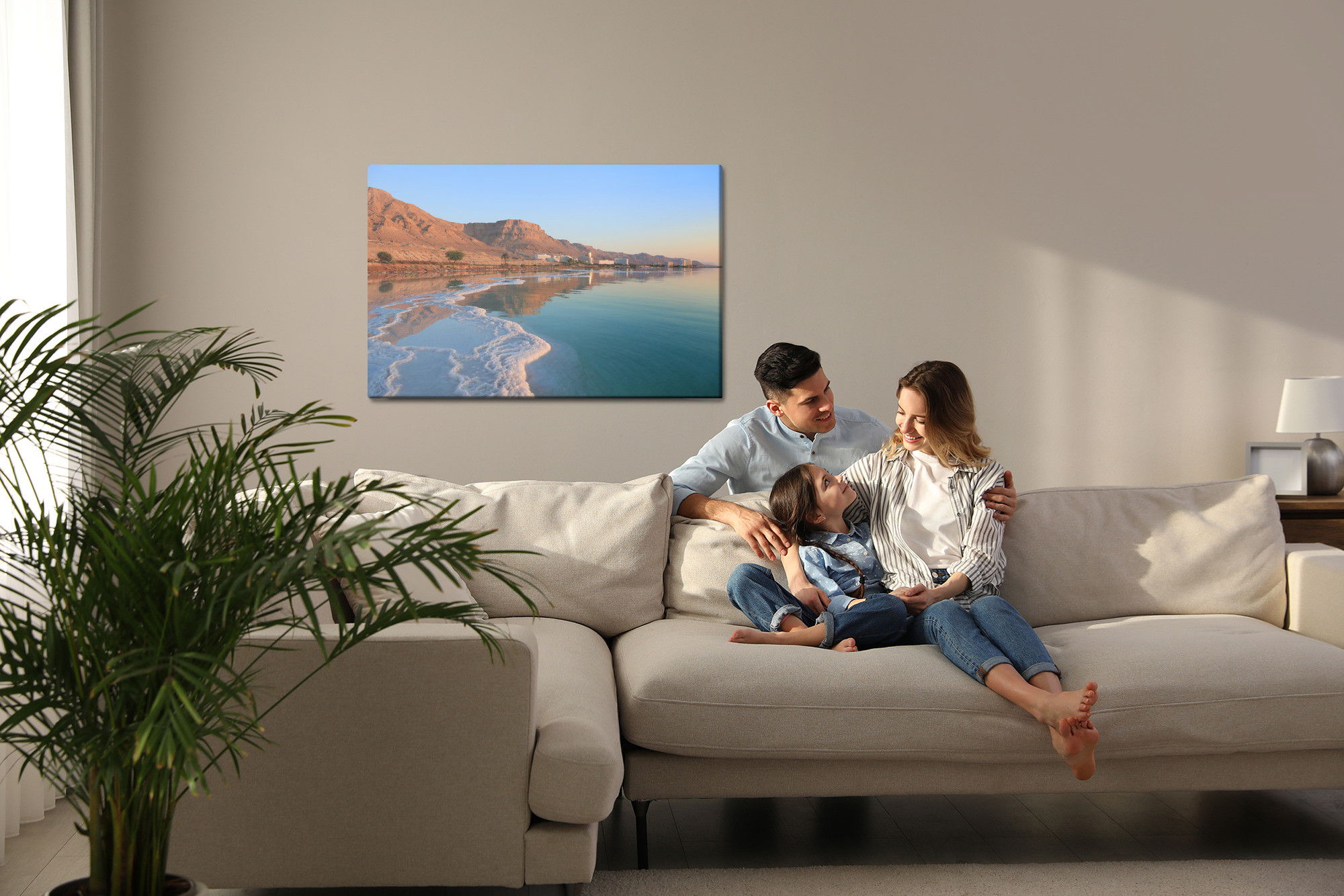 Varje tavla monteras på en massiv fururam. Format upp till 70×50 cm har en ram på 15 mm, medan format från 90×60 cm och uppåt har en ram på 20 mm. Den exakta dukspänningen gör att tavlan håller sin form över tid. Motivet Mountain landscape by the sea trycks runt hela ramen vilket ger ett stilrent galleriuttryck där tavlan är lika vacker från sidan som framifrån. Kombinationen av rak dukspänning, rena linjer och korrekt tryck ger en professionell finish.