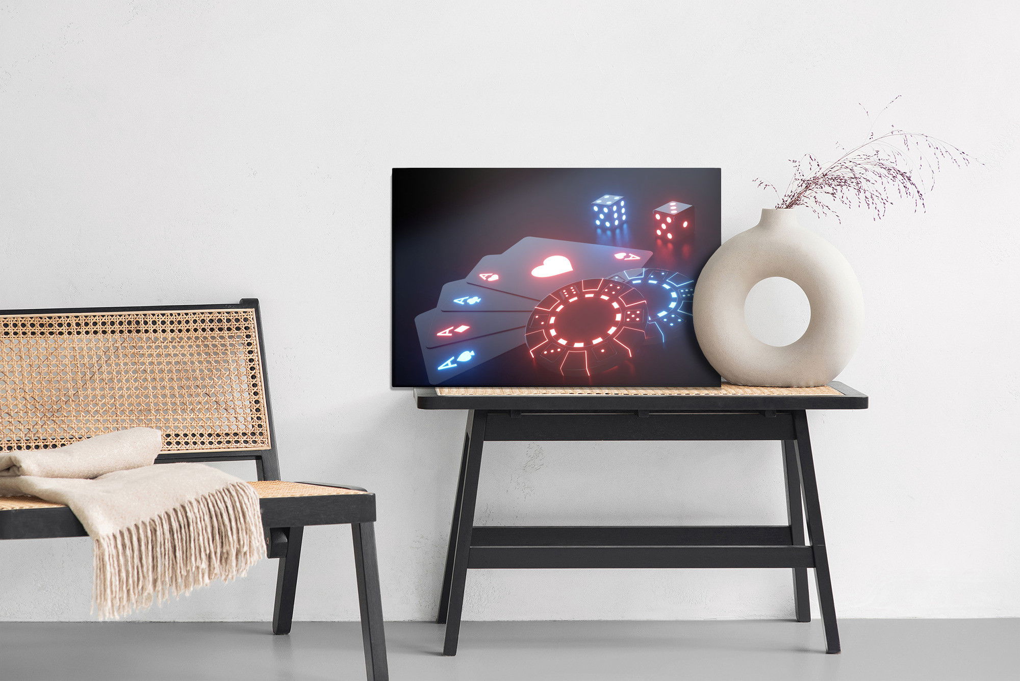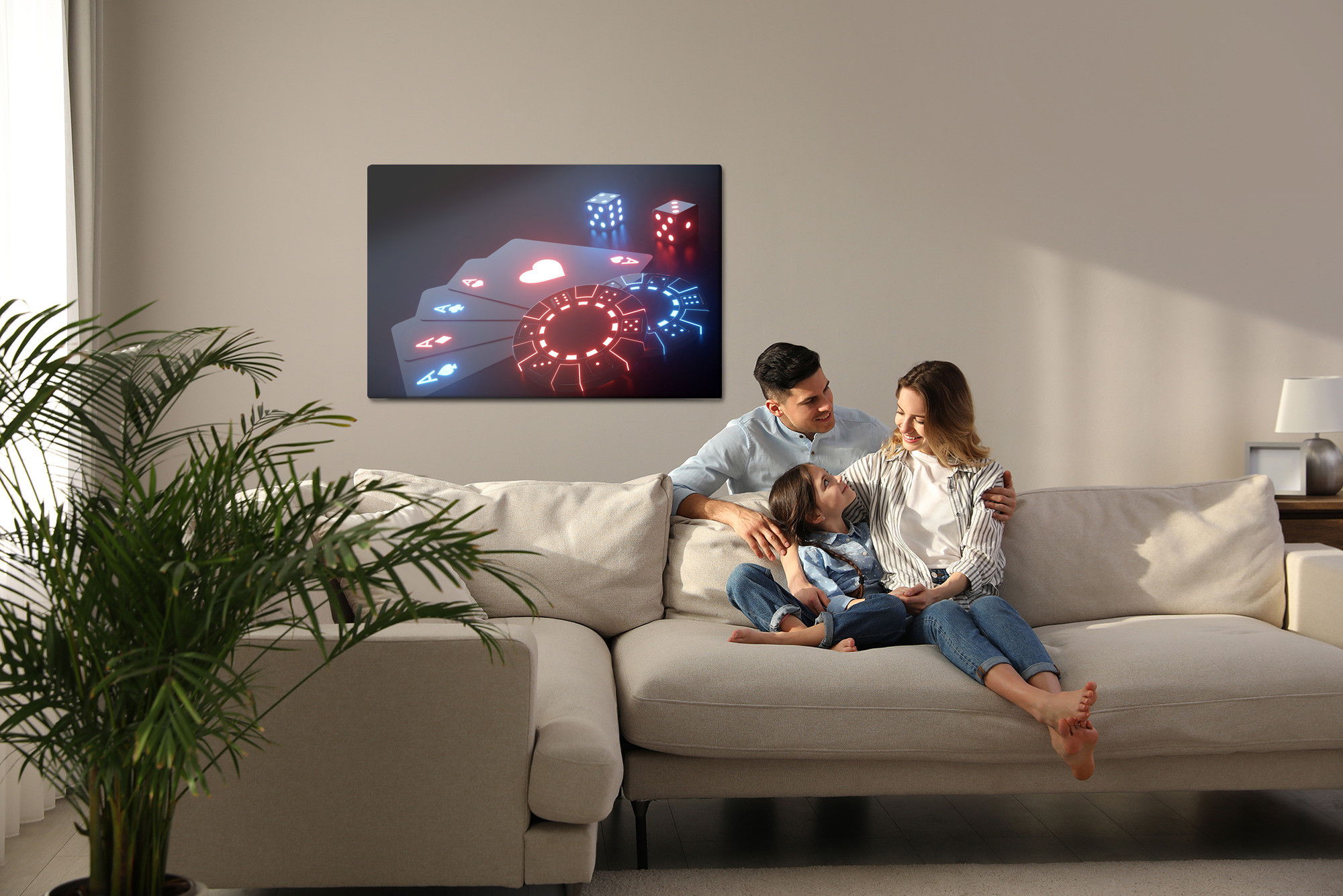 Varje tavla monteras på en massiv fururam. Format upp till 70×50 cm har en ram på 15 mm, medan format från 90×60 cm och uppåt har en ram på 20 mm. Den exakta dukspänningen gör att tavlan håller sin form över tid. Motivet Neon game set trycks runt hela ramen vilket ger ett stilrent galleriuttryck där tavlan är lika vacker från sidan som framifrån. Kombinationen av rak dukspänning, rena linjer och korrekt tryck ger en professionell finish.