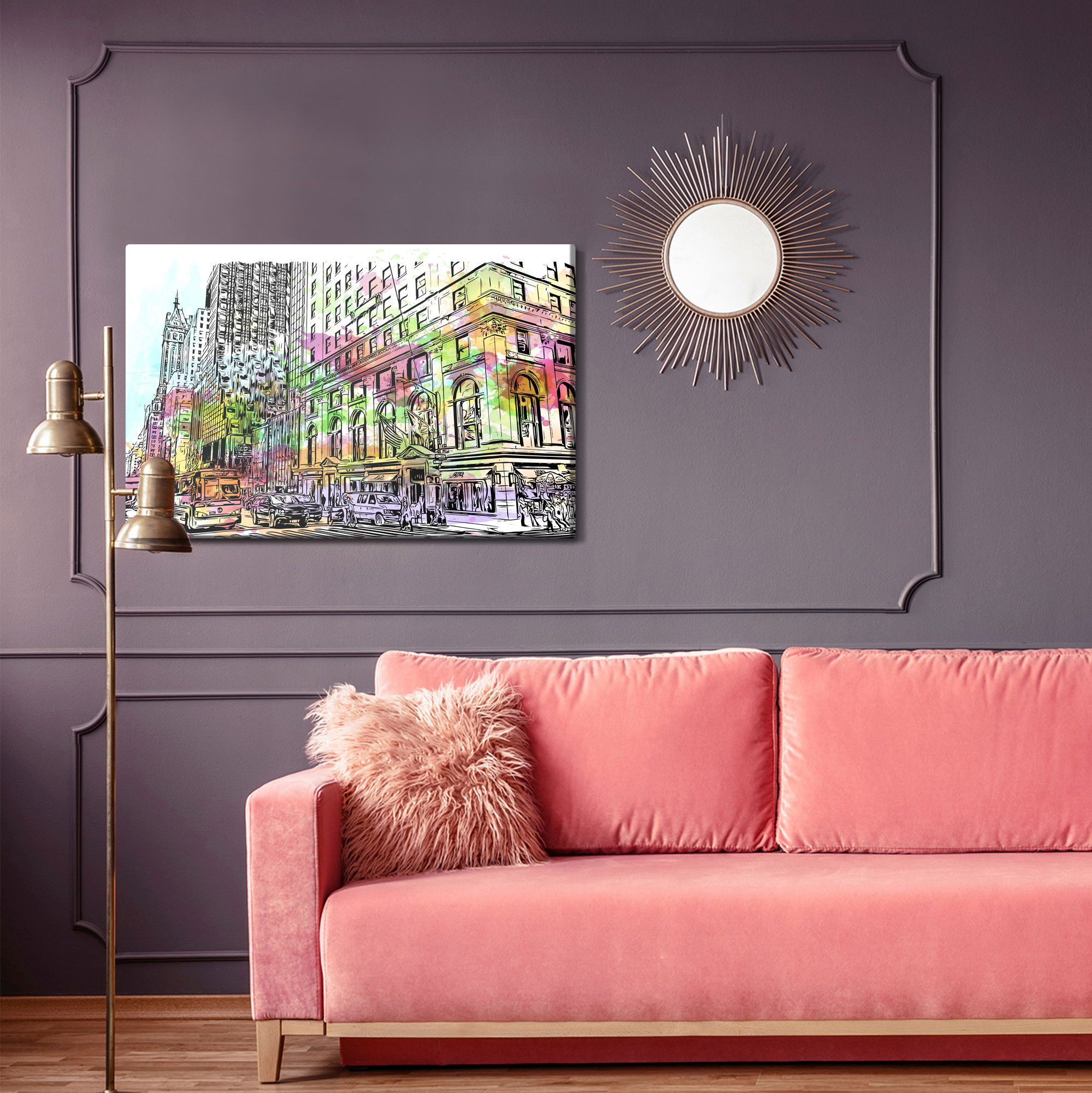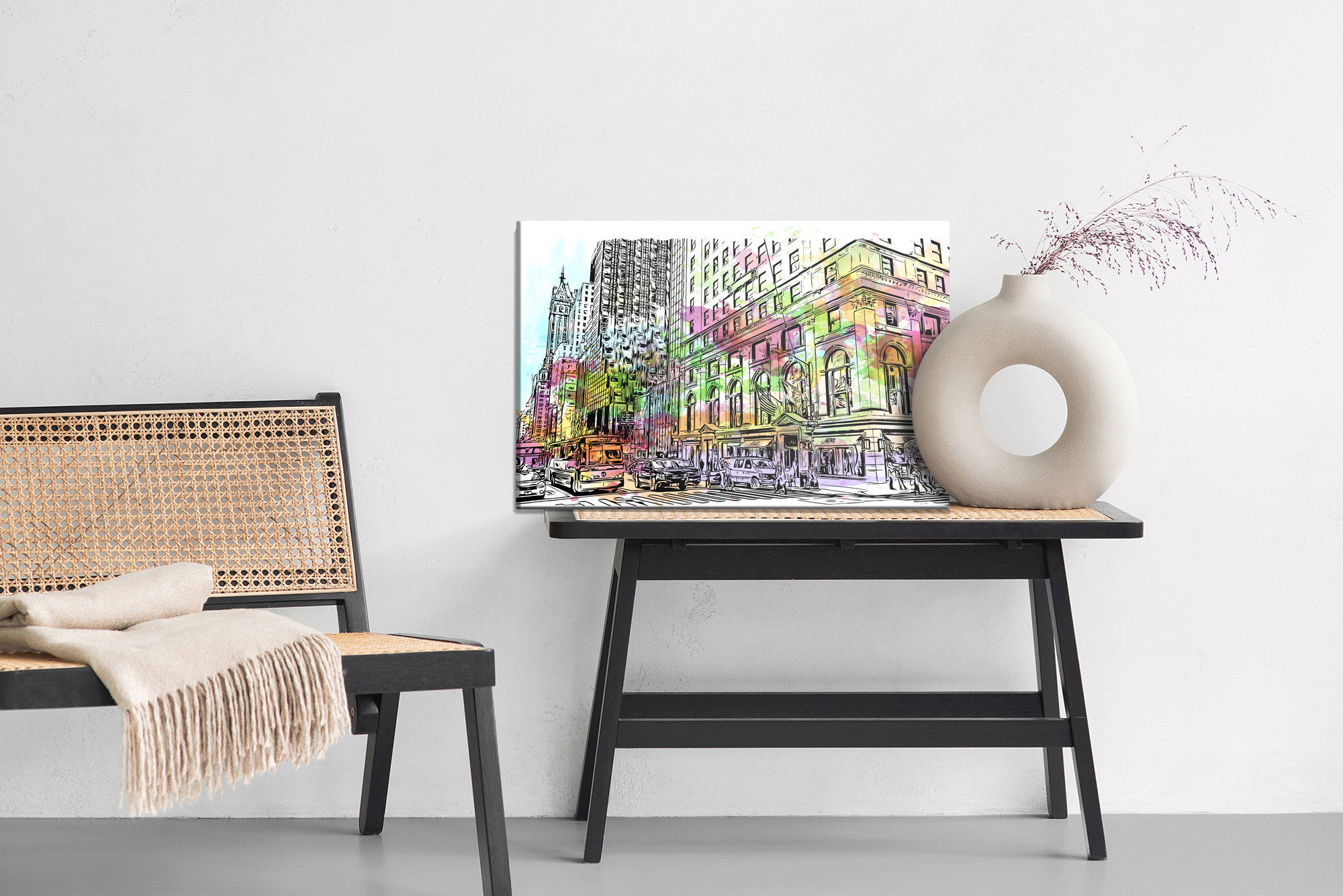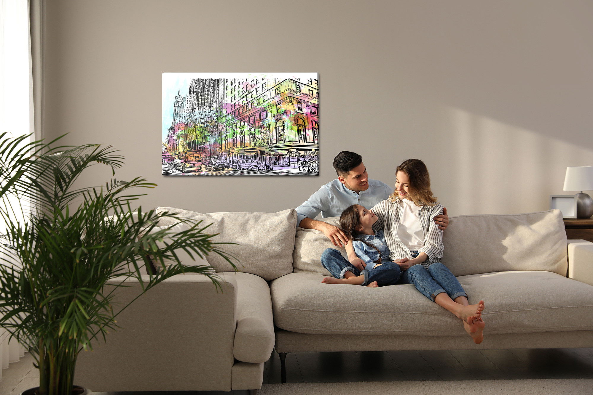 Motivet New York city buildings återges med hög färgprecision och detaljrikedom tack vare HP Latex-teknologi. Trycket sker med vattenbaserade, luktfria och GREENGUARD Gold-certifierade bläck som ger en upplösning på upp till 300 DPI. Färgerna är UV-beständiga och behåller sin styrka även i ljusa rum, vilket gör tavlan lämplig för både hem- och offentliga miljöer.