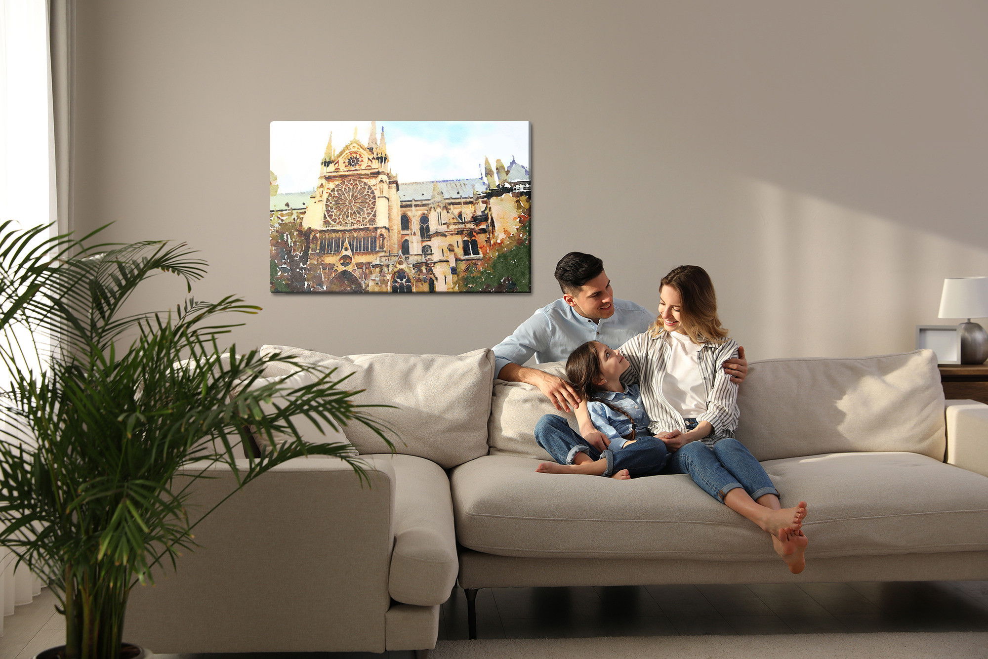 Motivet Notre dame cathedral as återges med hög färgprecision och detaljrikedom tack vare HP Latex-teknologi. Trycket sker med vattenbaserade, luktfria och GREENGUARD Gold-certifierade bläck som ger en upplösning på upp till 300 DPI. Färgerna är UV-beständiga och behåller sin styrka även i ljusa rum, vilket gör tavlan lämplig för både hem- och offentliga miljöer.