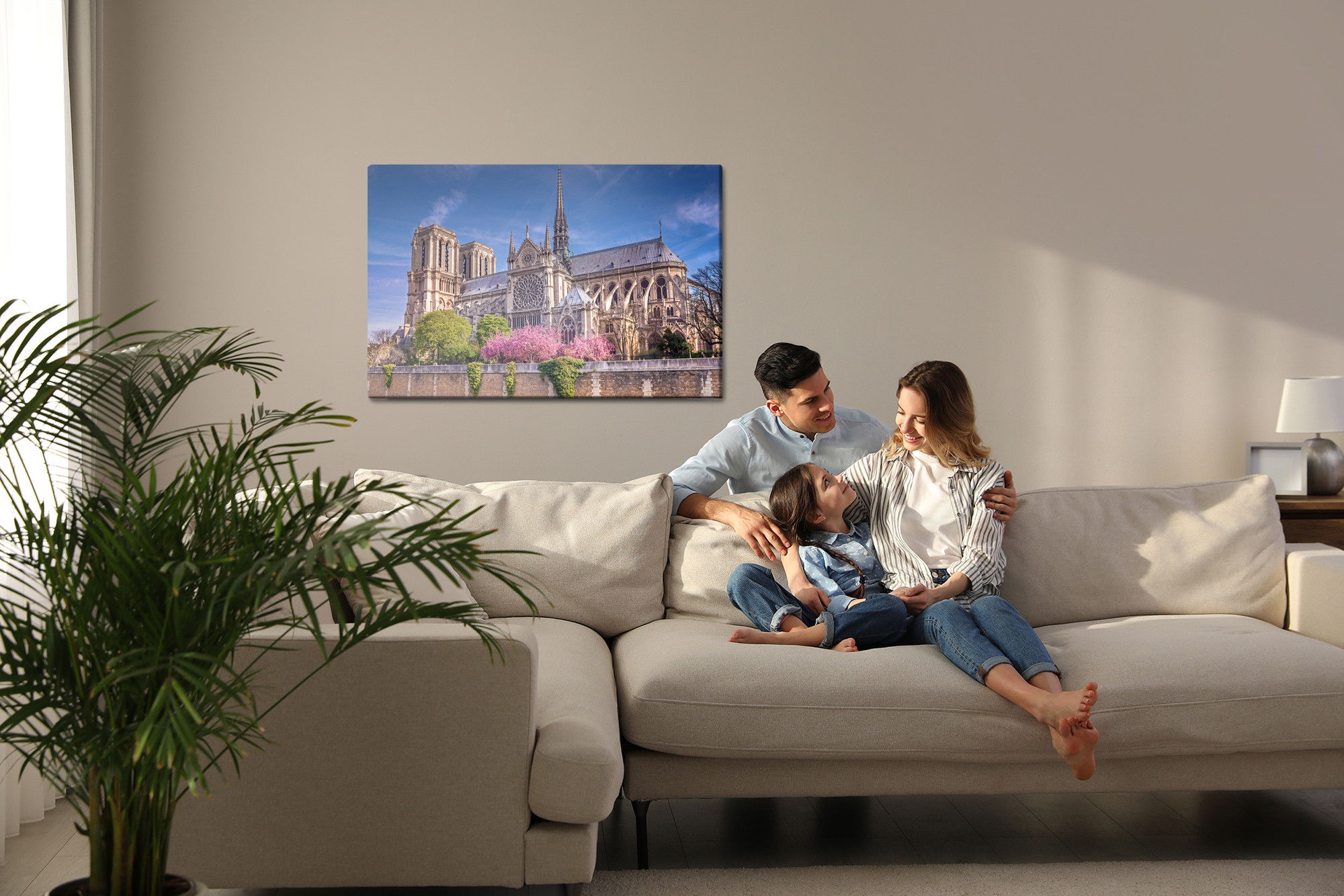 Varje tavla monteras på en massiv fururam. Format upp till 70×50 cm har en ram på 15 mm, medan format från 90×60 cm och uppåt har en ram på 20 mm. Den exakta dukspänningen gör att tavlan håller sin form över tid. Motivet Notre dame cathedral, Paris trycks runt hela ramen vilket ger ett stilrent galleriuttryck där tavlan är lika vacker från sidan som framifrån. Kombinationen av rak dukspänning, rena linjer och korrekt tryck ger en professionell finish.