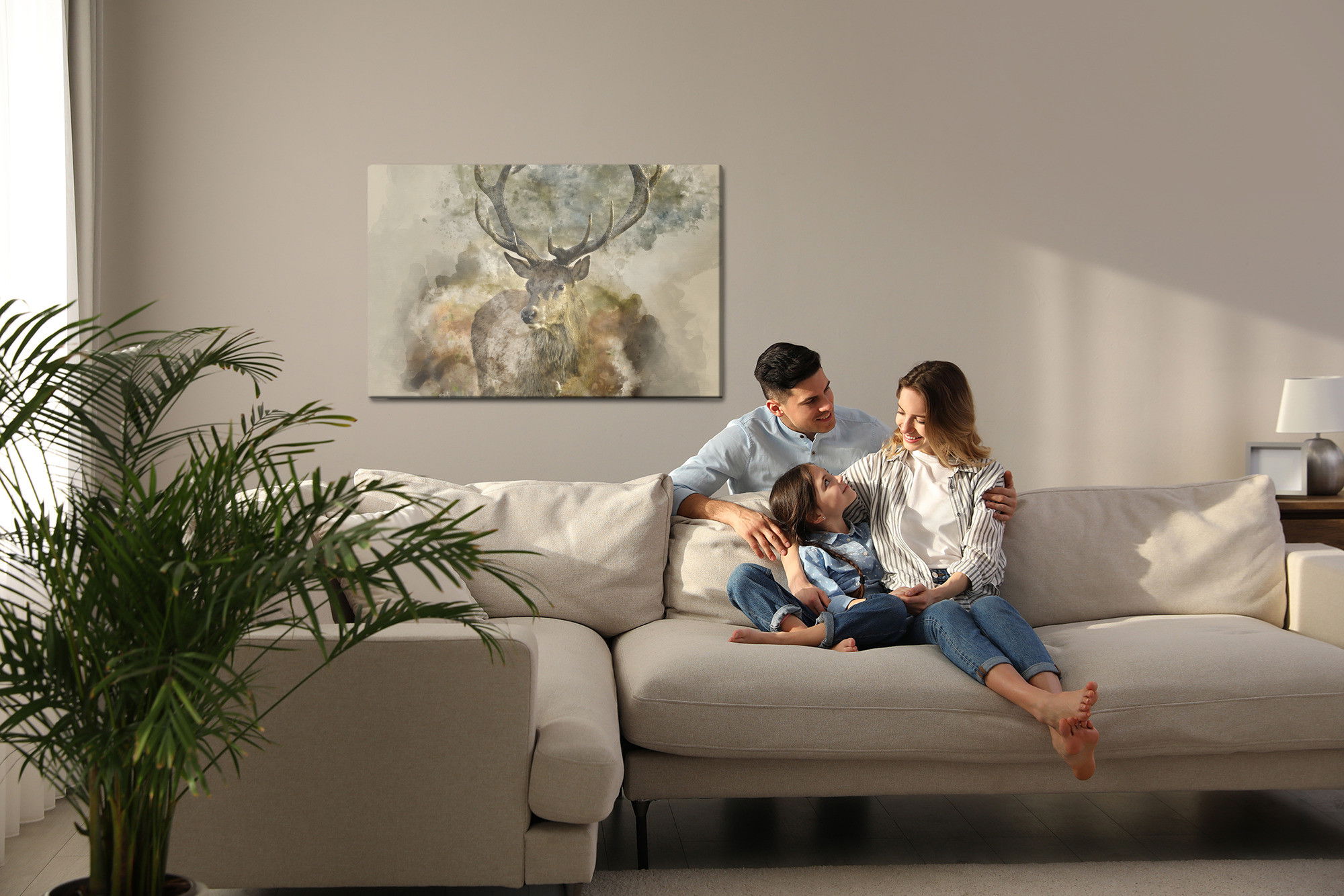 Motivet Of abstract deer in brown återges med hög färgprecision och detaljrikedom tack vare HP Latex-teknologi. Trycket sker med vattenbaserade, luktfria och GREENGUARD Gold-certifierade bläck som ger en upplösning på upp till 300 DPI. Färgerna är UV-beständiga och behåller sin styrka även i ljusa rum, vilket gör tavlan lämplig för både hem- och offentliga miljöer.