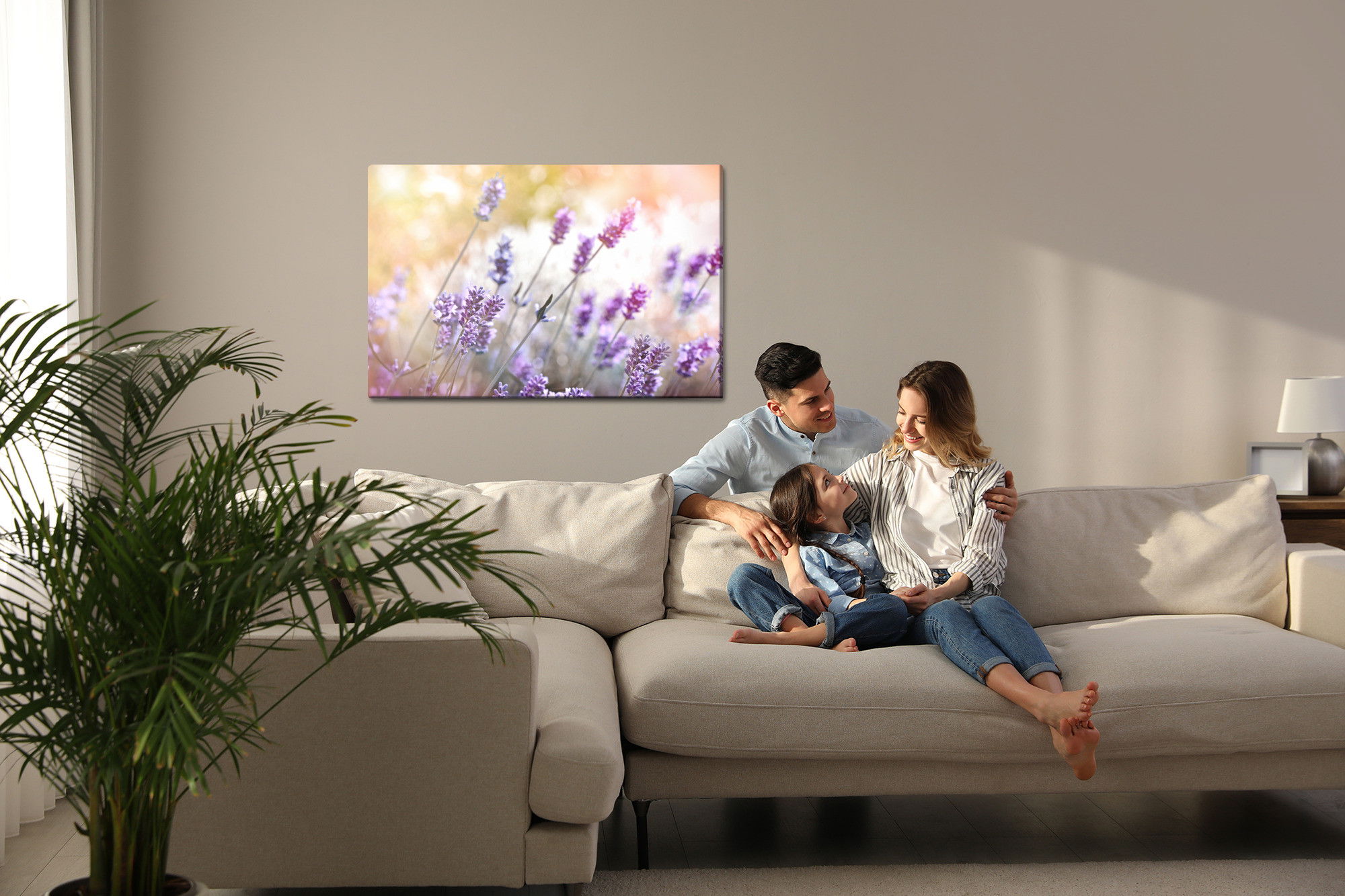 Varje tavla monteras på en massiv fururam. Format upp till 70×50 cm har en ram på 15 mm, medan format från 90×60 cm och uppåt har en ram på 20 mm. Den exakta dukspänningen gör att tavlan håller sin form över tid. Motivet Of flowering lavender trycks runt hela ramen vilket ger ett stilrent galleriuttryck där tavlan är lika vacker från sidan som framifrån. Kombinationen av rak dukspänning, rena linjer och korrekt tryck ger en professionell finish.