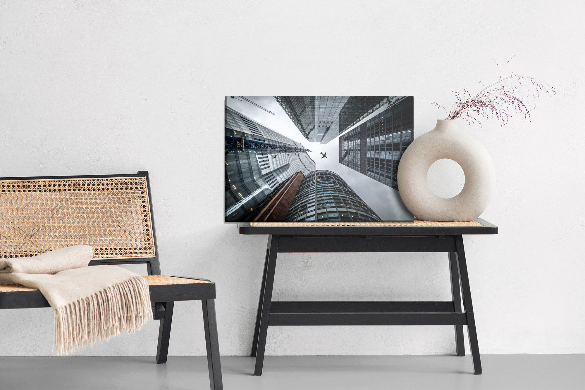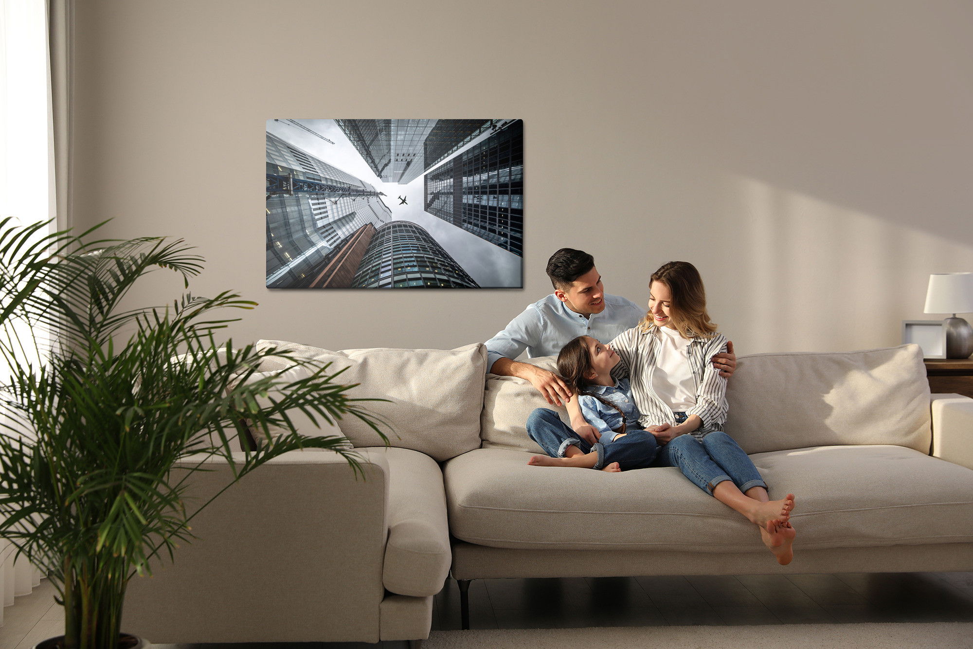 Varje tavla monteras på en massiv fururam. Format upp till 70×50 cm har en ram på 15 mm, medan format från 90×60 cm och uppåt har en ram på 20 mm. Den exakta dukspänningen gör att tavlan håller sin form över tid. Motivet Of London skyscrapers trycks runt hela ramen vilket ger ett stilrent galleriuttryck där tavlan är lika vacker från sidan som framifrån. Kombinationen av rak dukspänning, rena linjer och korrekt tryck ger en professionell finish.