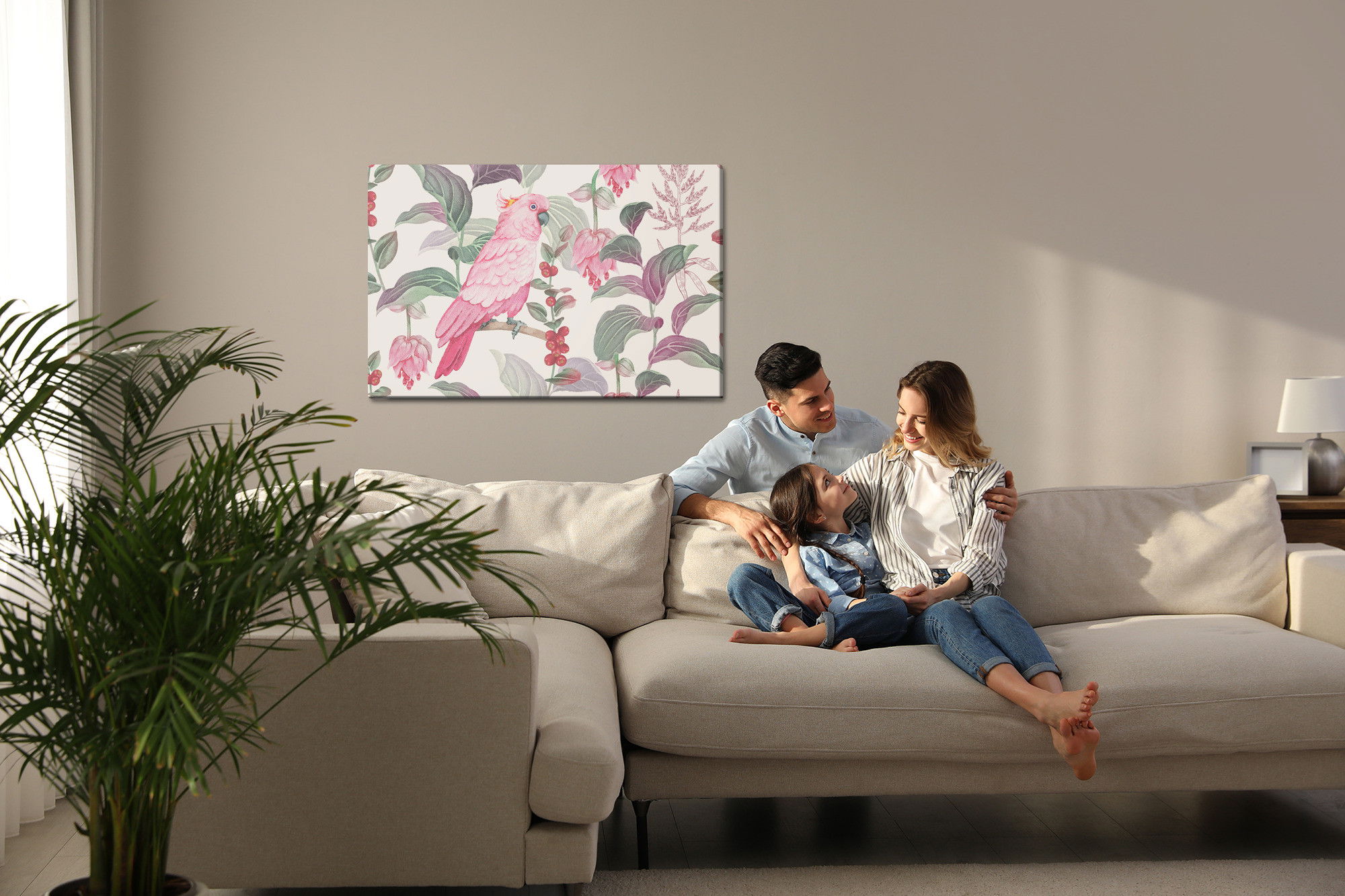 Varje tavla monteras på en massiv fururam. Format upp till 70×50 cm har en ram på 15 mm, medan format från 90×60 cm och uppåt har en ram på 20 mm. Den exakta dukspänningen gör att tavlan håller sin form över tid. Motivet Of tropical pink parrot trycks runt hela ramen vilket ger ett stilrent galleriuttryck där tavlan är lika vacker från sidan som framifrån. Kombinationen av rak dukspänning, rena linjer och korrekt tryck ger en professionell finish.