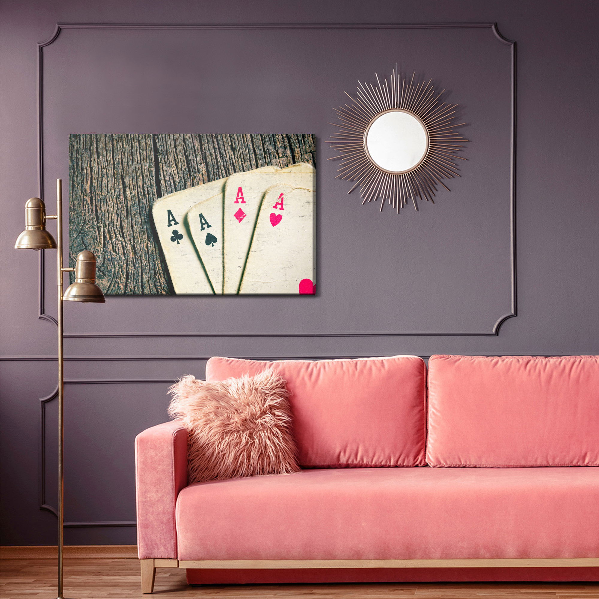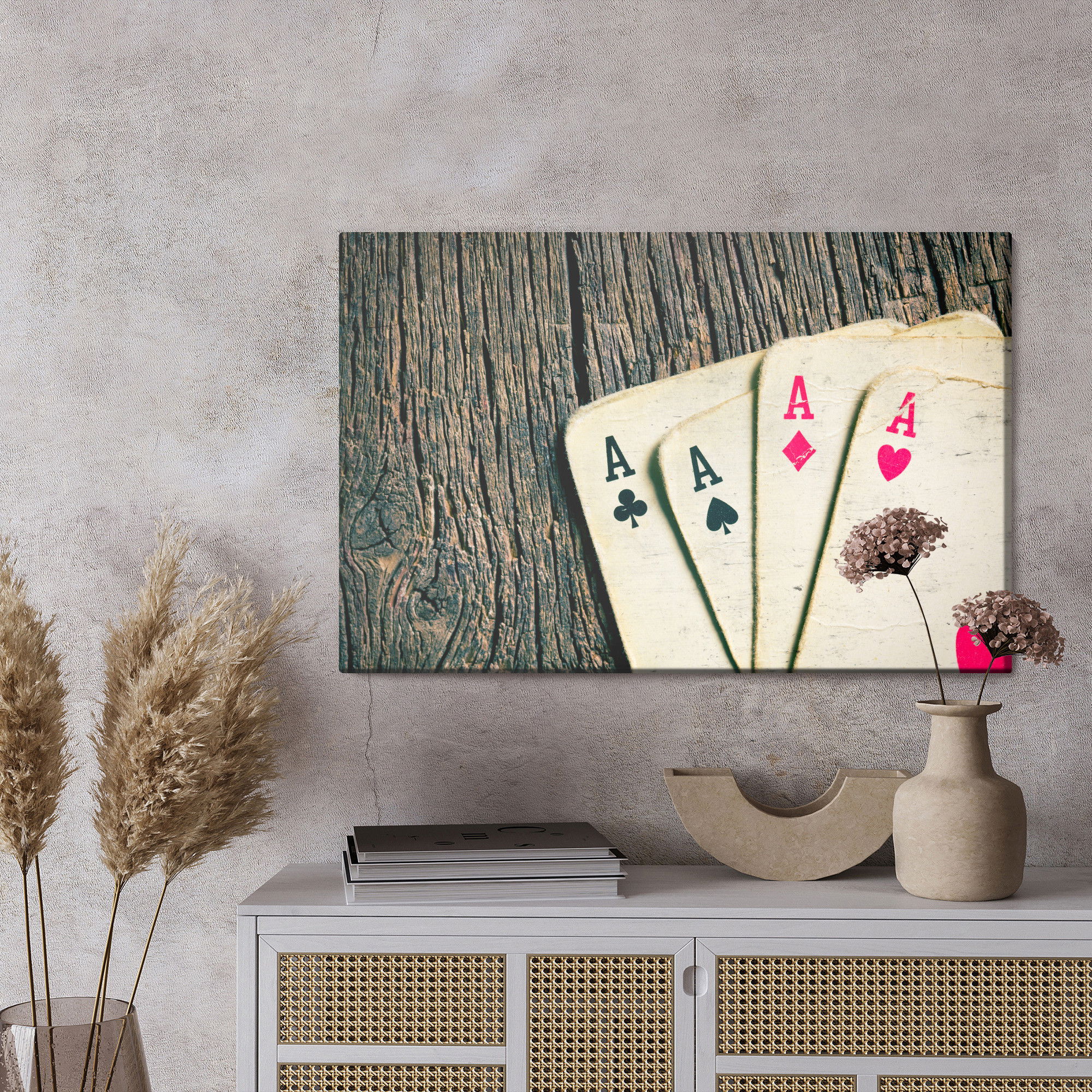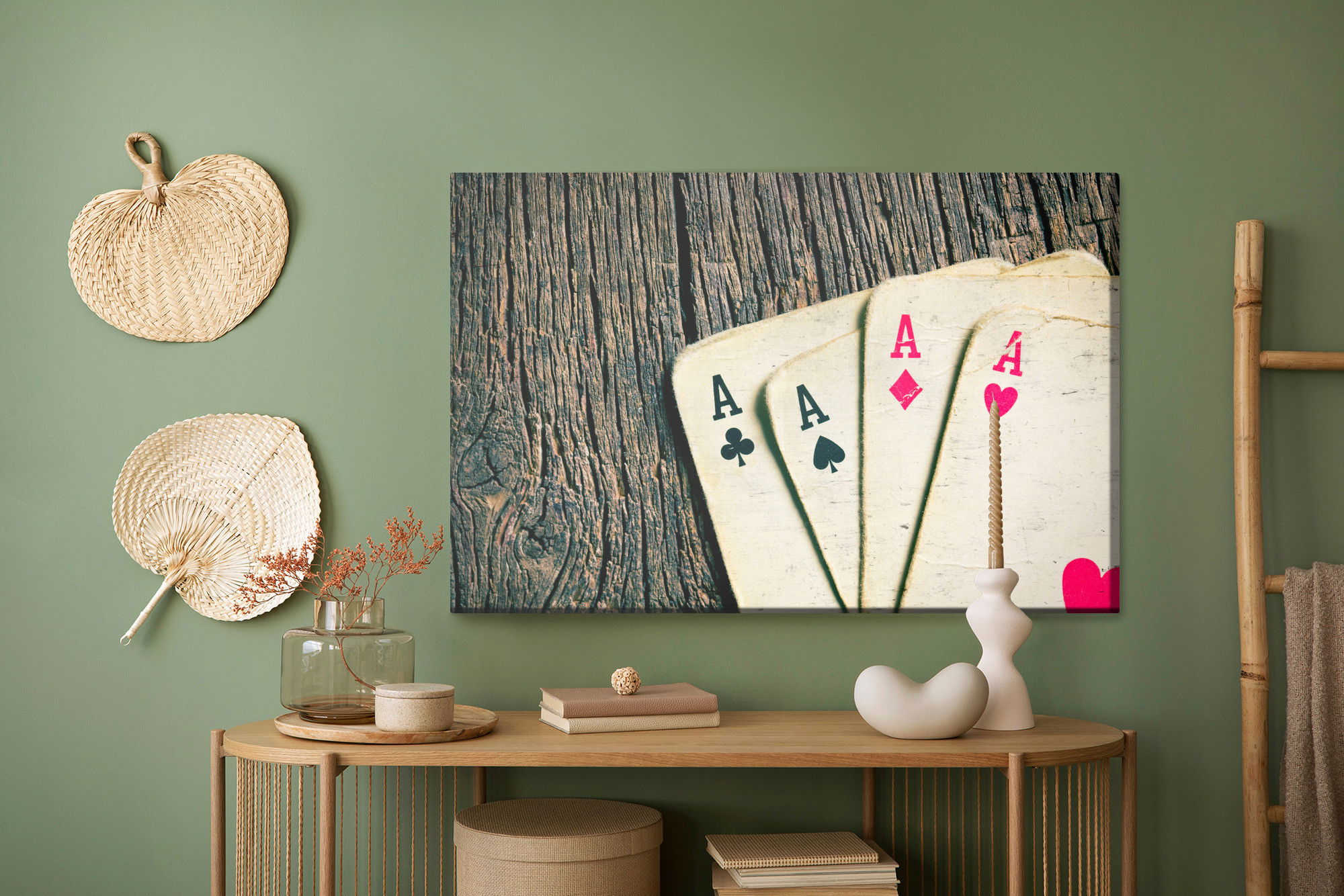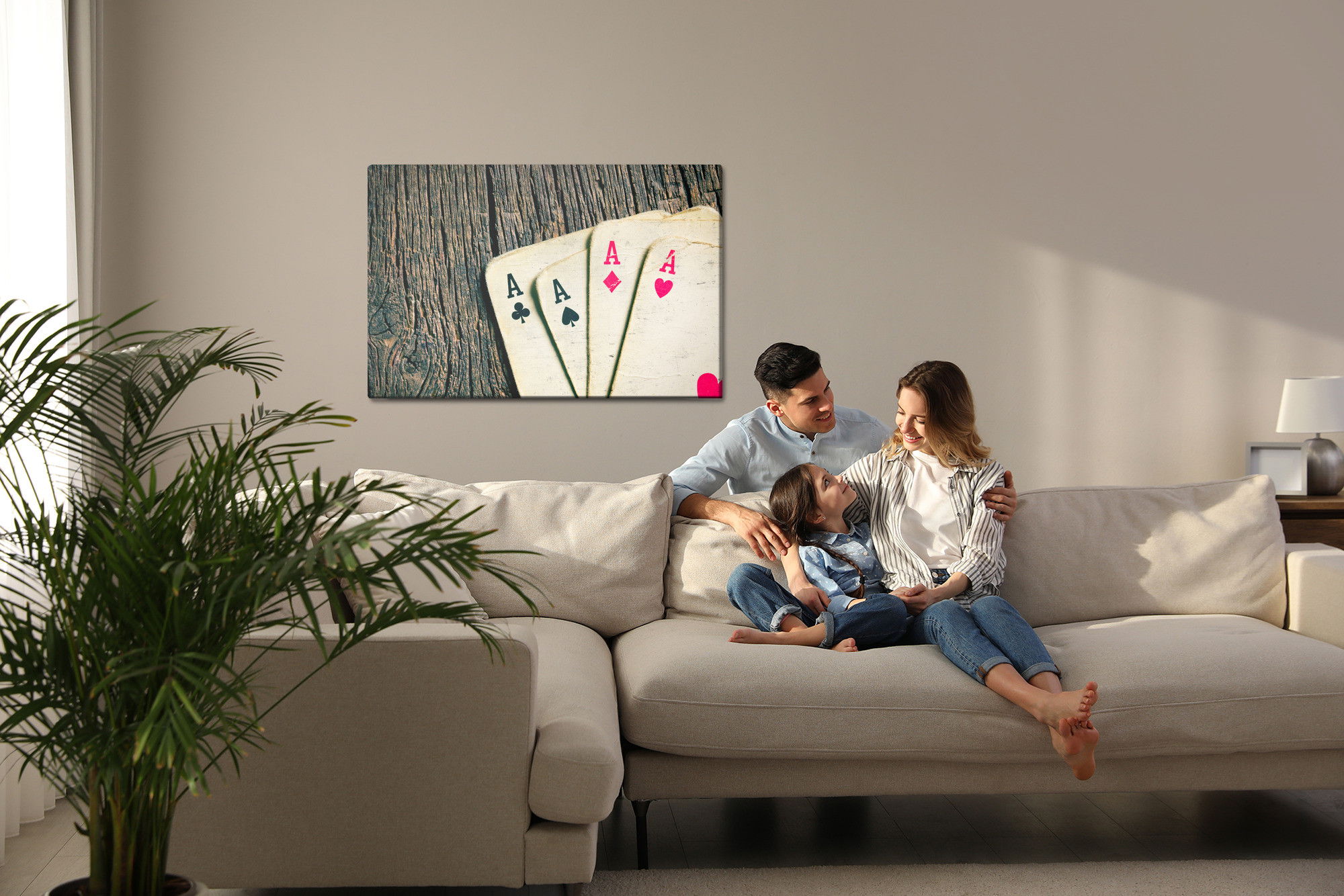 Varje tavla monteras på en massiv fururam. Format upp till 70×50 cm har en ram på 15 mm, medan format från 90×60 cm och uppåt har en ram på 20 mm. Den exakta dukspänningen gör att tavlan håller sin form över tid. Motivet Old cards on a wooden table trycks runt hela ramen vilket ger ett stilrent galleriuttryck där tavlan är lika vacker från sidan som framifrån. Kombinationen av rak dukspänning, rena linjer och korrekt tryck ger en professionell finish.
